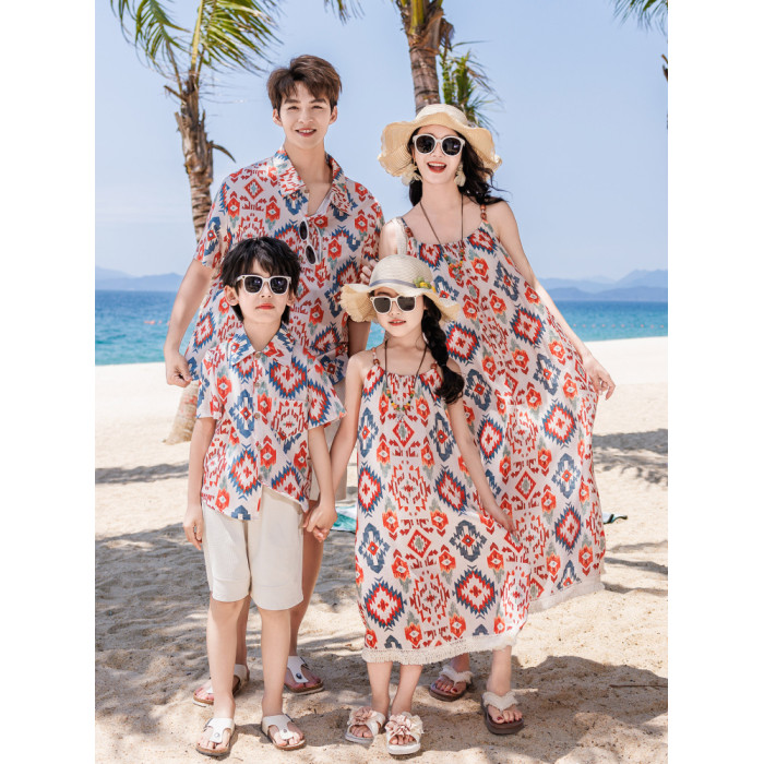度假親子裝一家三四口民族風旅遊海南西雙版納母女連衣裙襯衫套裝