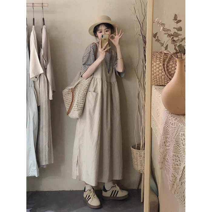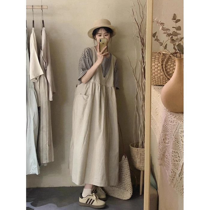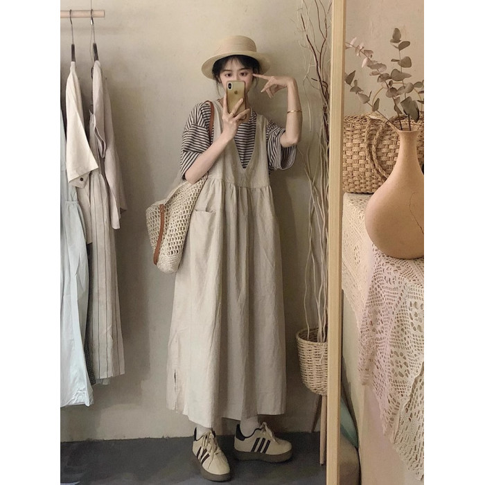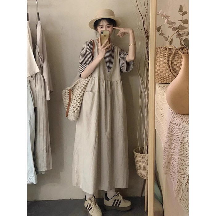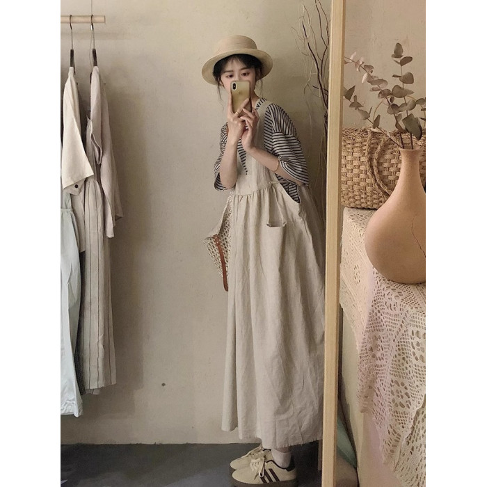 背帶裙女夏季2025新款日系工裝復古寬松連衣裙短袖條紋T恤兩件套