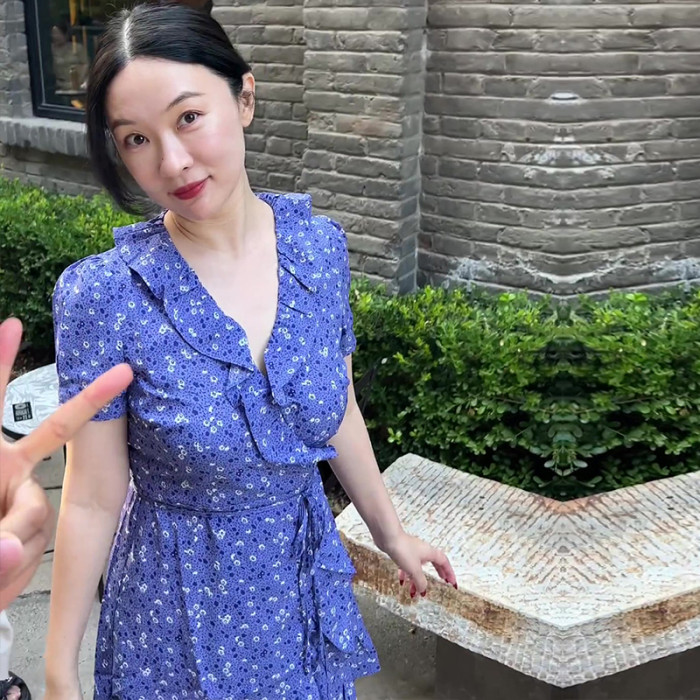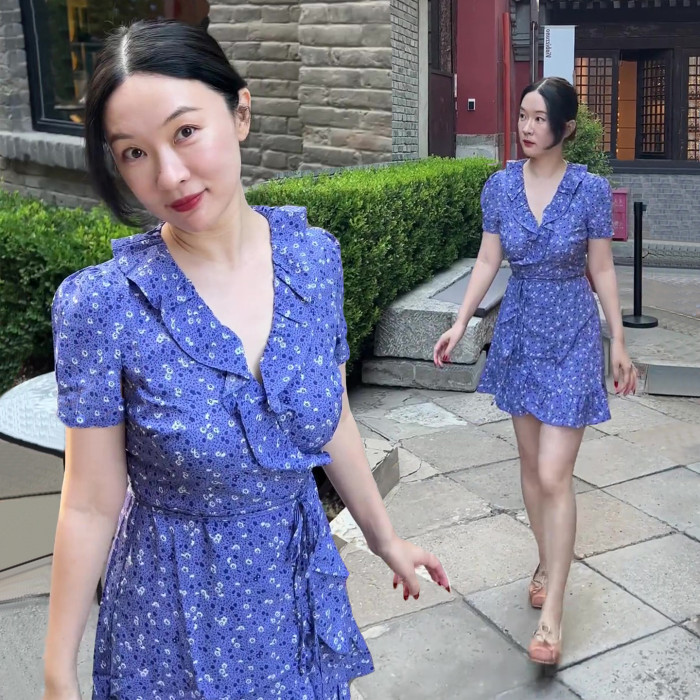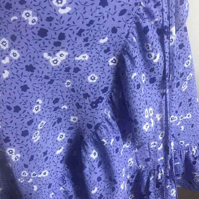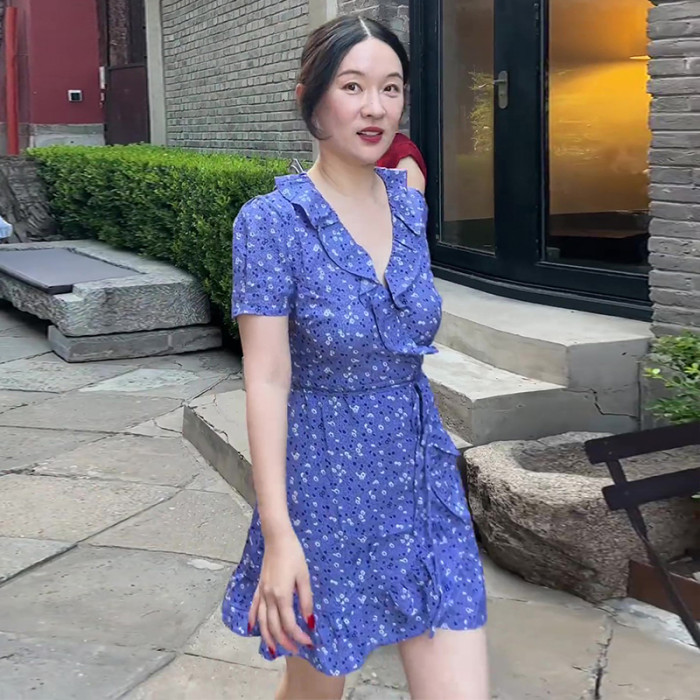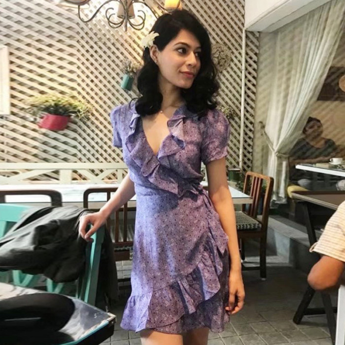 霍思燕同款紫色印花V領荷葉邊連衣裙女夏收腰顯瘦短裙子系帶裹裙