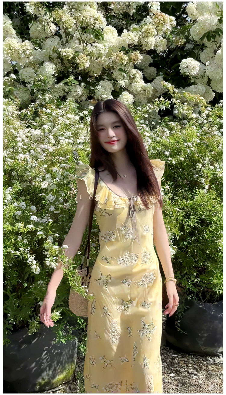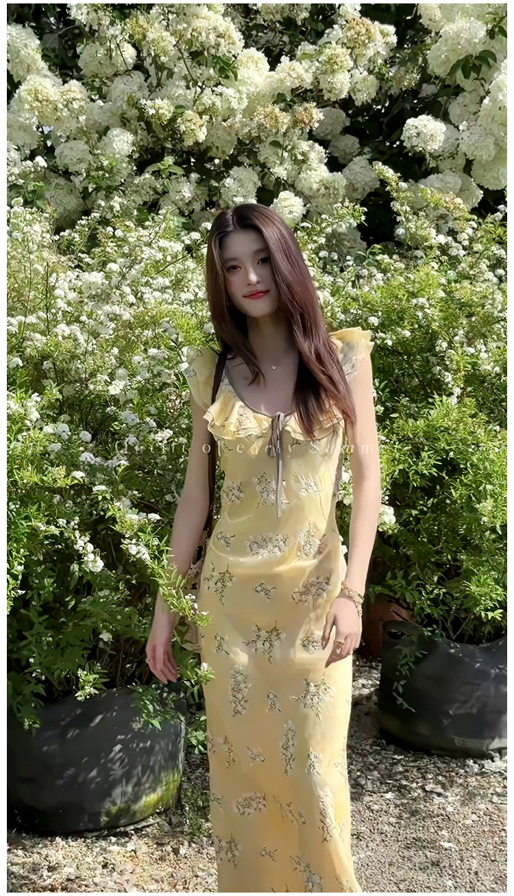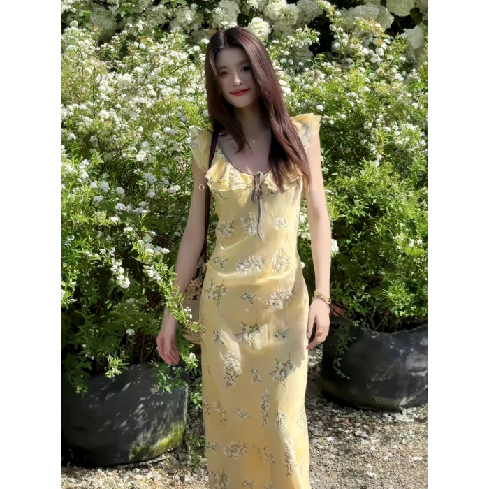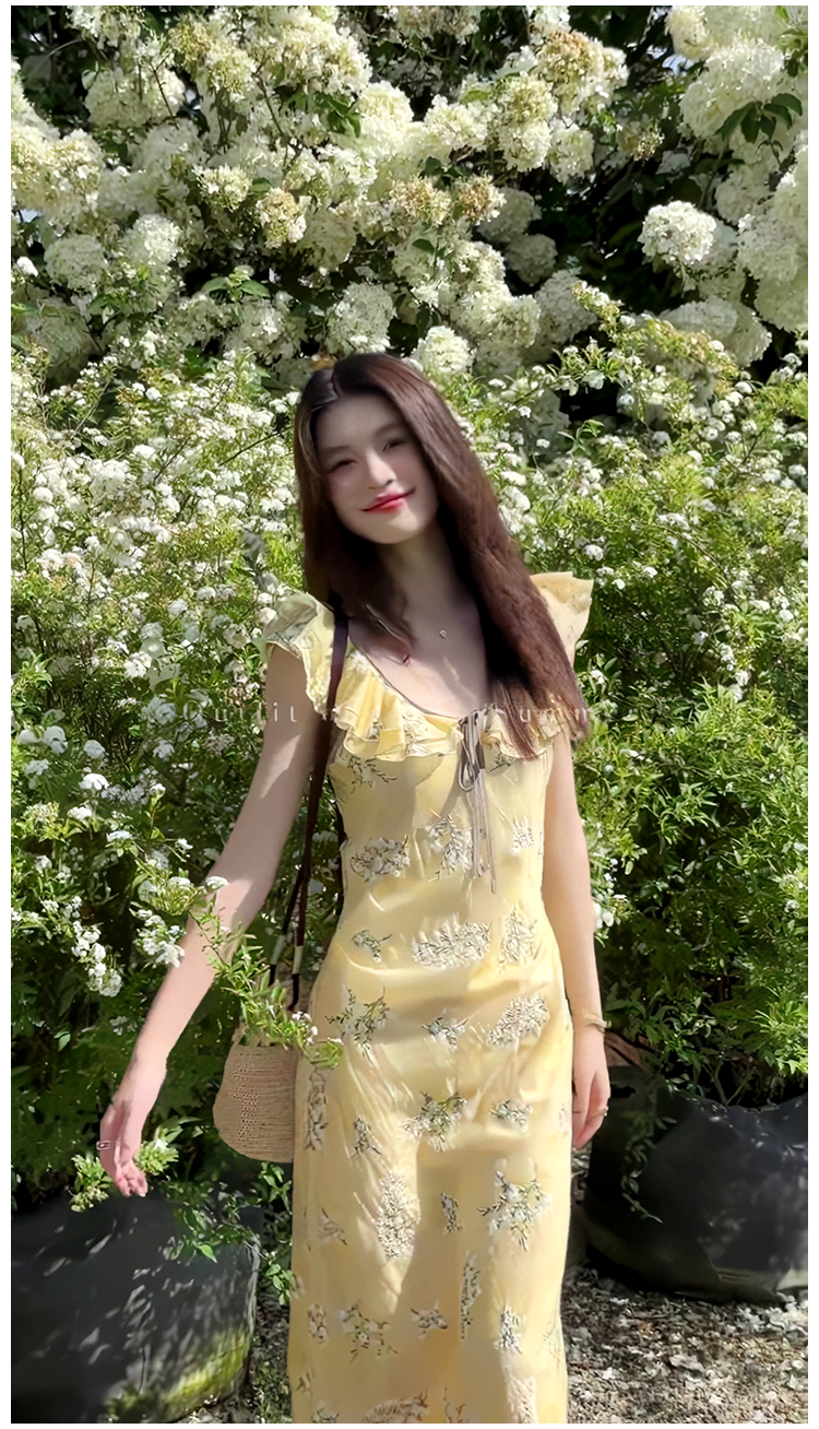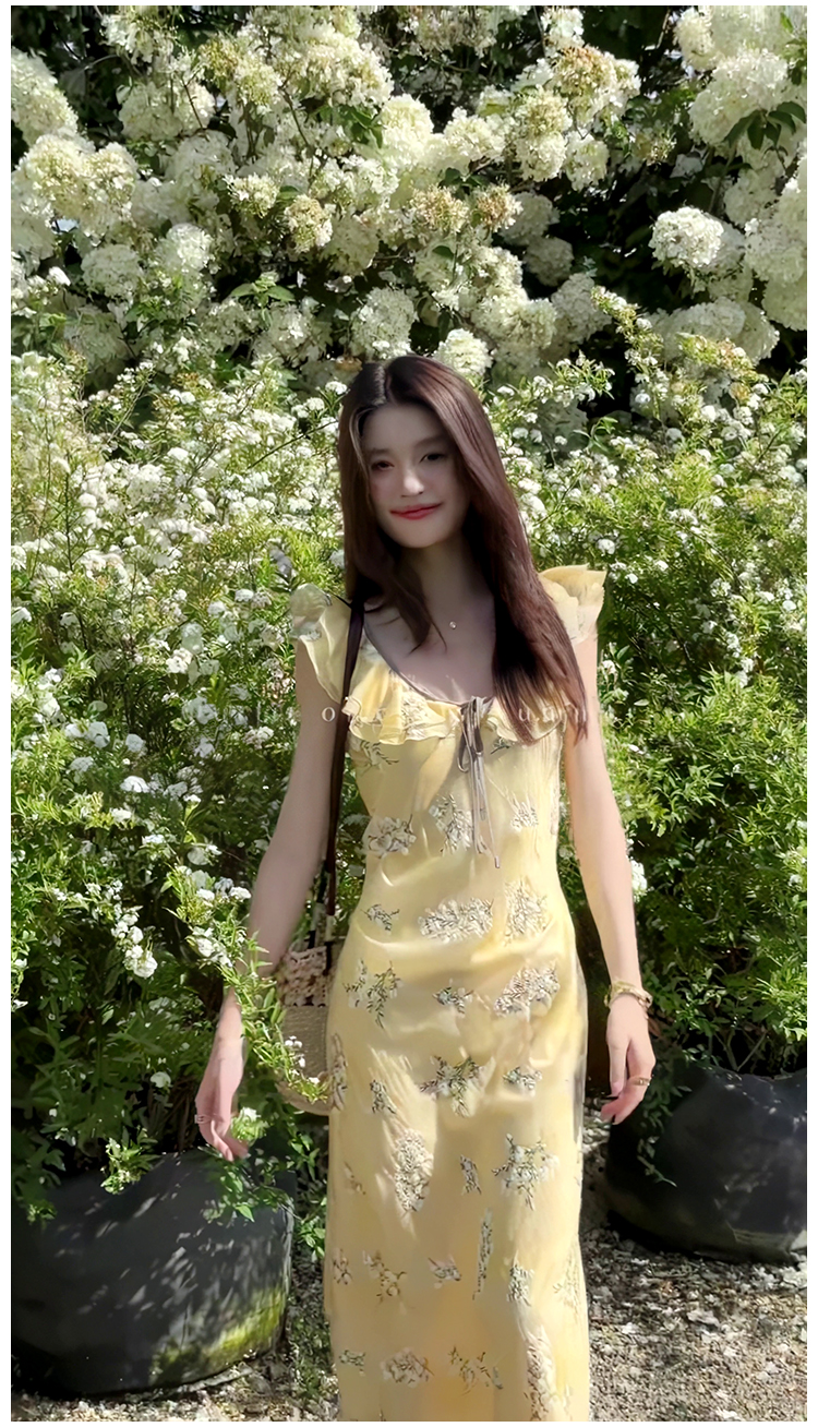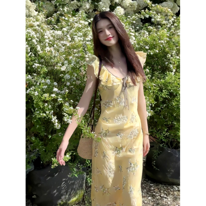 【黃昏集市】2025夏季 法式浪漫木耳邊朦朧花卉吊帶長款連衣裙ins