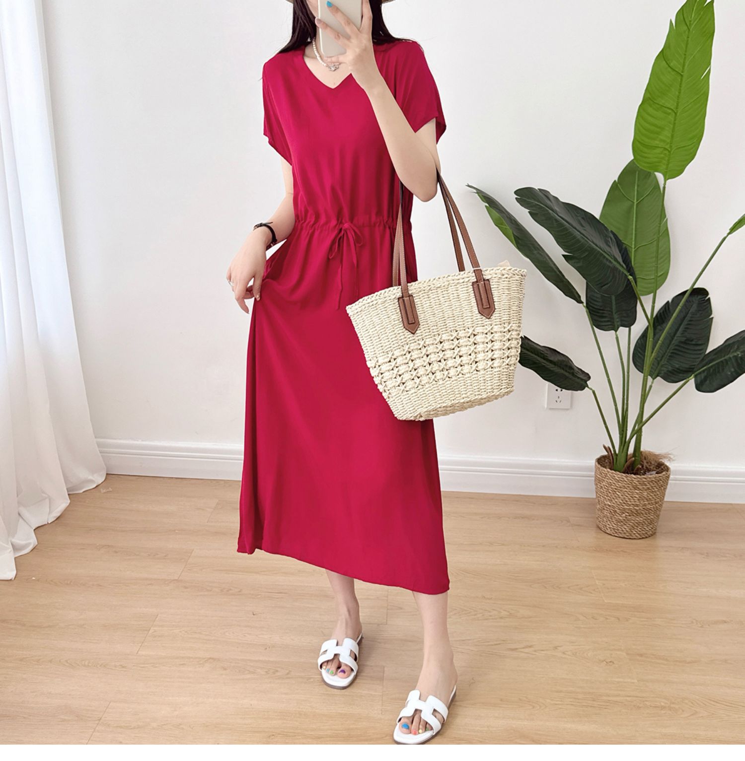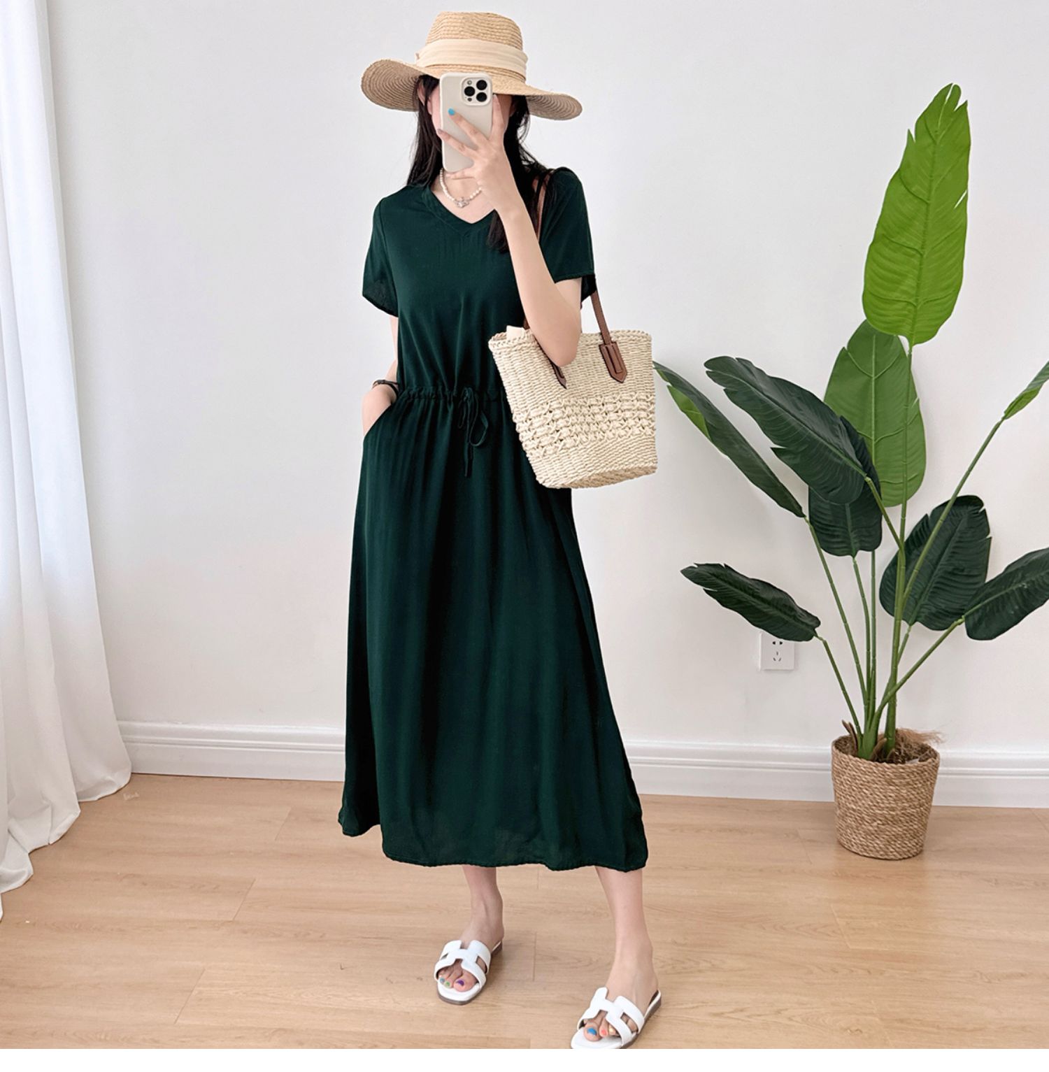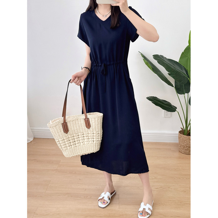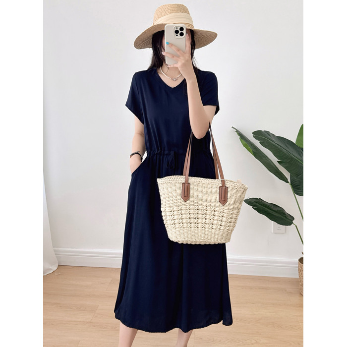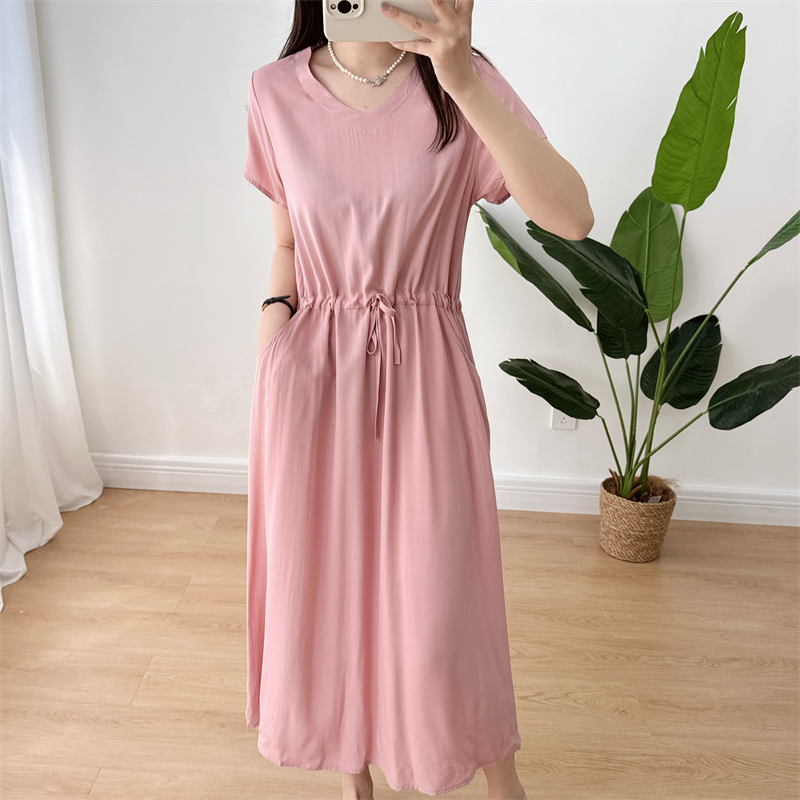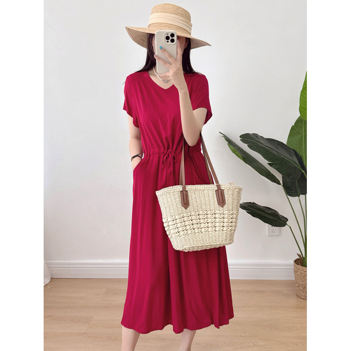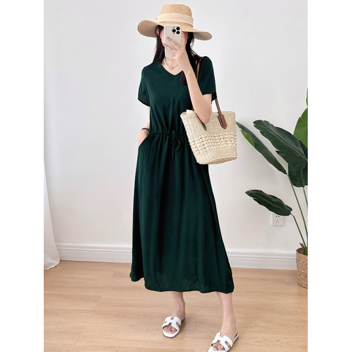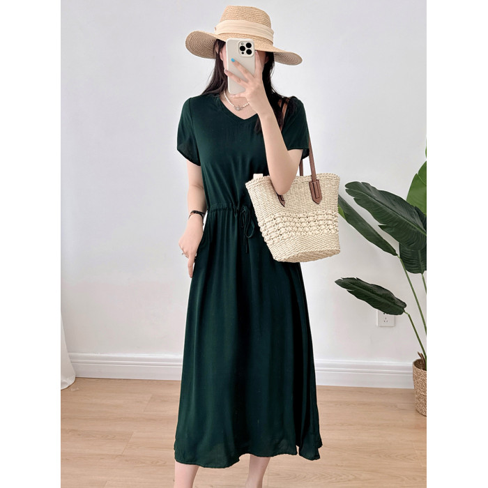 棉綢V領連衣裙女2024年夏季薄款收腰顯瘦純色人造棉沙灘裙大擺裙