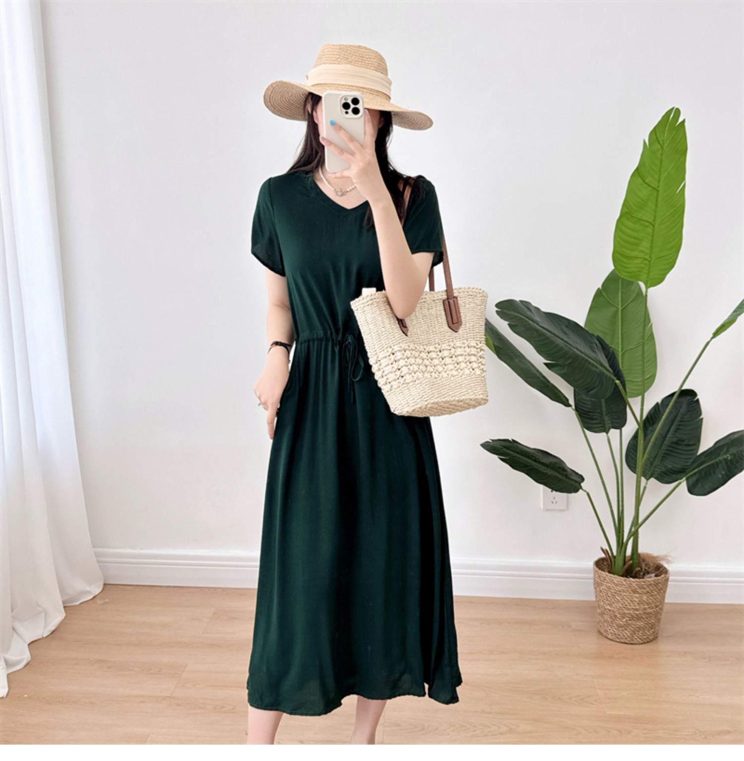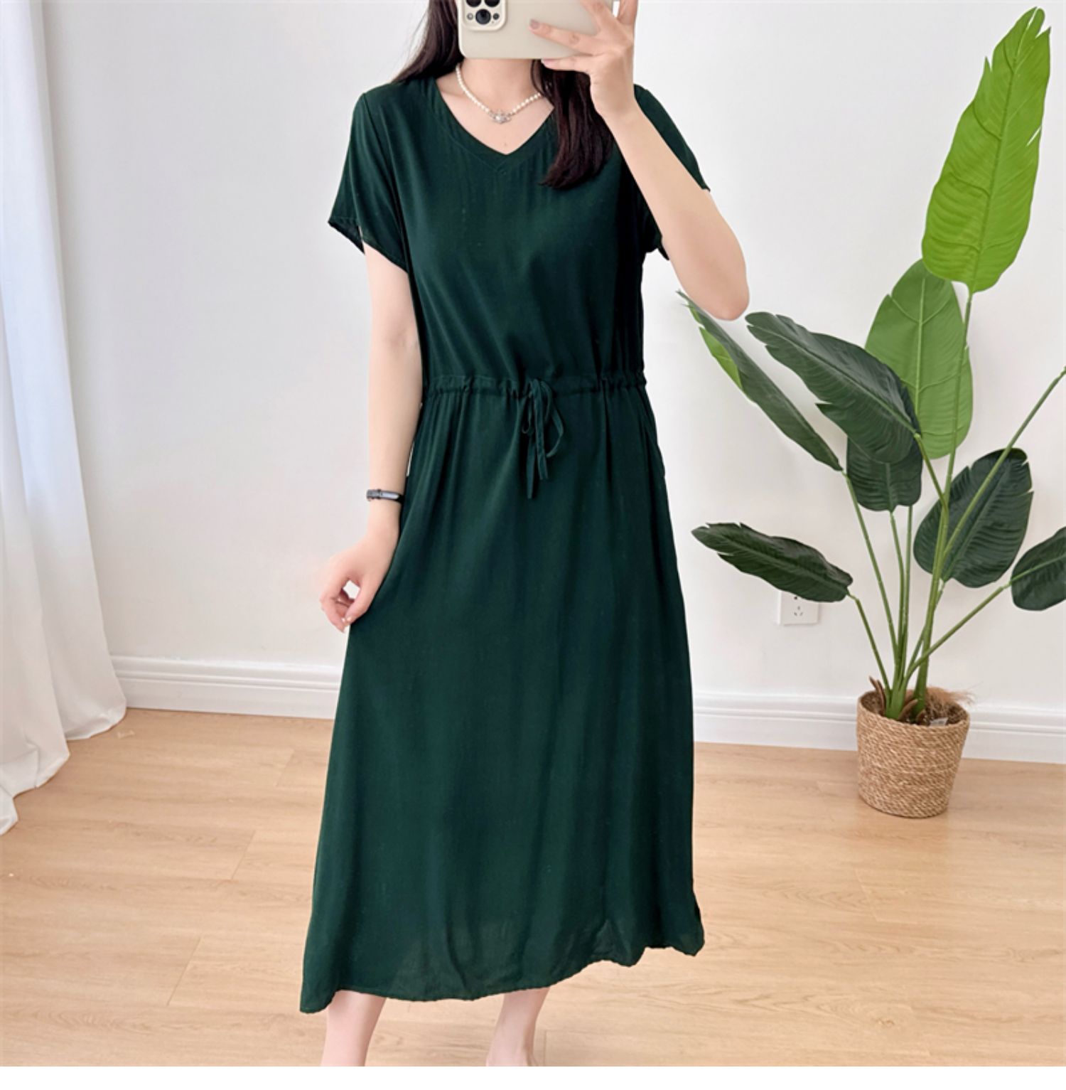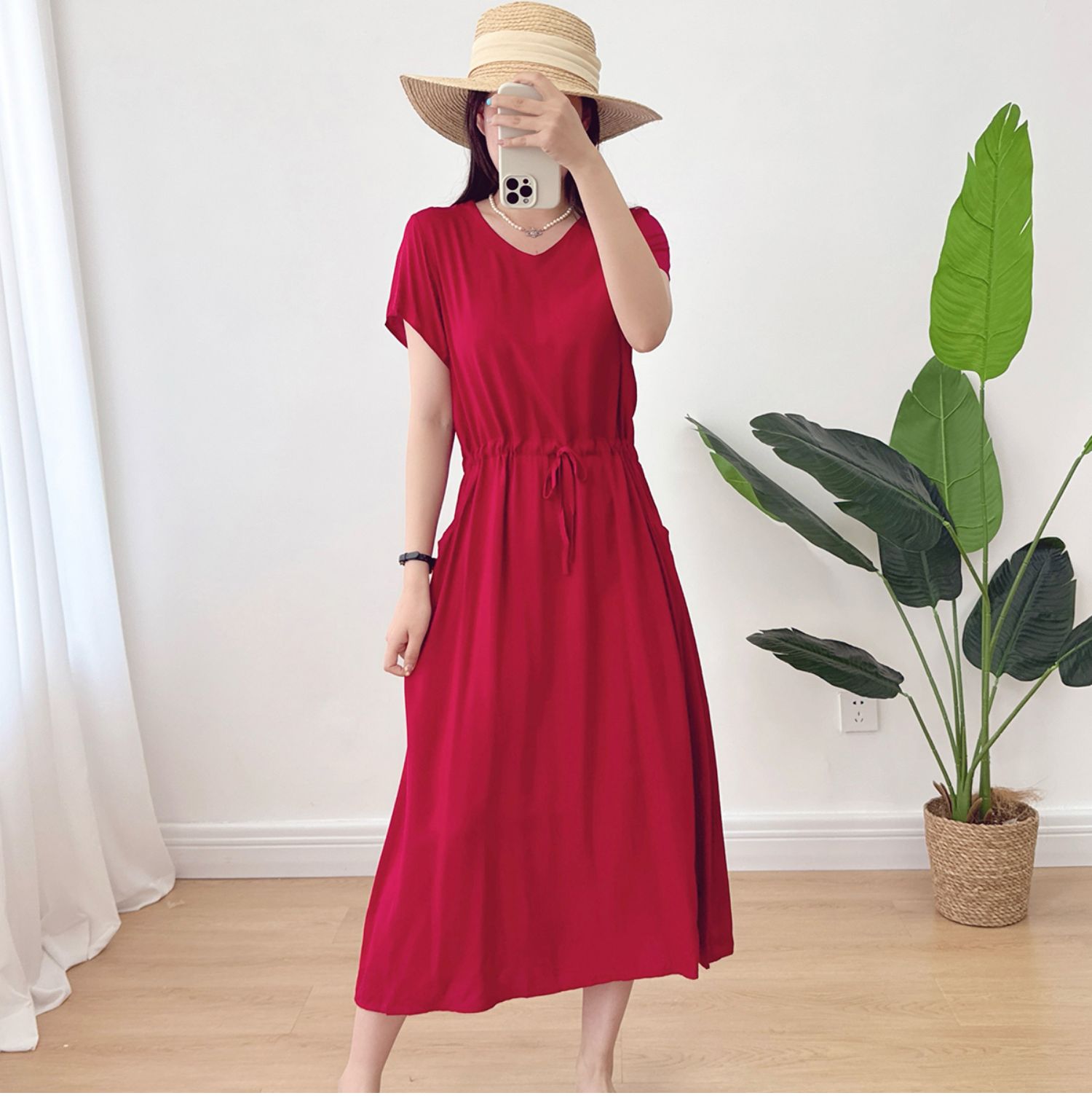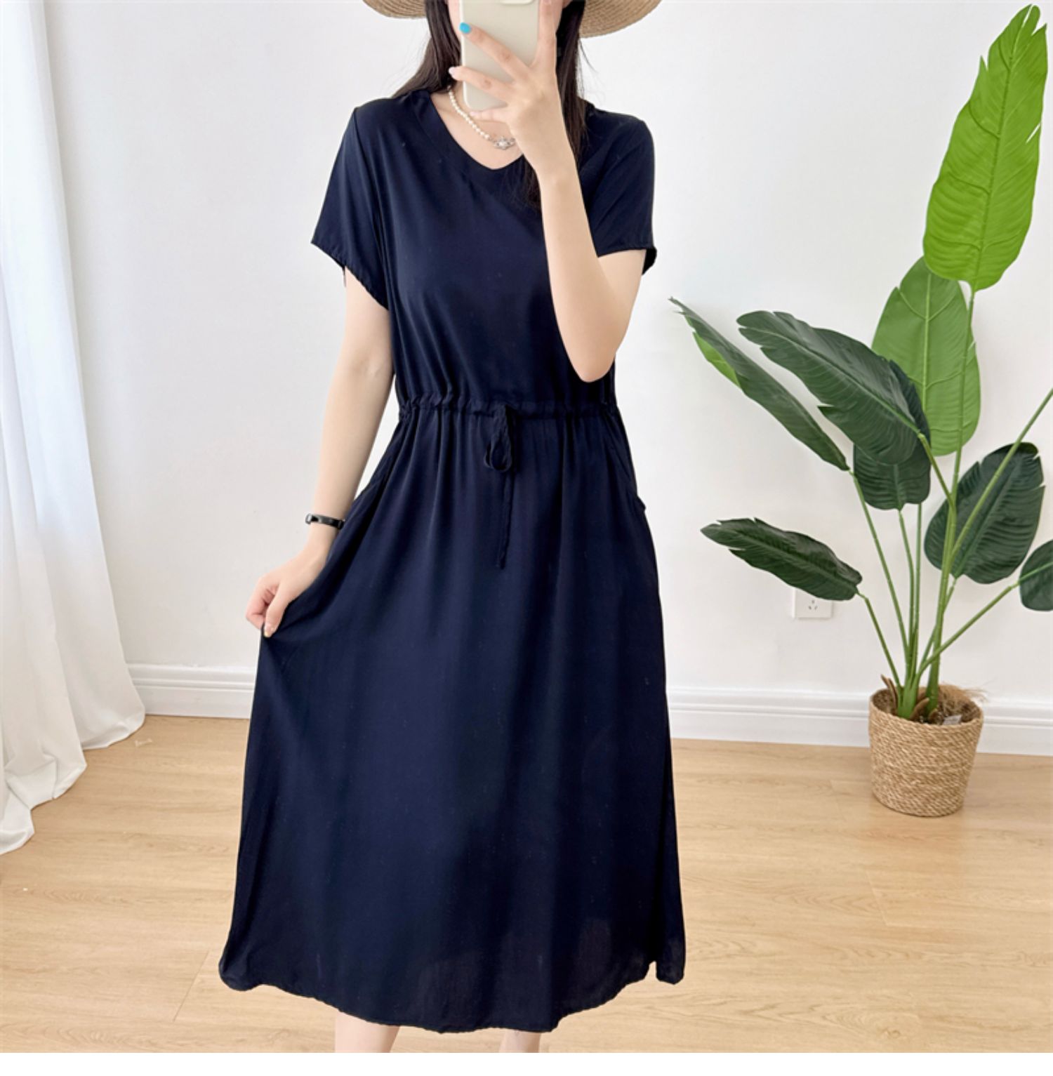 棉綢V領連衣裙女2024年夏季薄款收腰顯瘦純色人造棉沙灘裙大擺裙