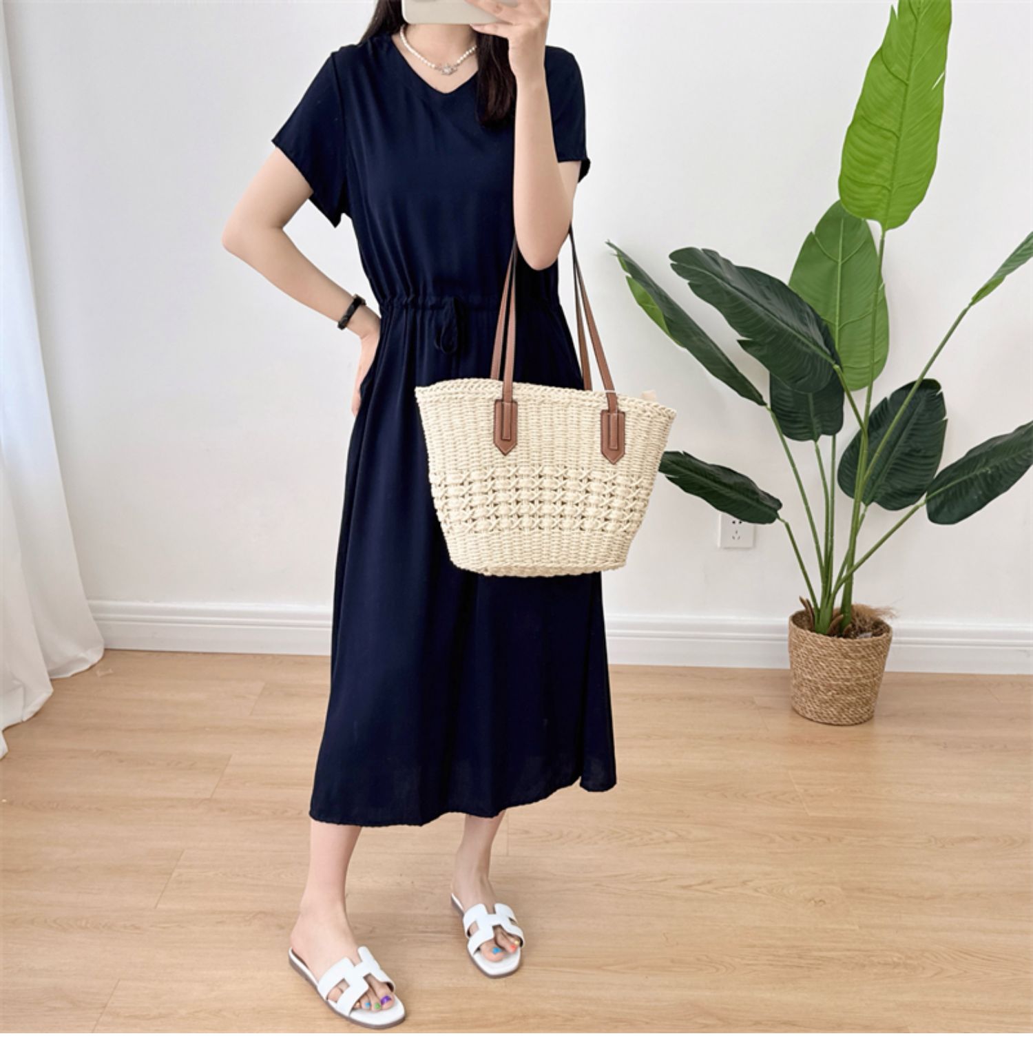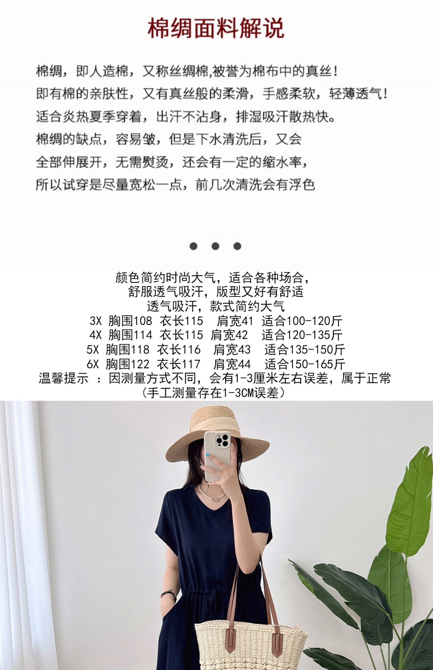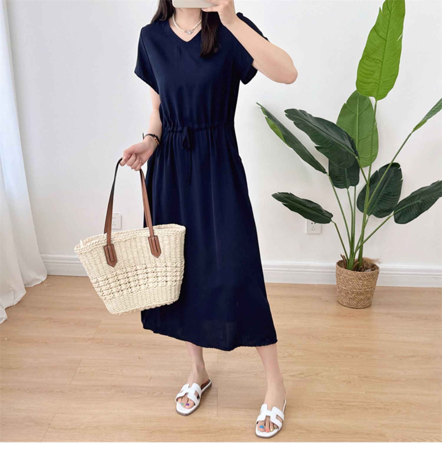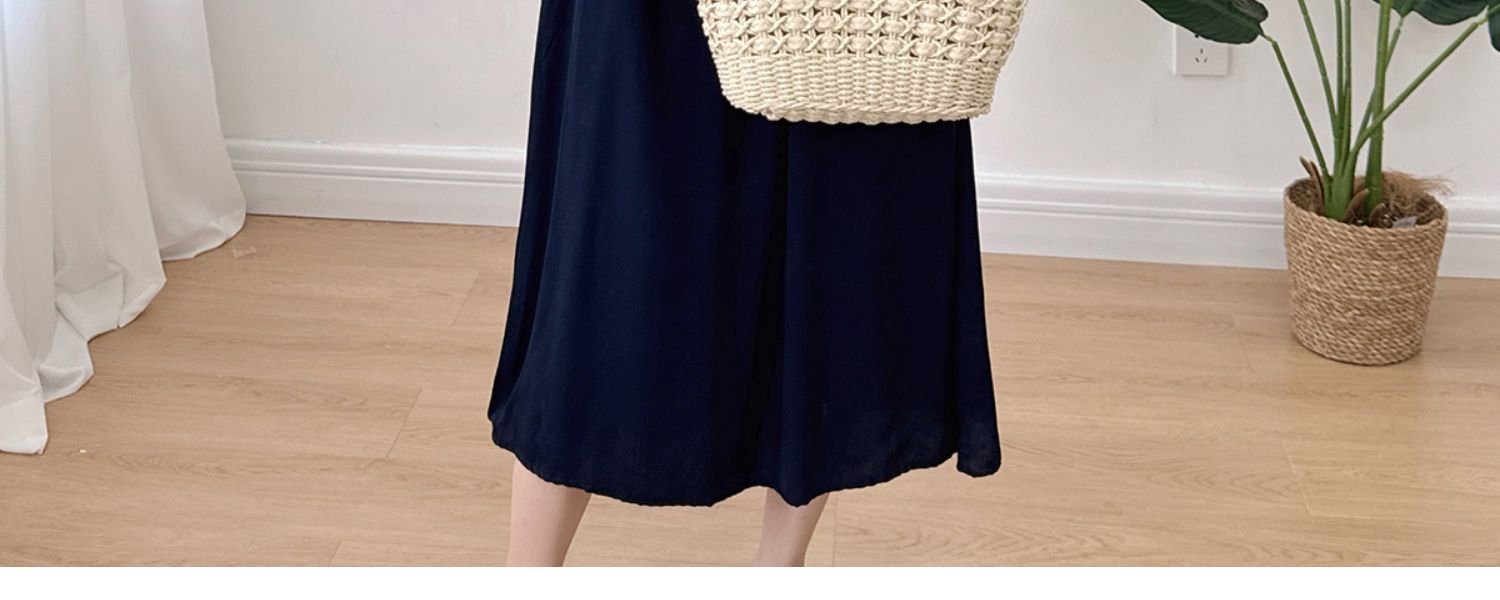 棉綢V領連衣裙女2024年夏季薄款收腰顯瘦純色人造棉沙灘裙大擺裙