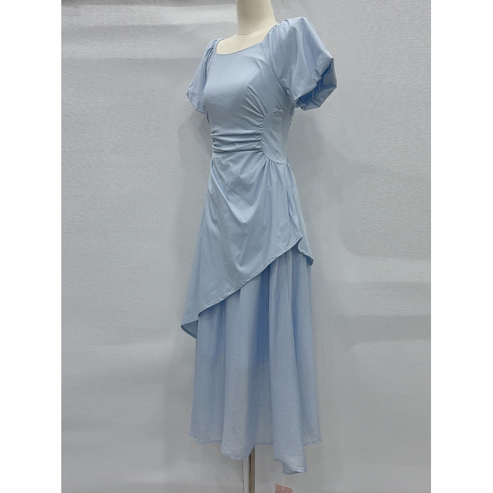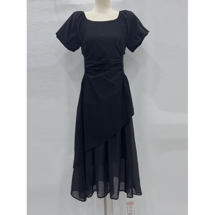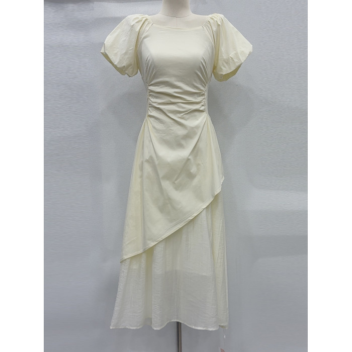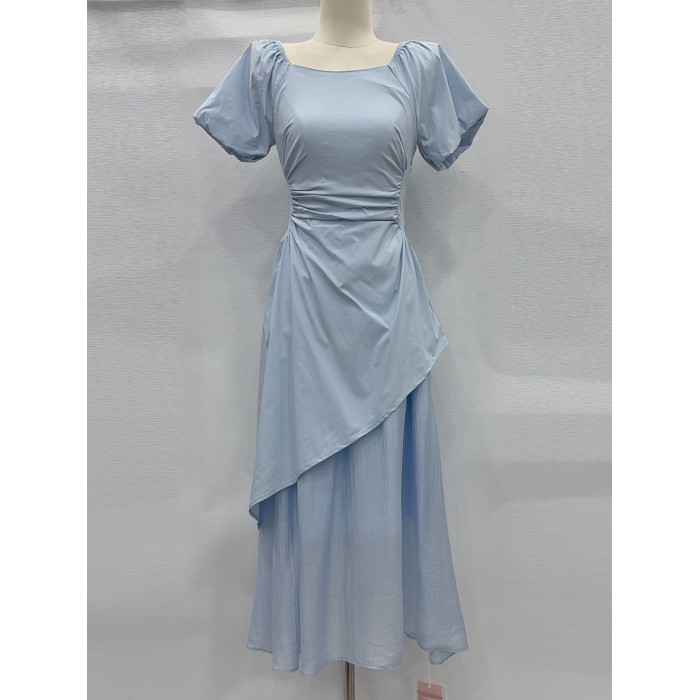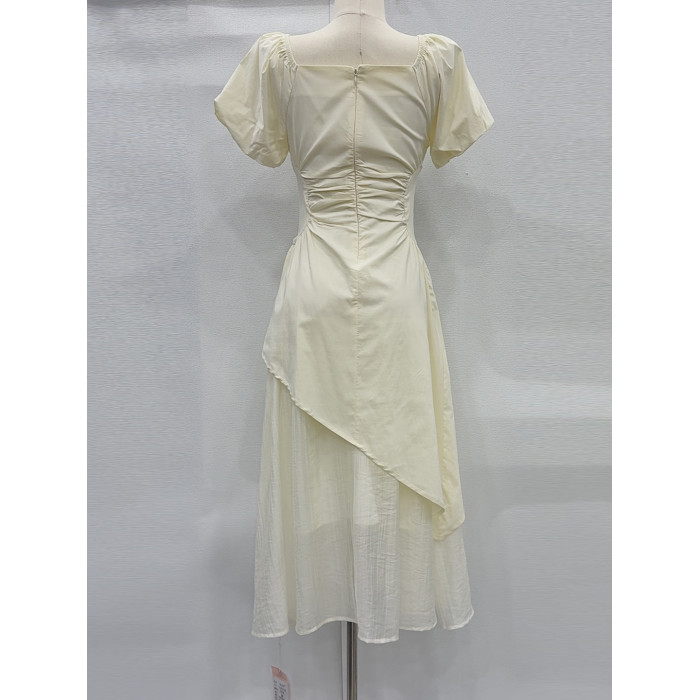 甜美方領連衣裙女夏季時尚收腰減齡法式氣質設計感拼接褶皺中長裙