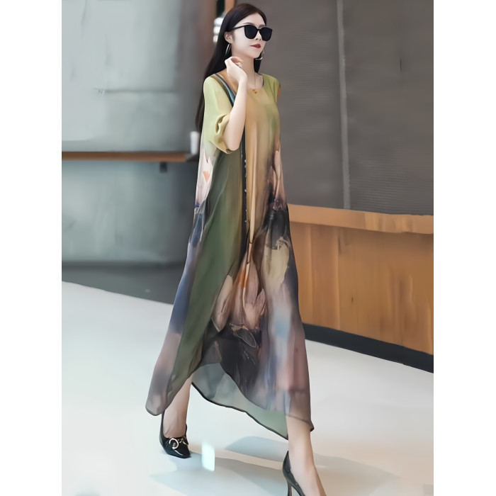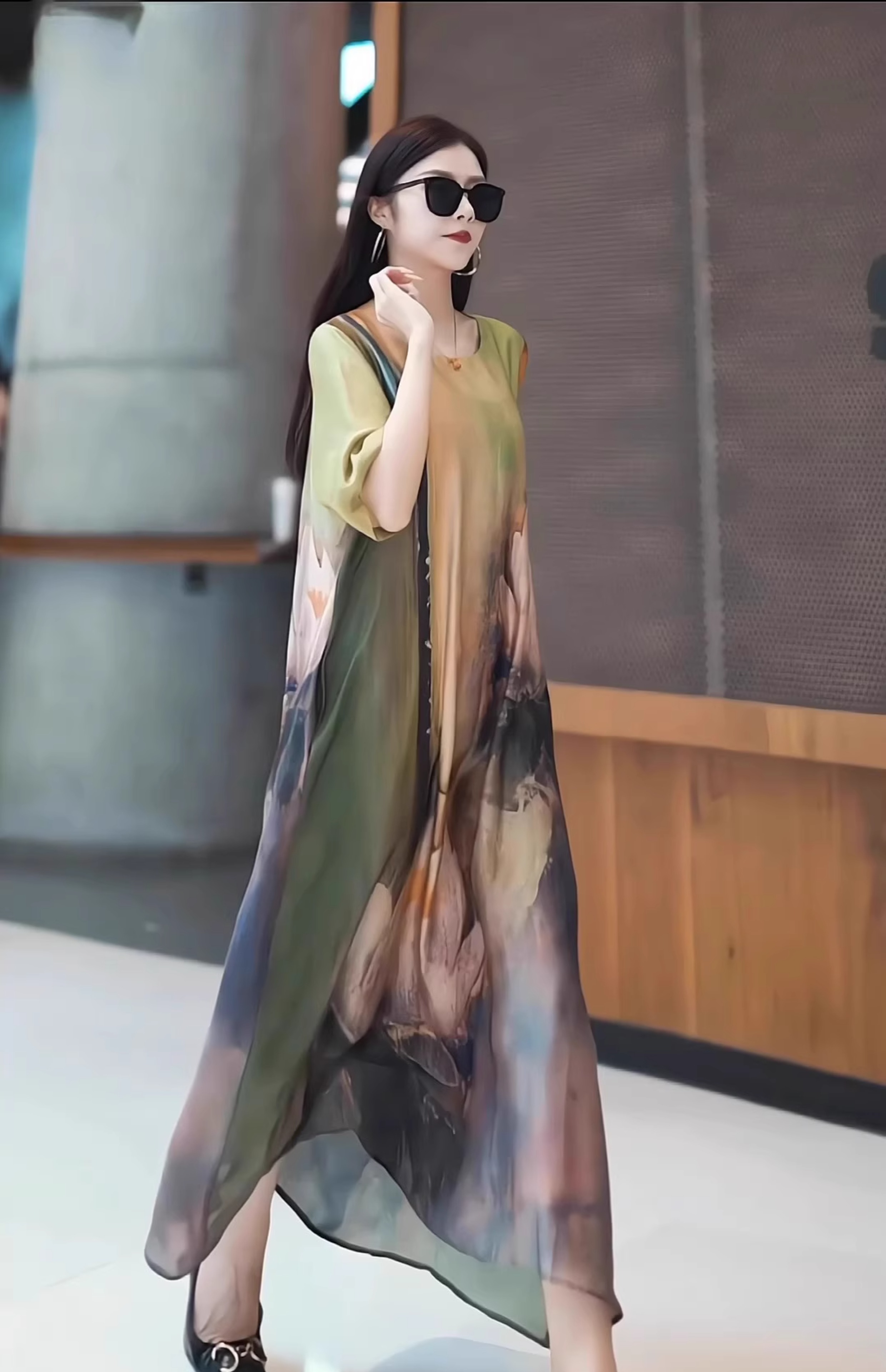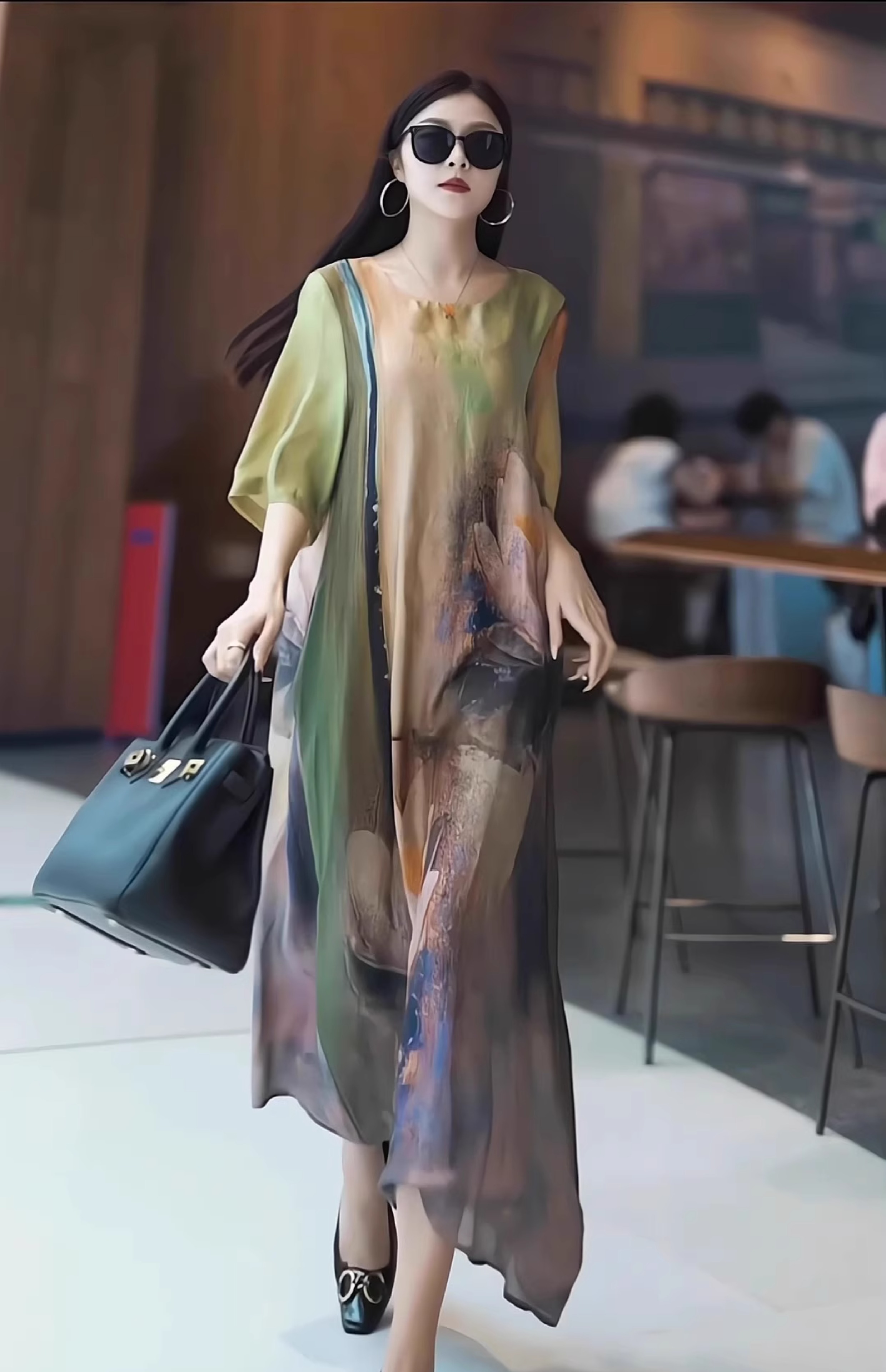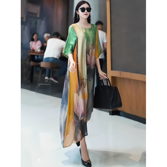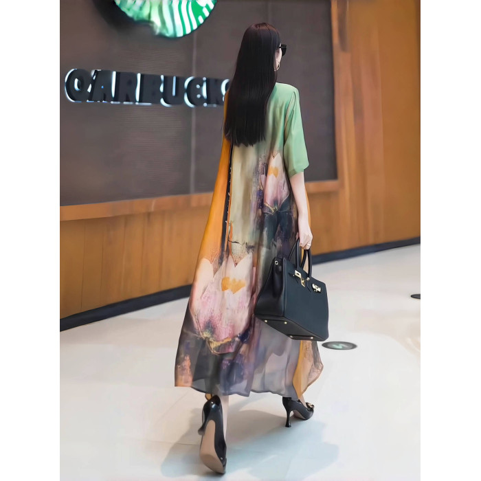大牌復古真絲印花連衣裙女2025年夏季新款高級感寬松顯瘦氣質長裙