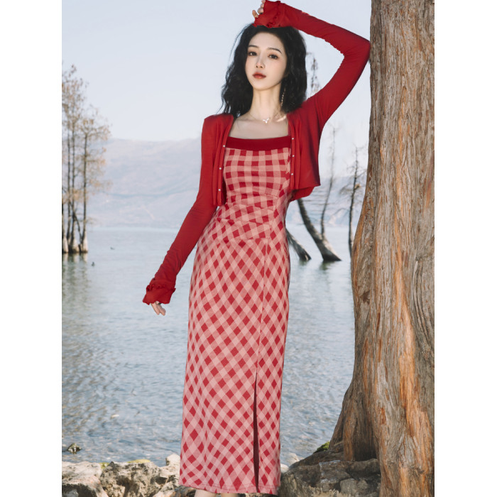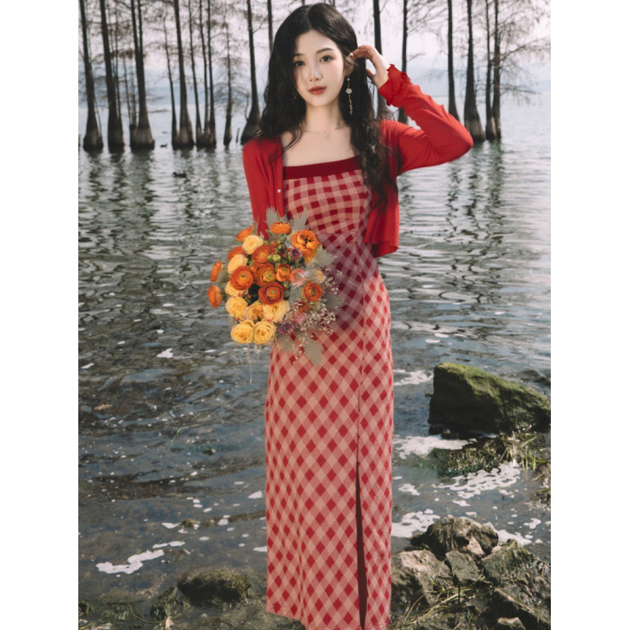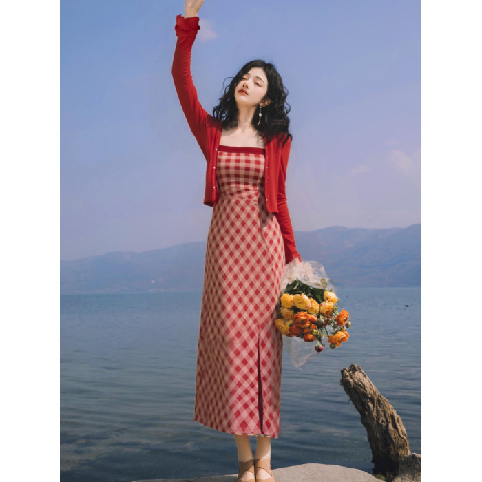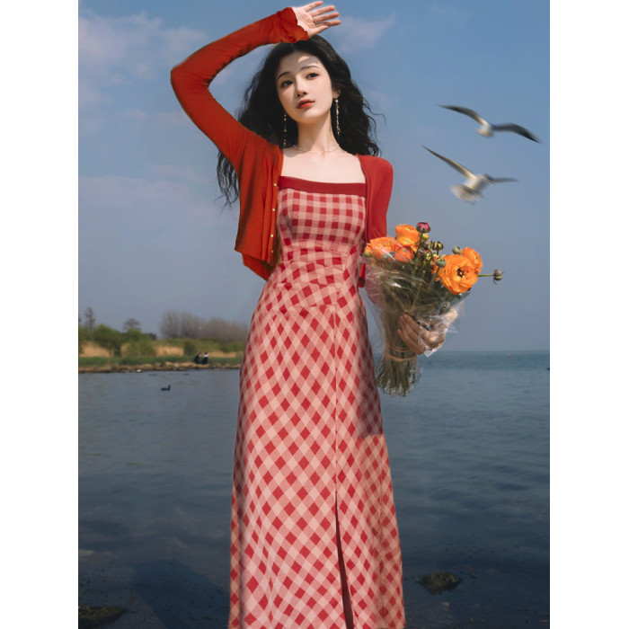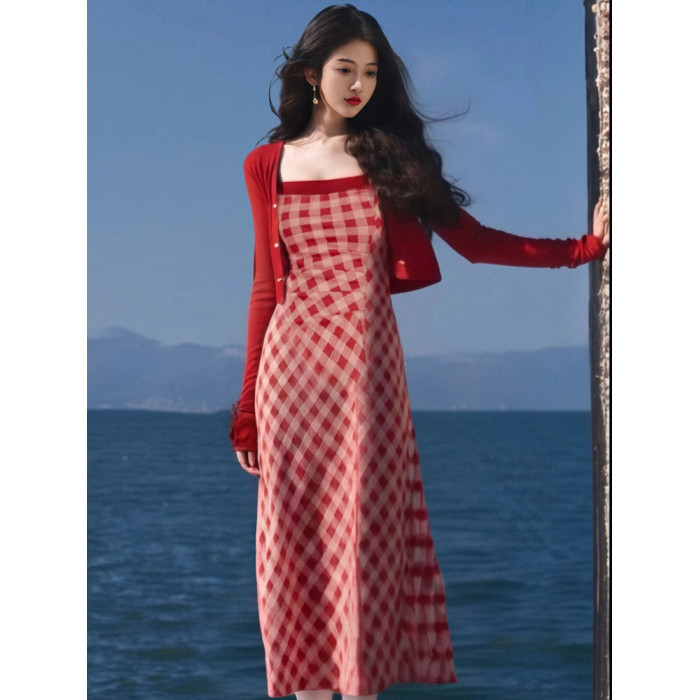 港風多巴胺訂婚領証穿搭迴門便裝收腰顯瘦紅色格子吊帶連衣裙套裝