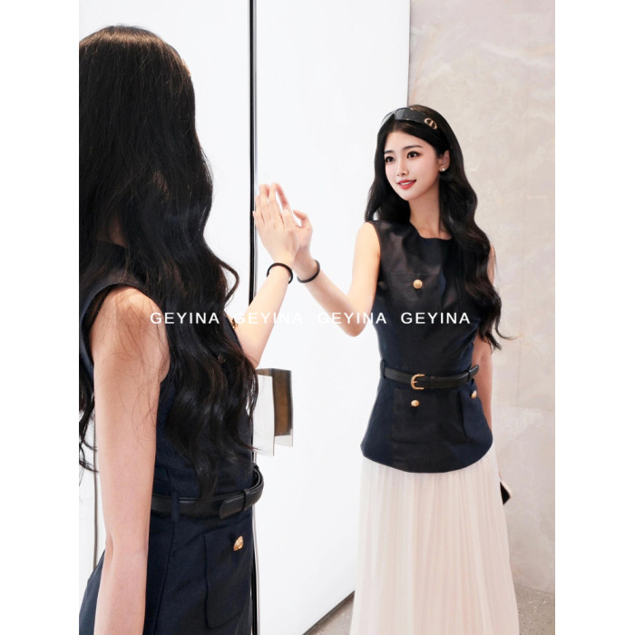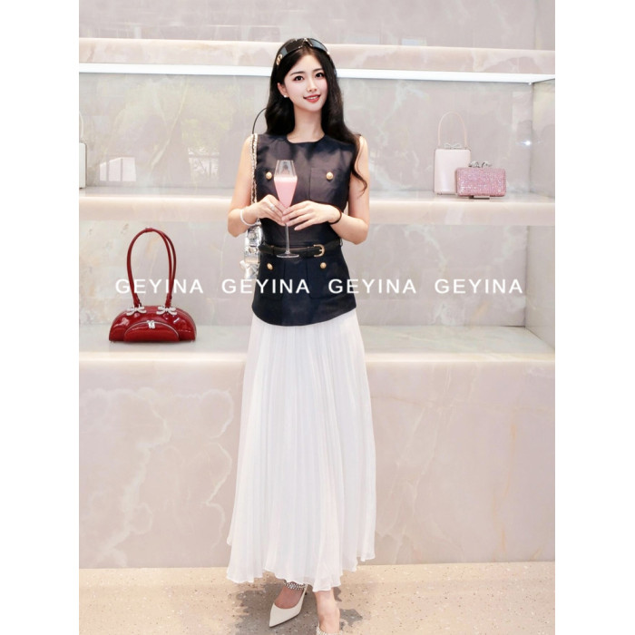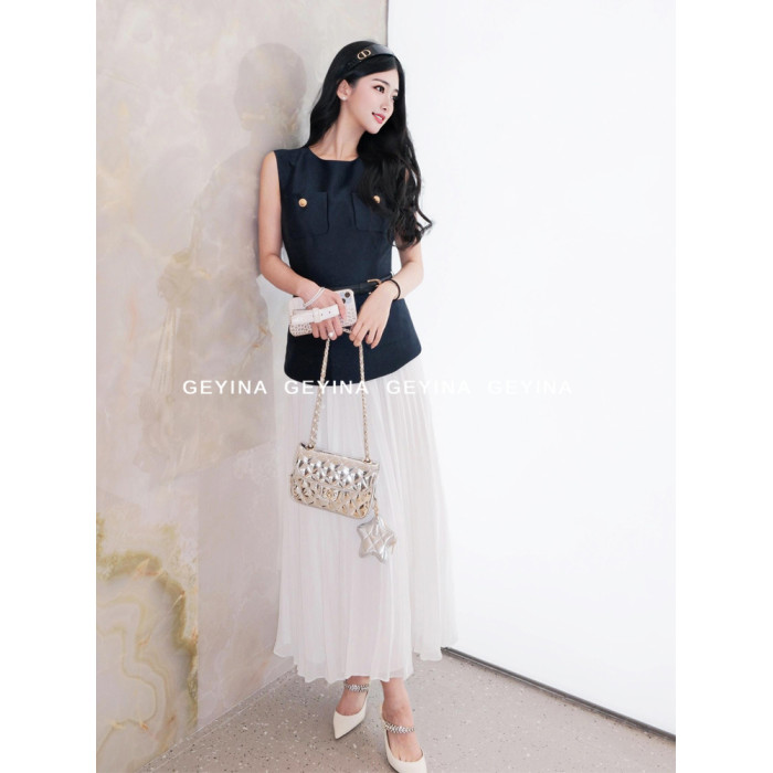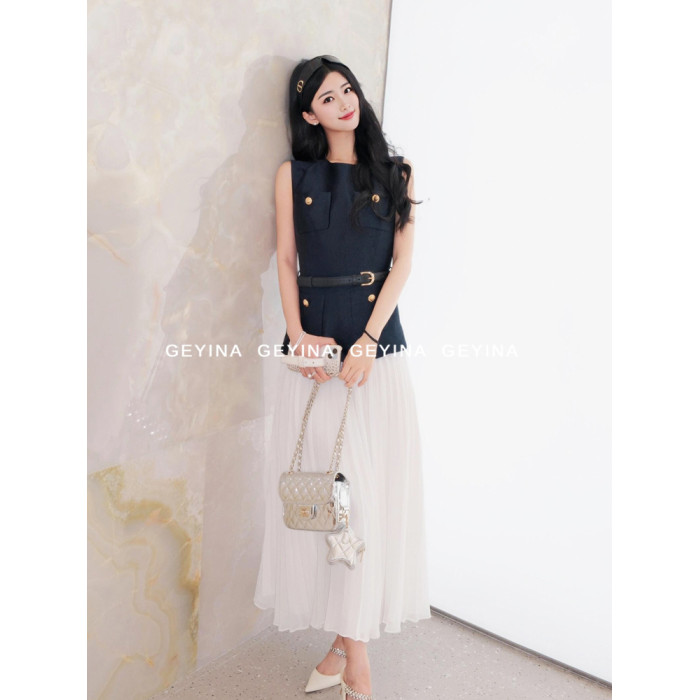 GEYINA高定2025早秋季新款藍撞白緞面小香風顯瘦無袖假兩件連衣裙