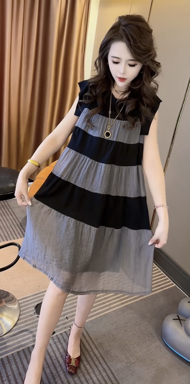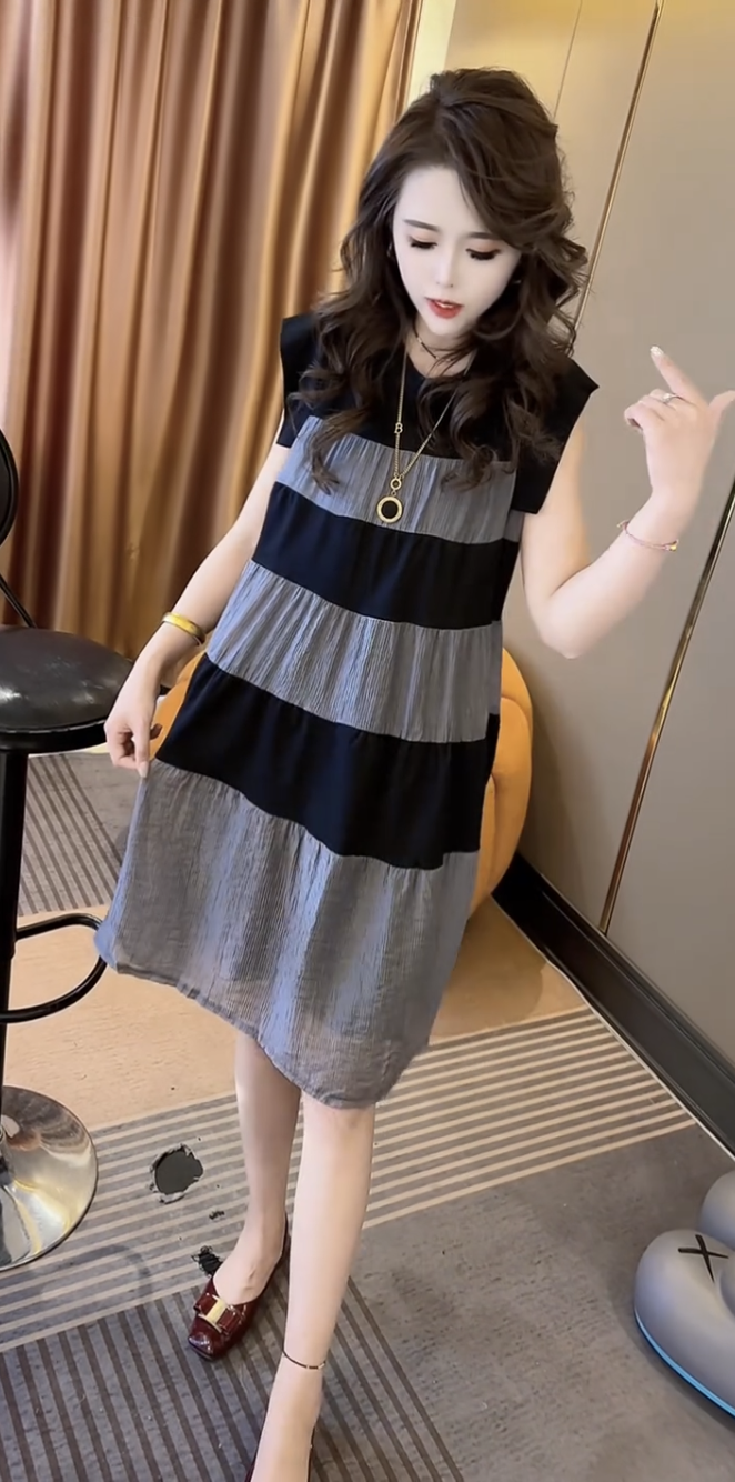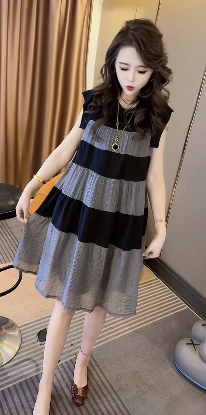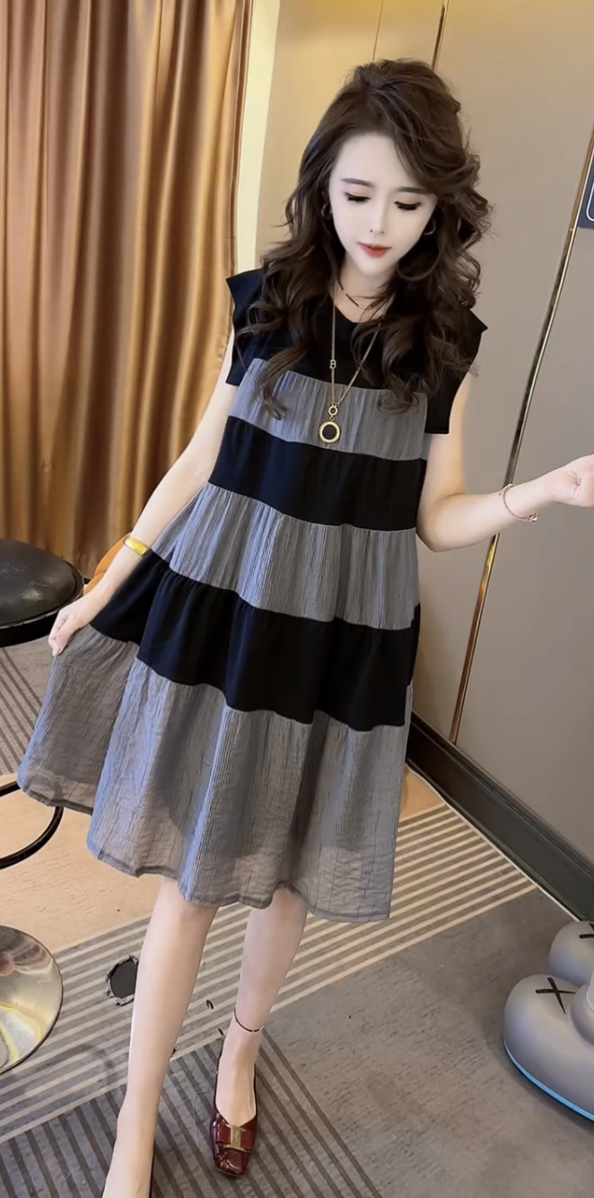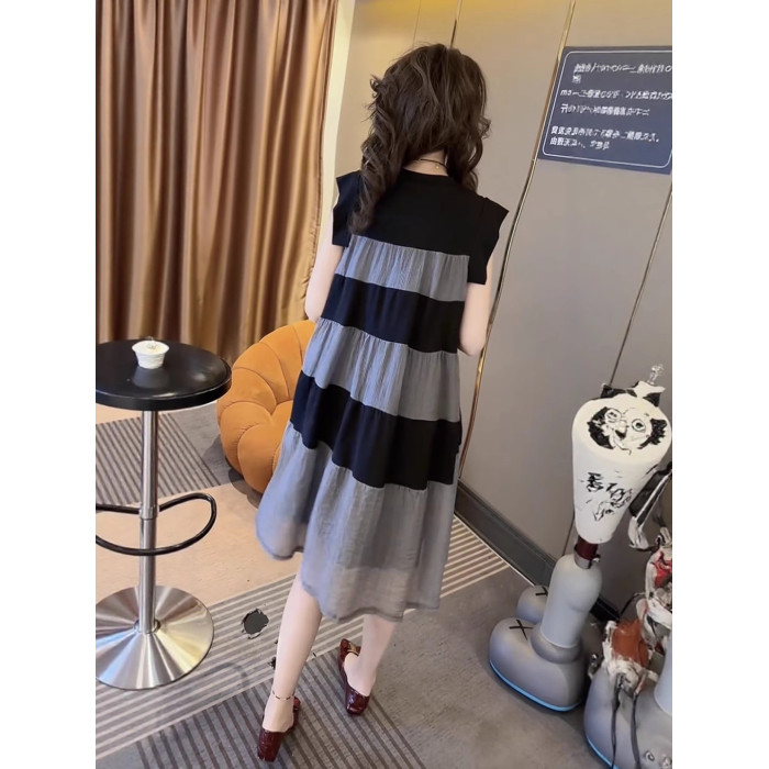 歐洲站2025夏季圓領條紋拼接飛飛袖連衣裙女寬松顯瘦A字中長裙潮