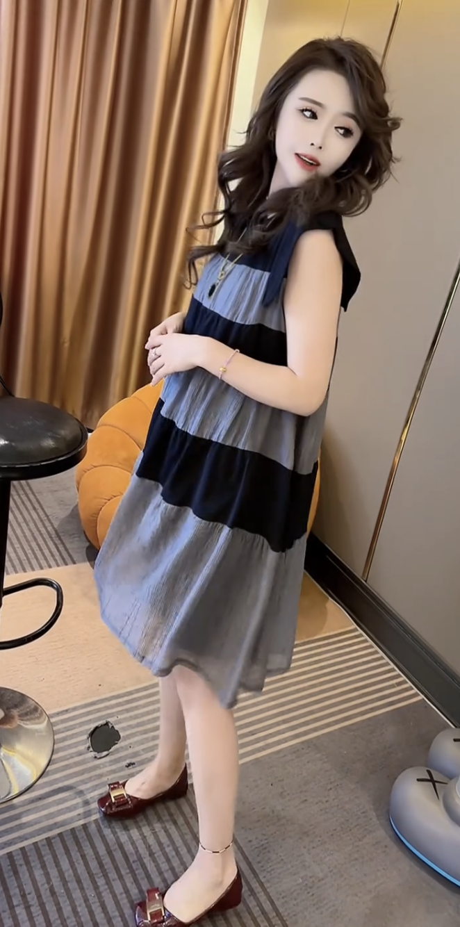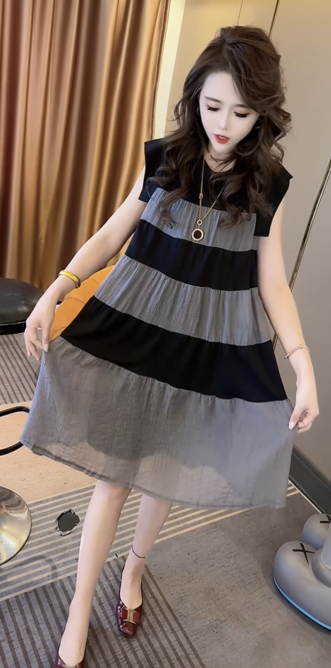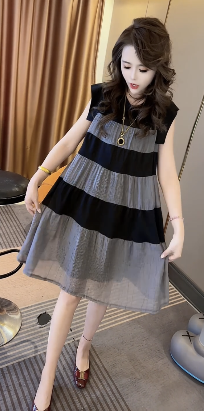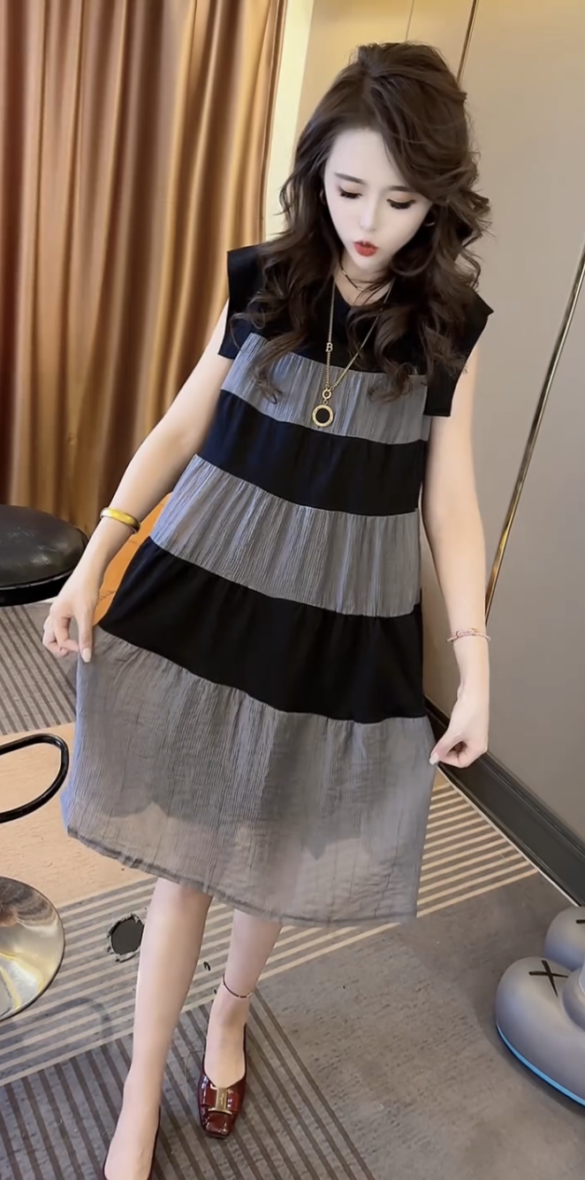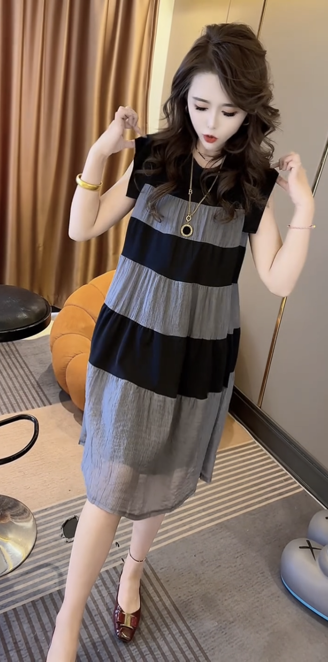 歐洲站2025夏季圓領條紋拼接飛飛袖連衣裙女寬松顯瘦A字中長裙潮