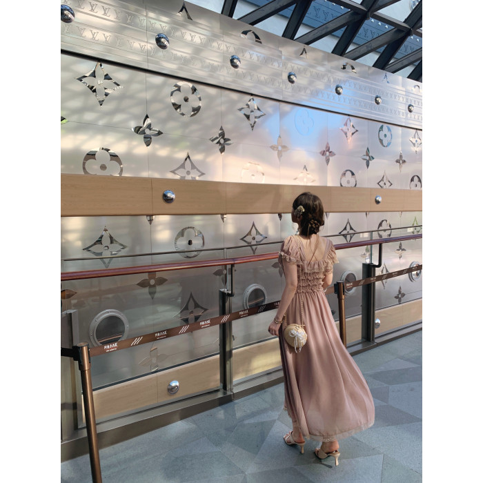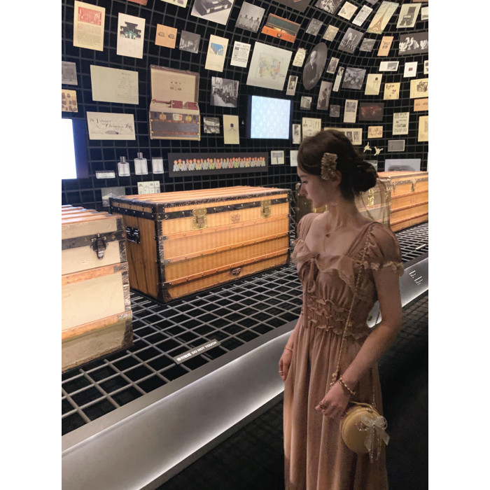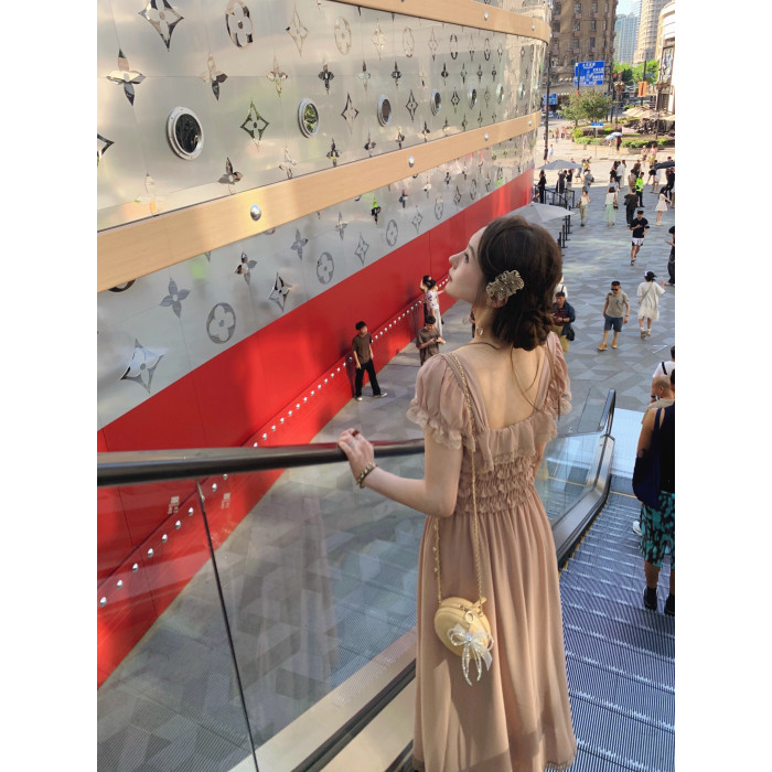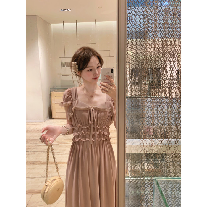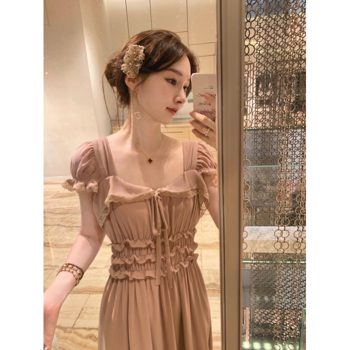 ForeverKid香頌中古 氣質vtg法蕾拼接褶皺方領連衣裙古董裙長裙夏