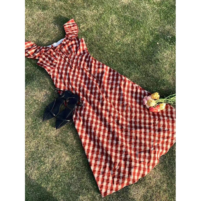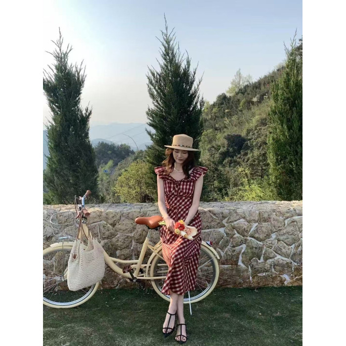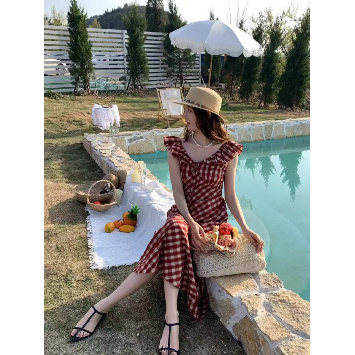 法式無袖紅格子連衣裙女夏新款獨特漂亮系腰帶裙子氣質長裙吊帶