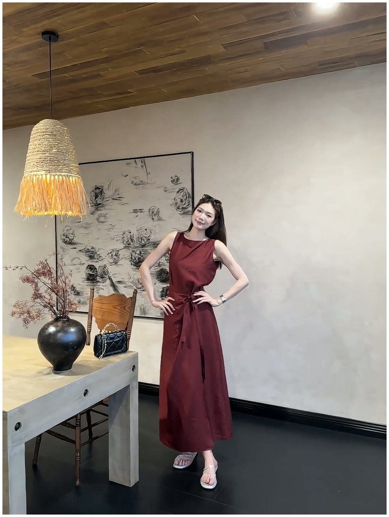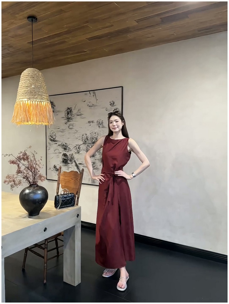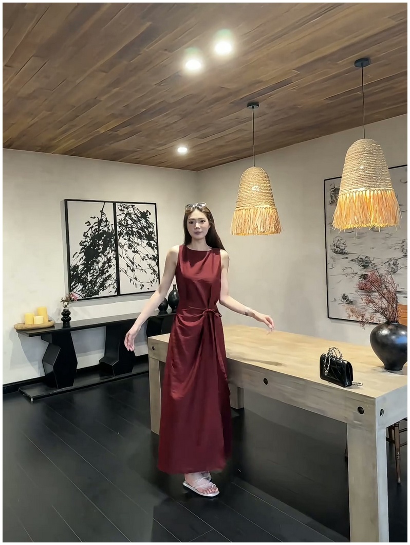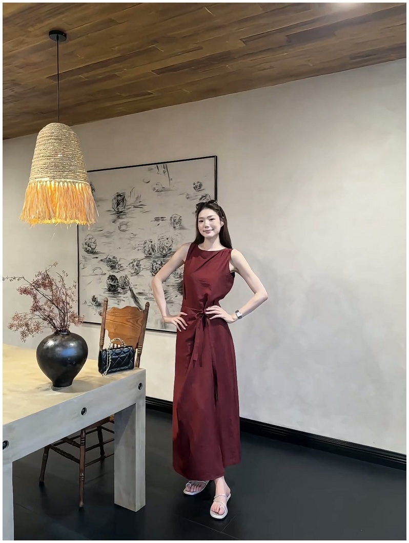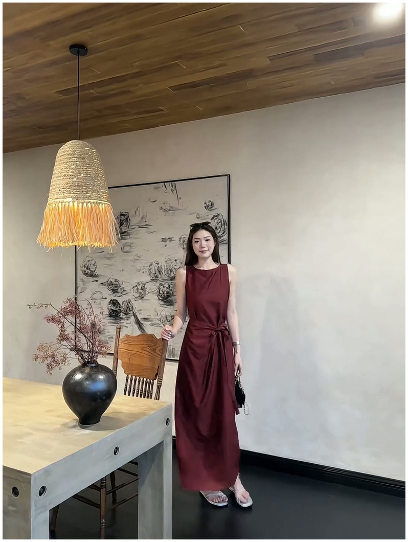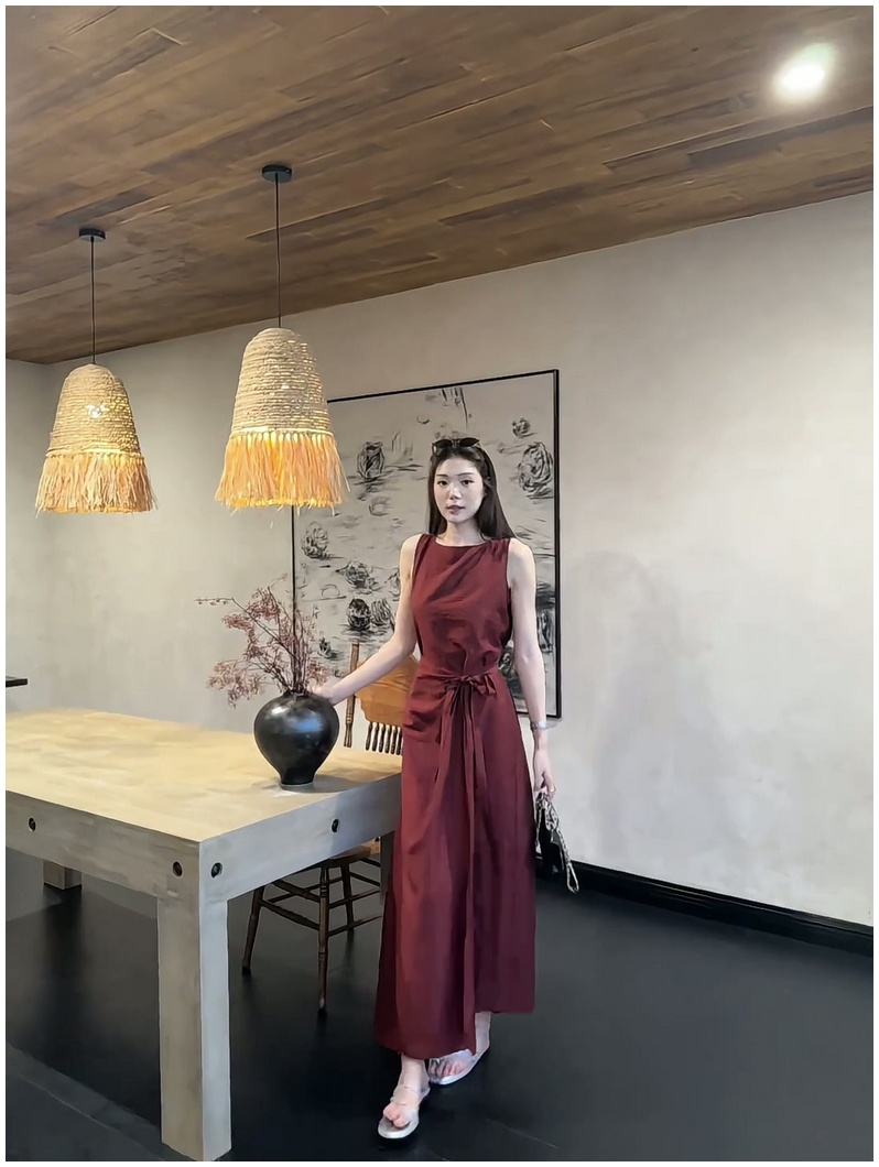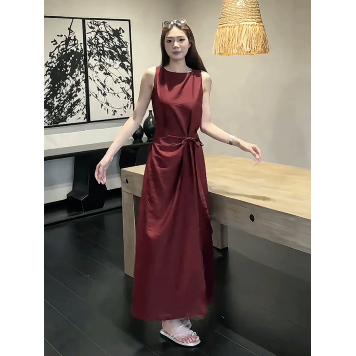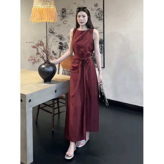 法式復古紅色無袖背心連衣裙女2025夏季新款顯瘦系帶收腰過膝長裙