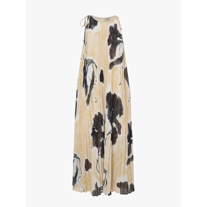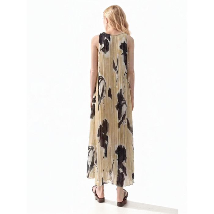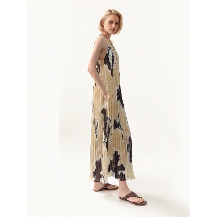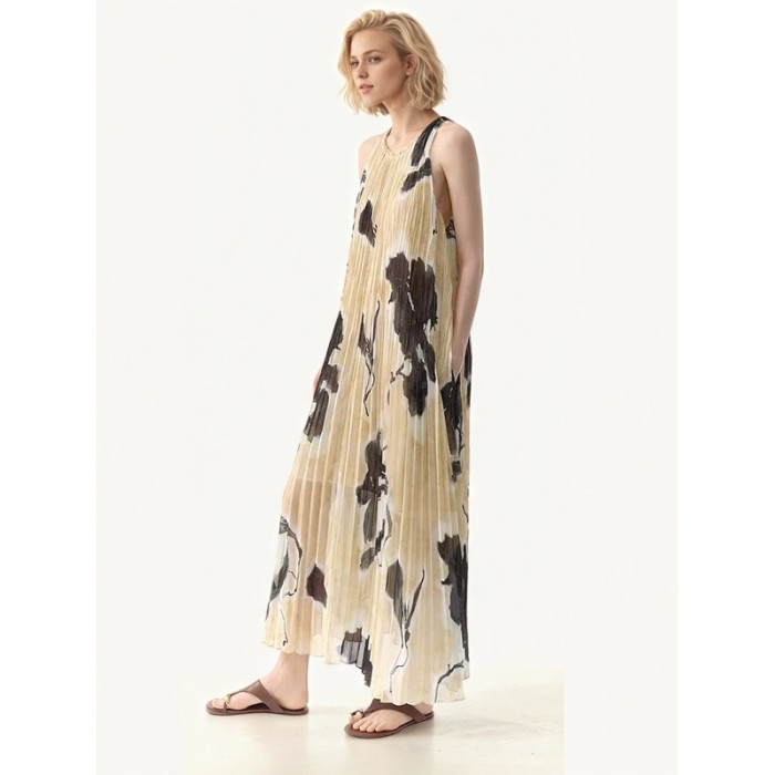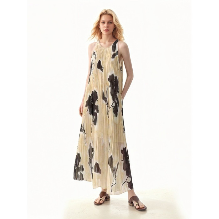 【商場同款】2025夏新款度假風東方花影印花壓褶背心裙連衣裙女