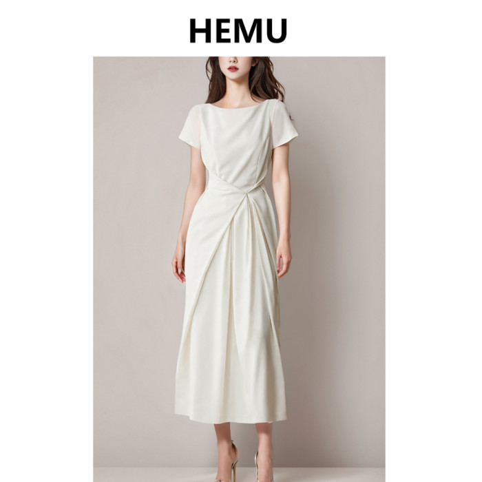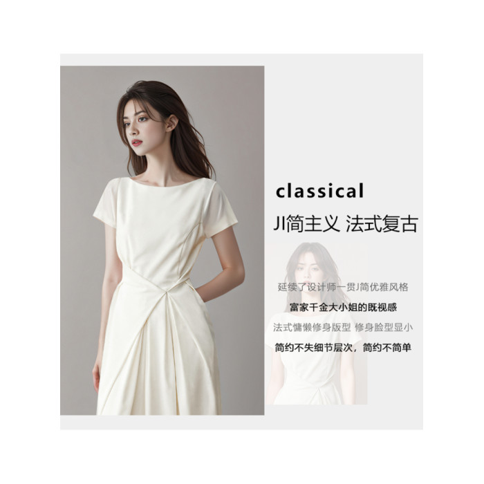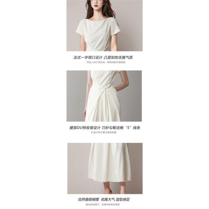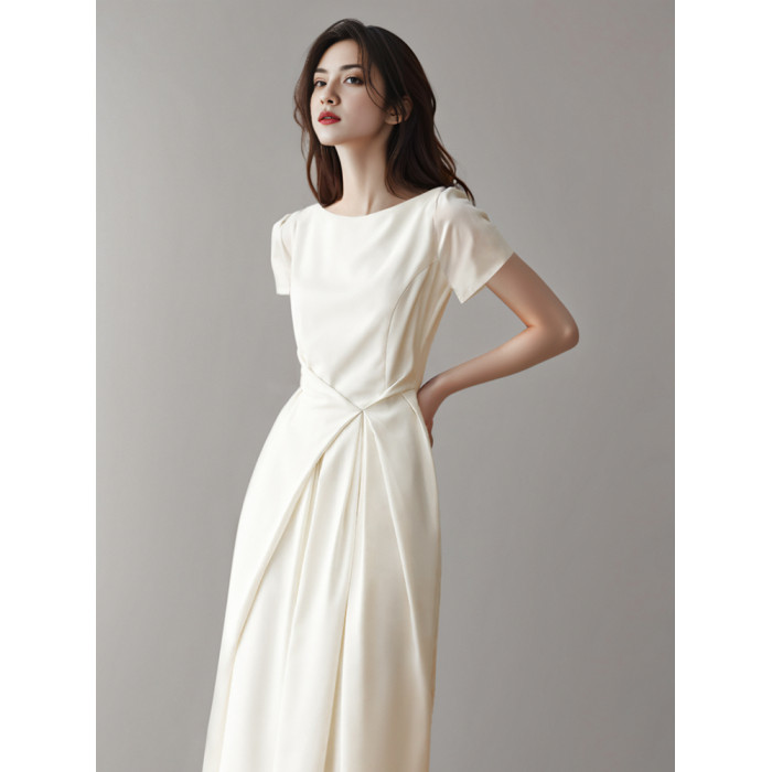 白色連衣裙女夏法式短袖領証初戀小白裙宴會禮服大方得體收腰長裙