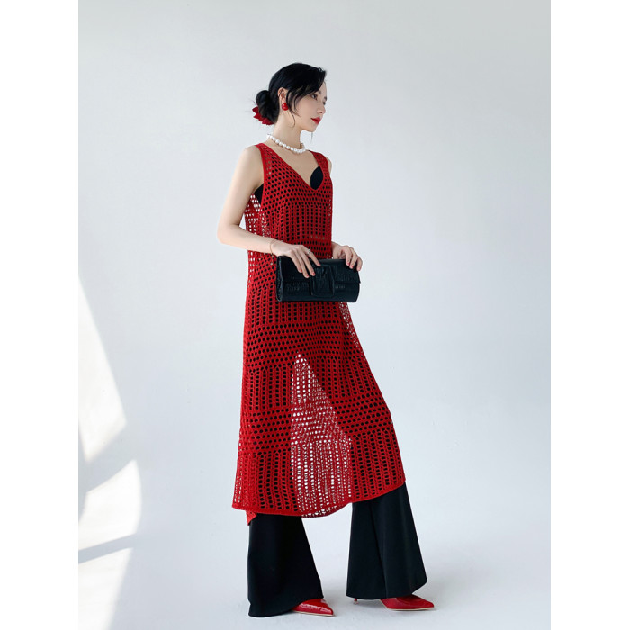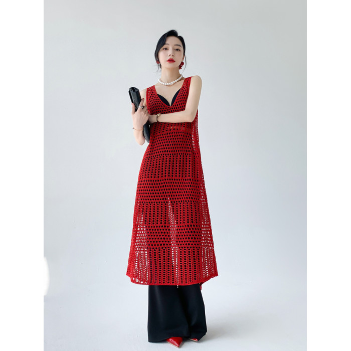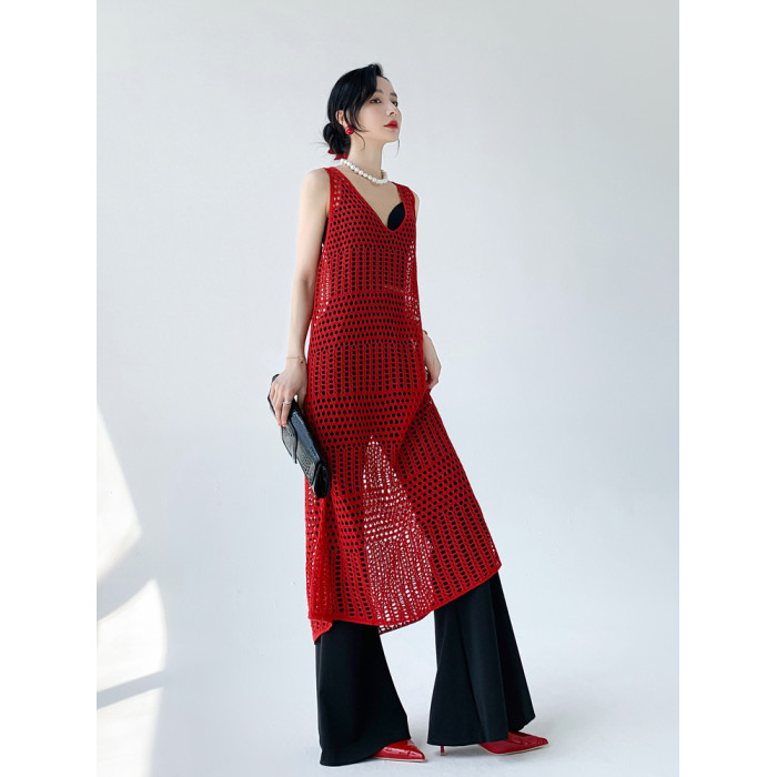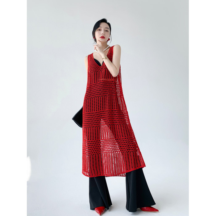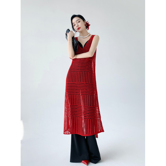 AKSAYA設計感時尚漁網鏤空罩裙網眼背心裙中長款寬松連衣裙女夏季