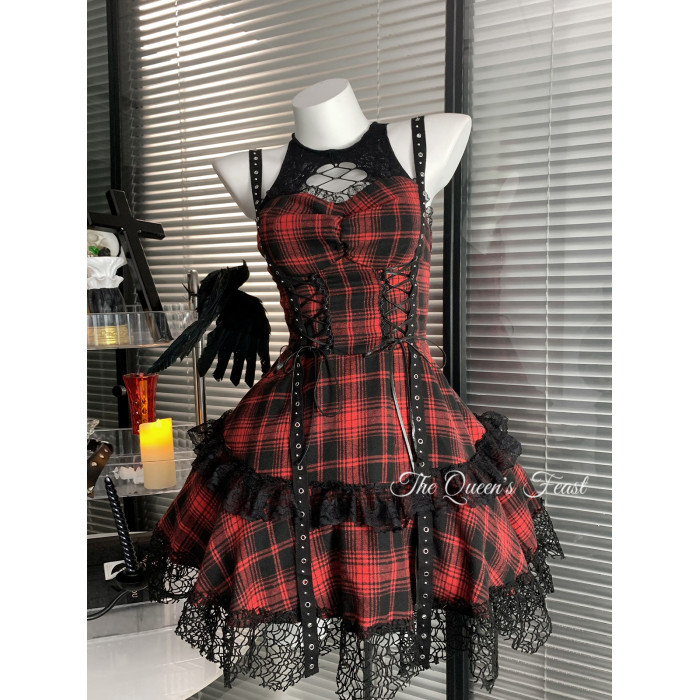 搖滾辣妹|亞文化暗黑蕾絲吊帶連衣裙哥特龐克風紅黑裙子辣妹穿搭