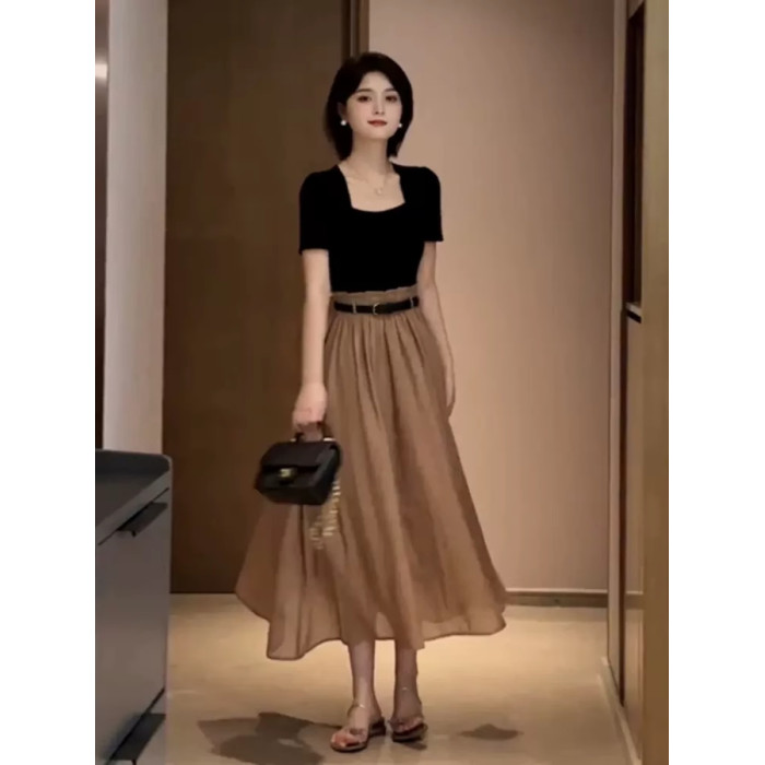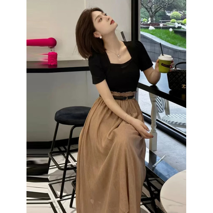 歐洲站2025新款桔梗法式氣質長裙高冷禦姐風假兩件拼接連衣裙女夏