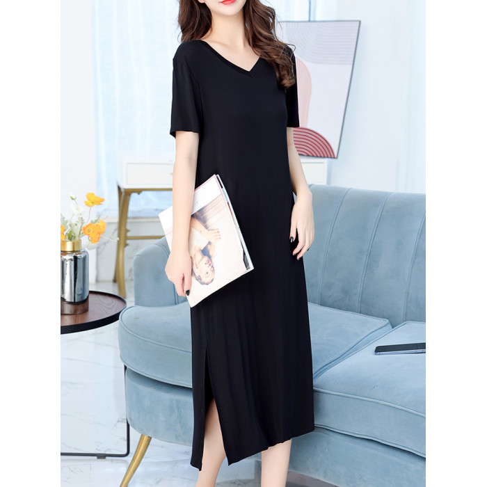 莫代爾新款V領短袖冰絲睡裙薄款寬松睡裙家居服可外穿休閒連衣裙