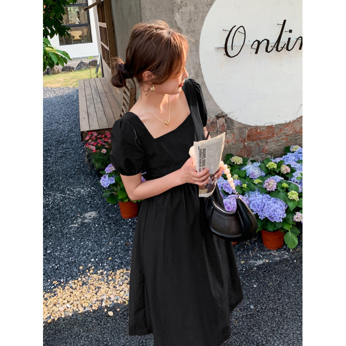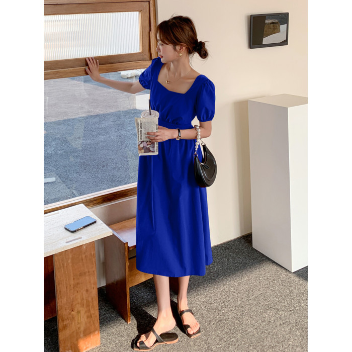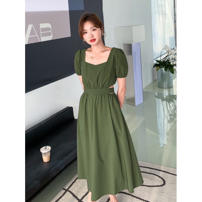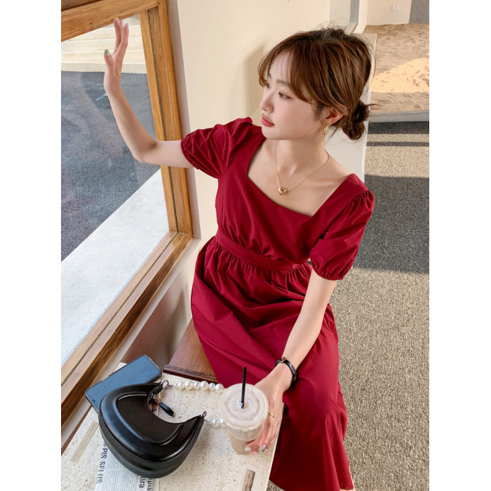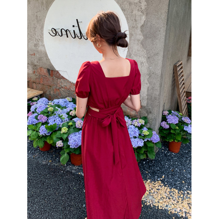 別致小心機設計後背露腰紅色連衣裙女夏季新款方領顯瘦訂婚長裙子