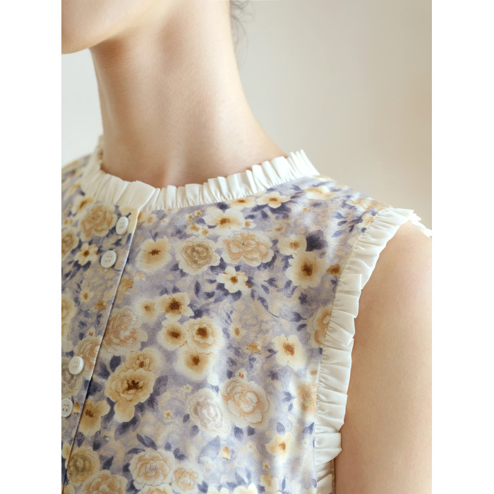 領口與袖口処,精心點綴著細膩的白色木耳花邊壓褶