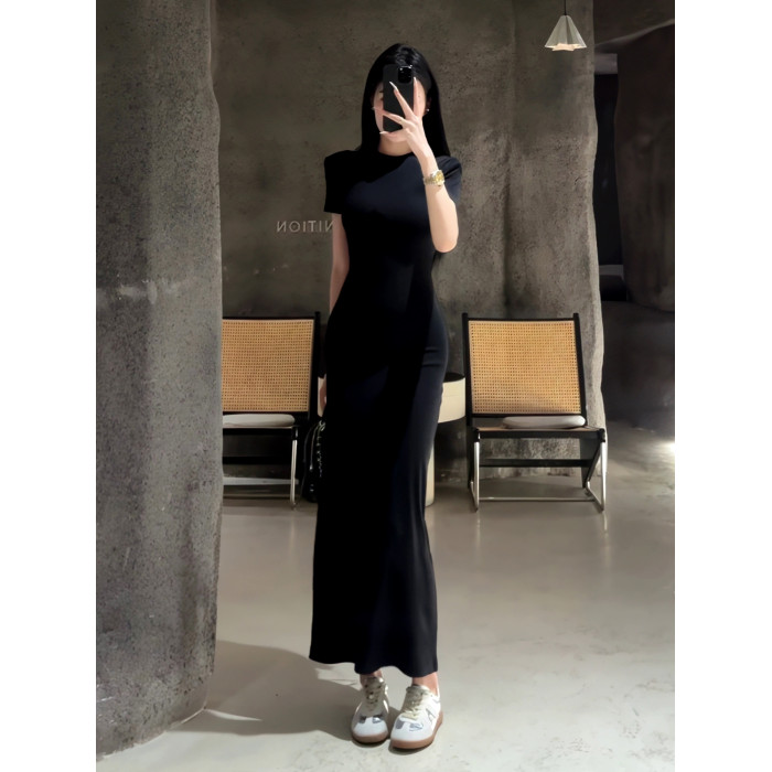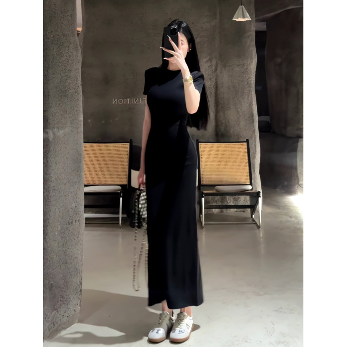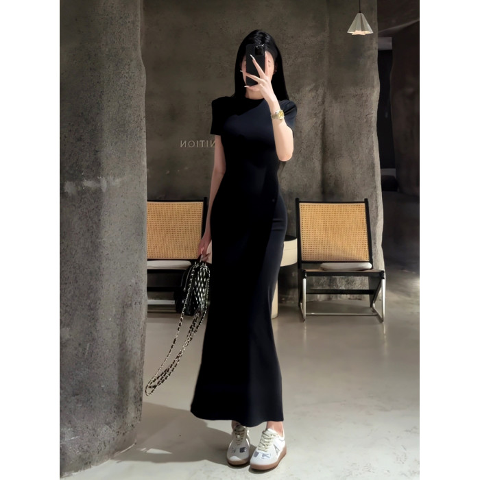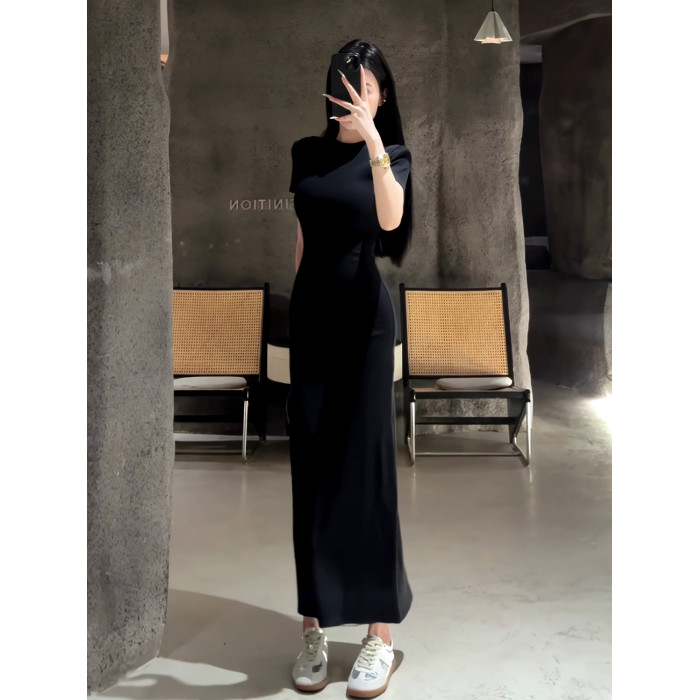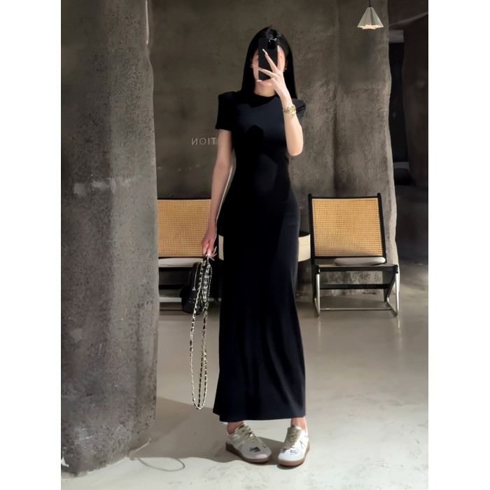 黑色短袖連衣裙女夏季2025新款高級感彈力收腰顯瘦小個子包臀長裙