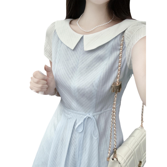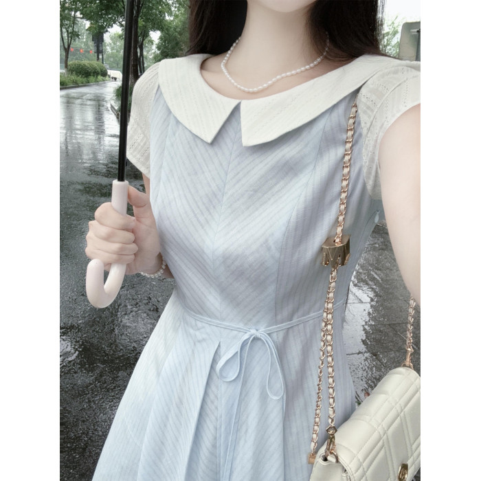 2025新款法式娃娃領藍色連衣裙子女夏季爆款獨特漂亮絕美溫柔長裙