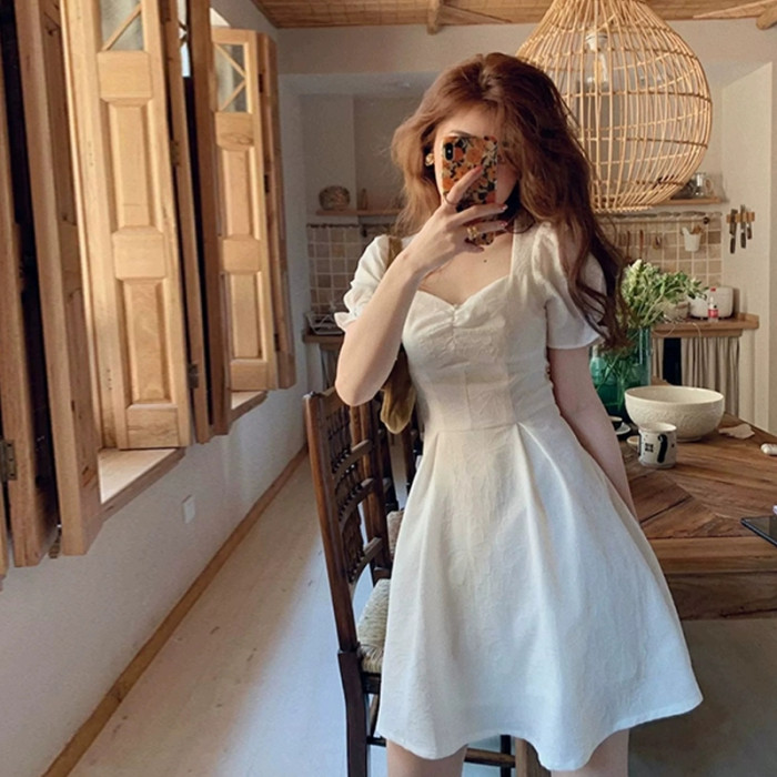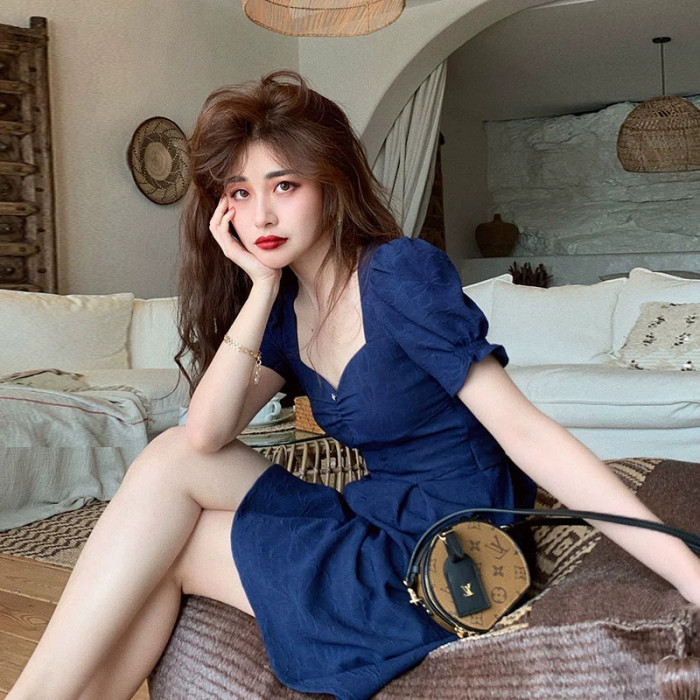 歐洲站2025年新款法式復古泡泡袖洋氣減齡藍色方領連衣裙子女夏季