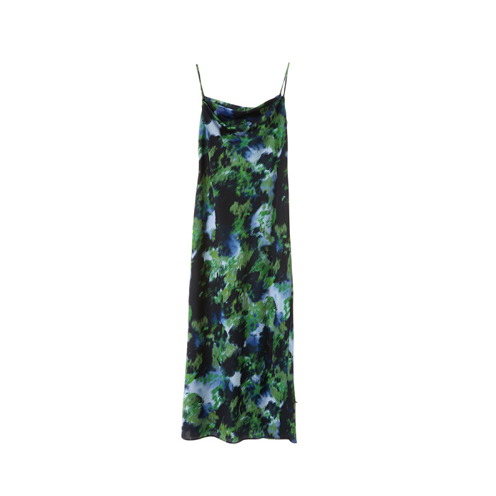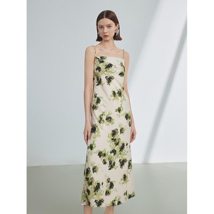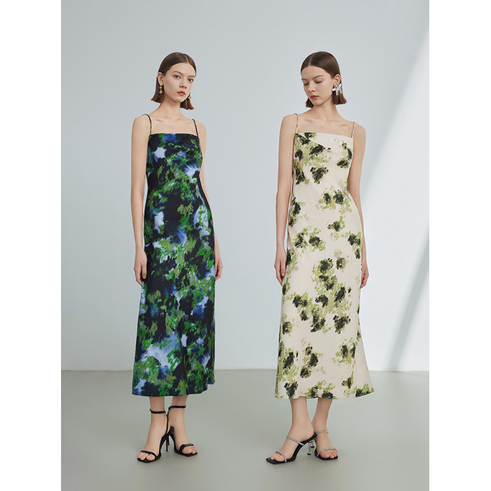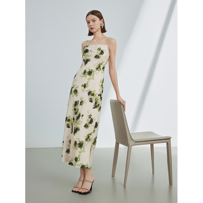 朗姿法式吊帶蕩領設計感印花長裙夏季新款女2024氣質高級感連衣裙