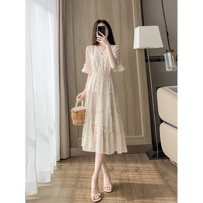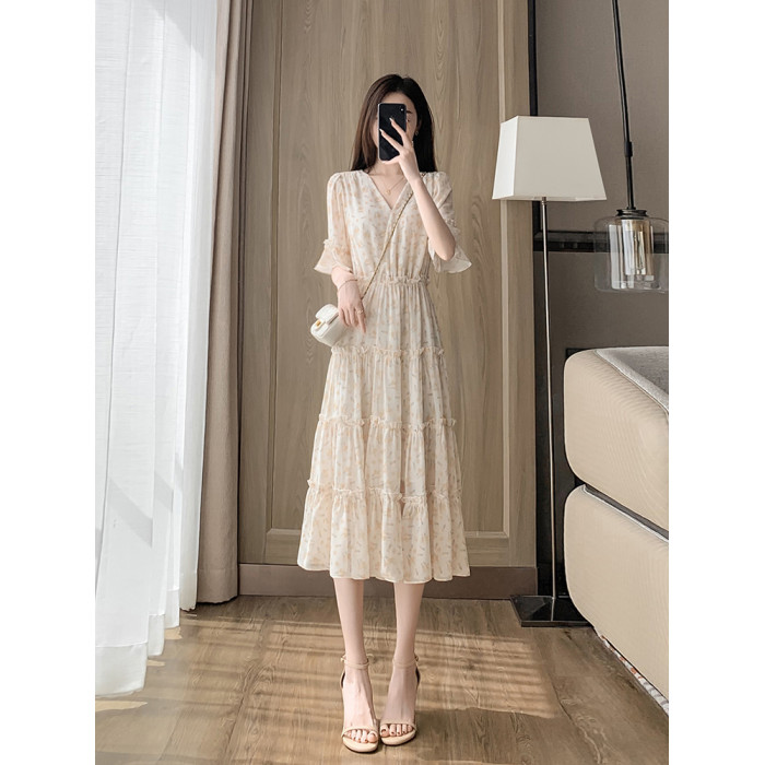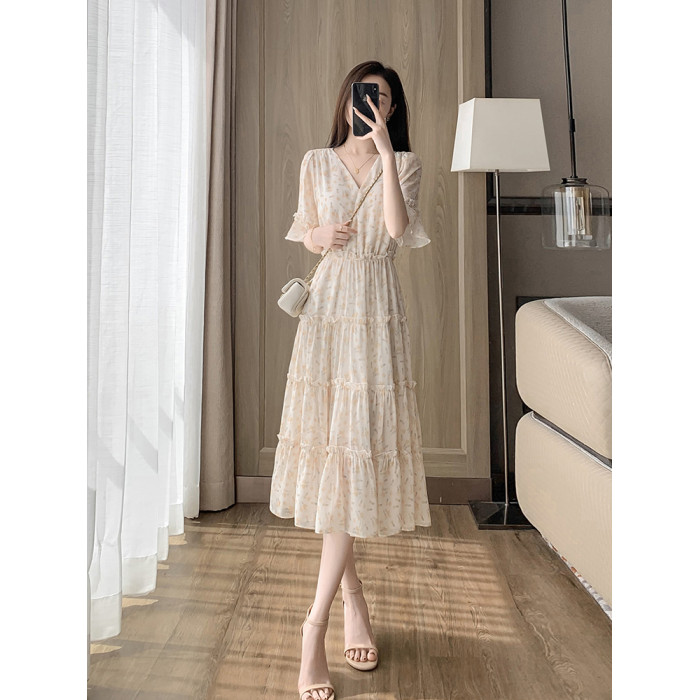 超仙溫柔風雪紡碎花連衣裙女2025新款夏季氣質v領收腰茶歇a字裙子