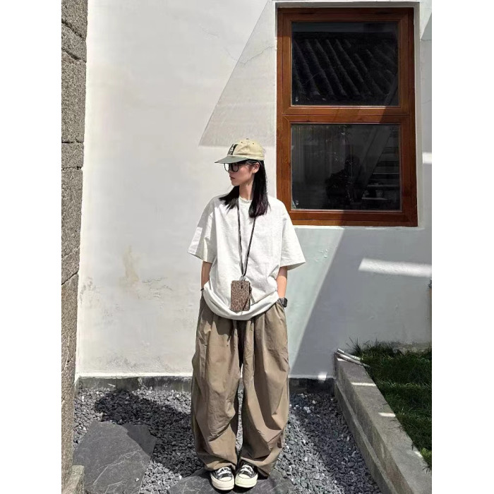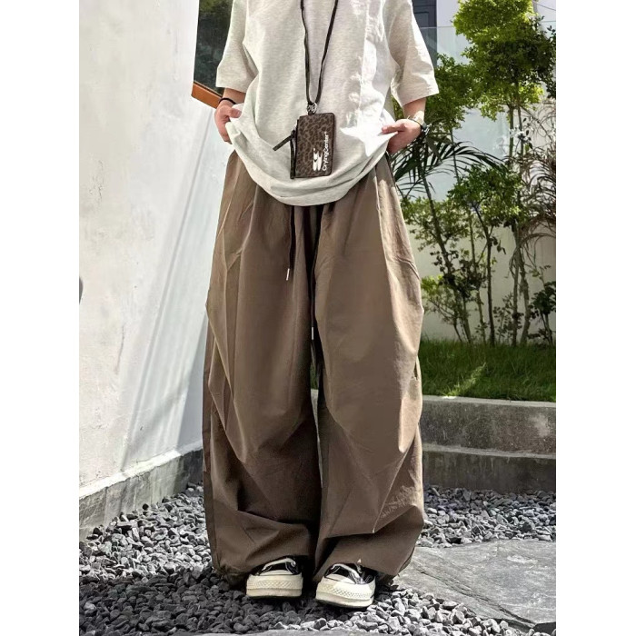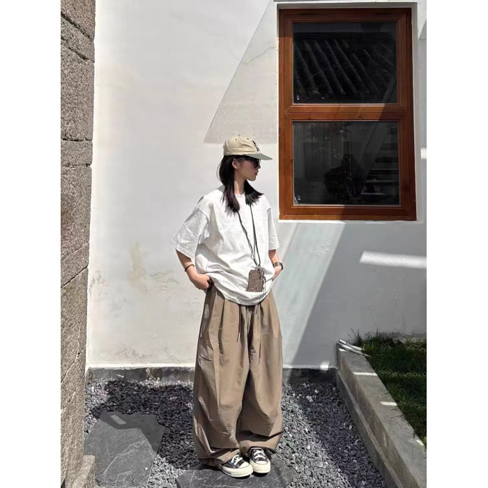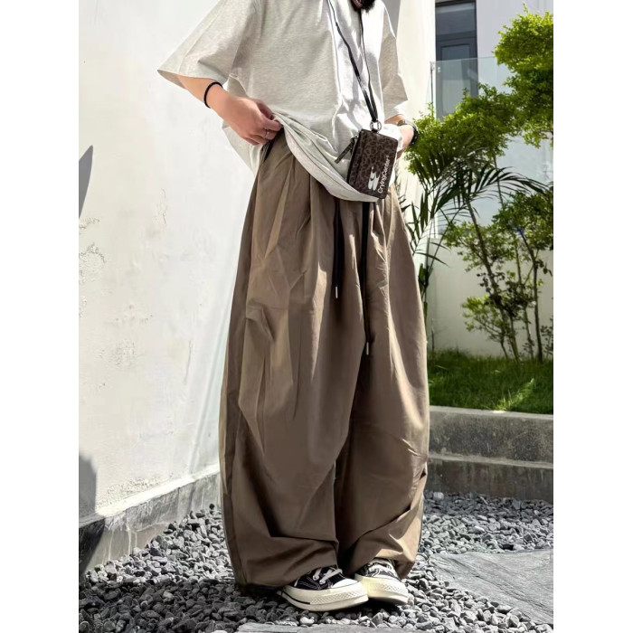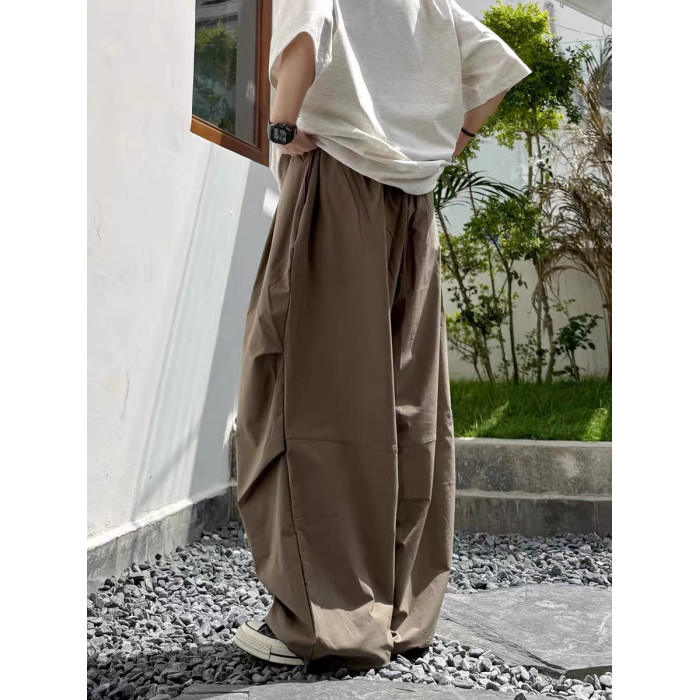 日系復古純色寬松褶皺水洗濶腿褲男女春夏百搭抽繩彎刀褲輕薄長褲