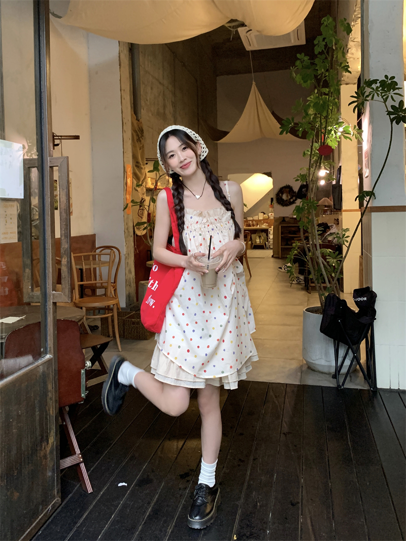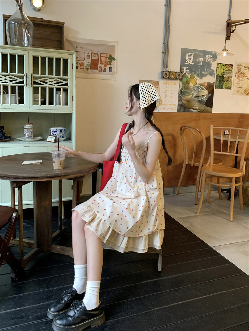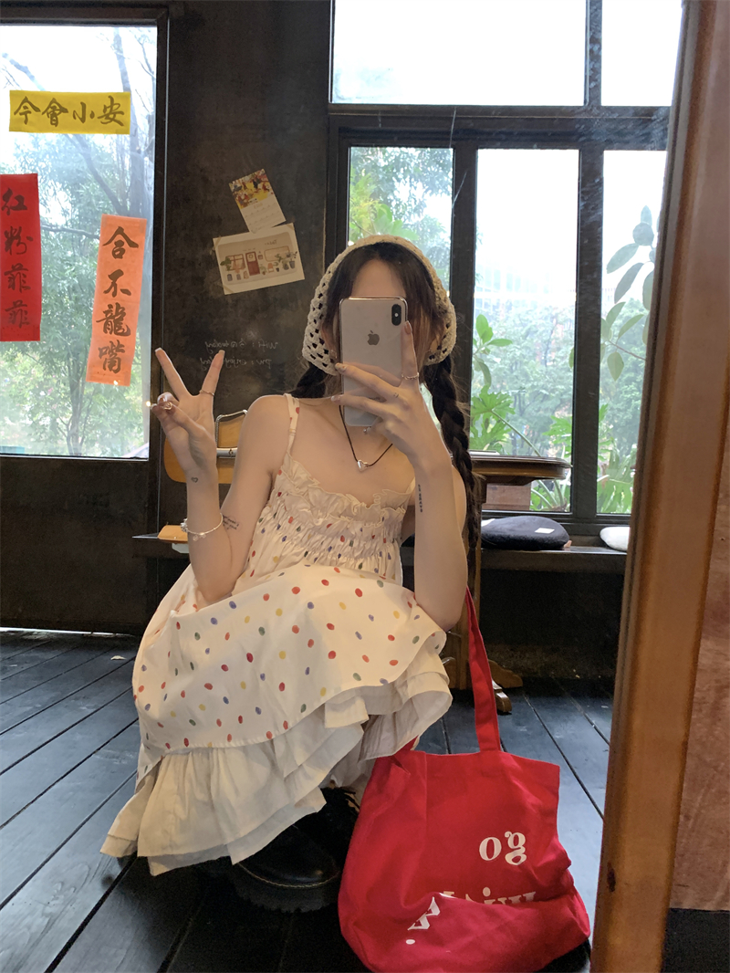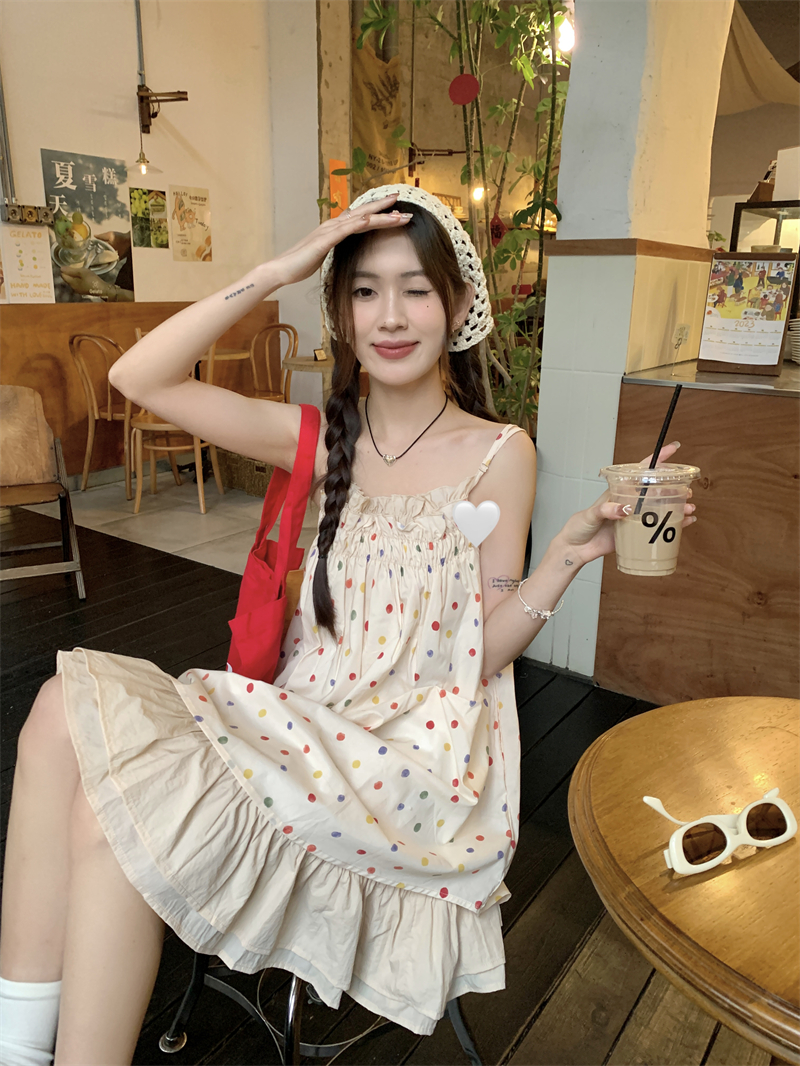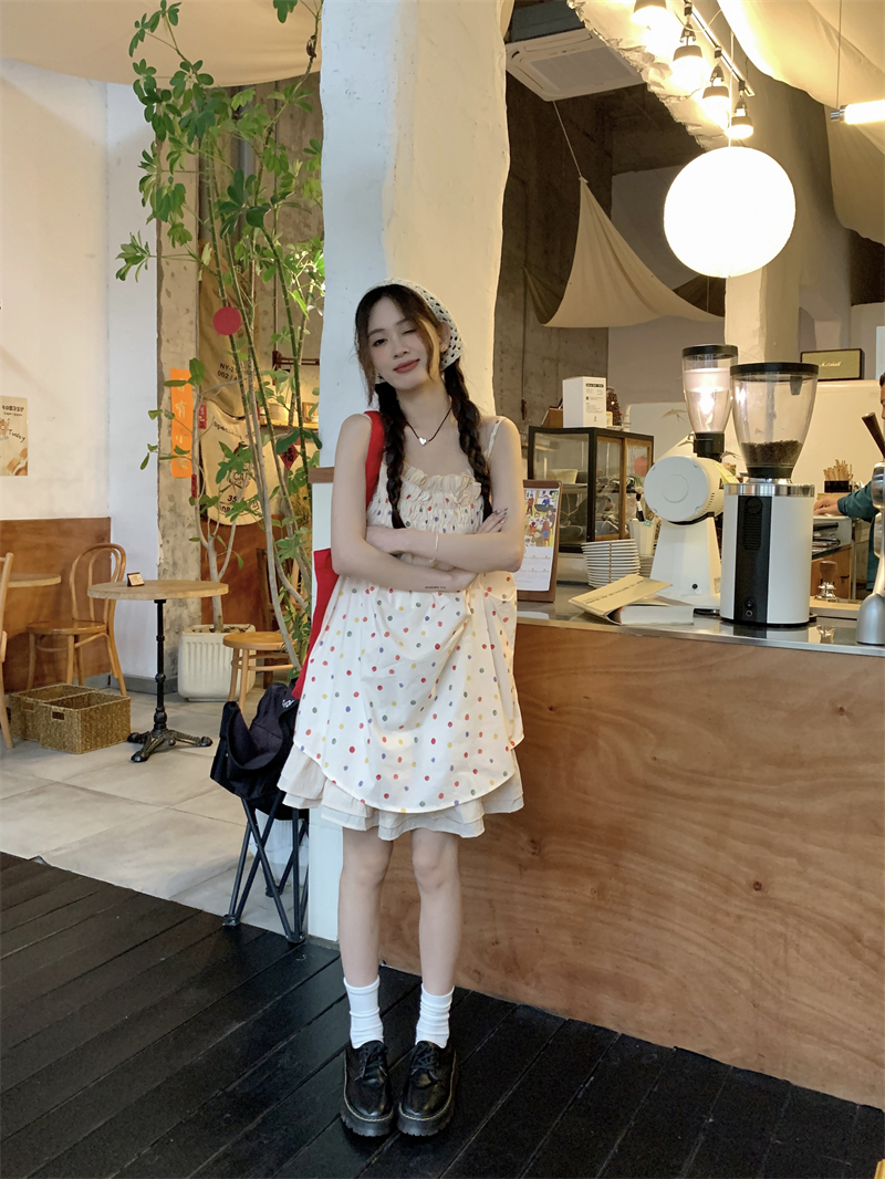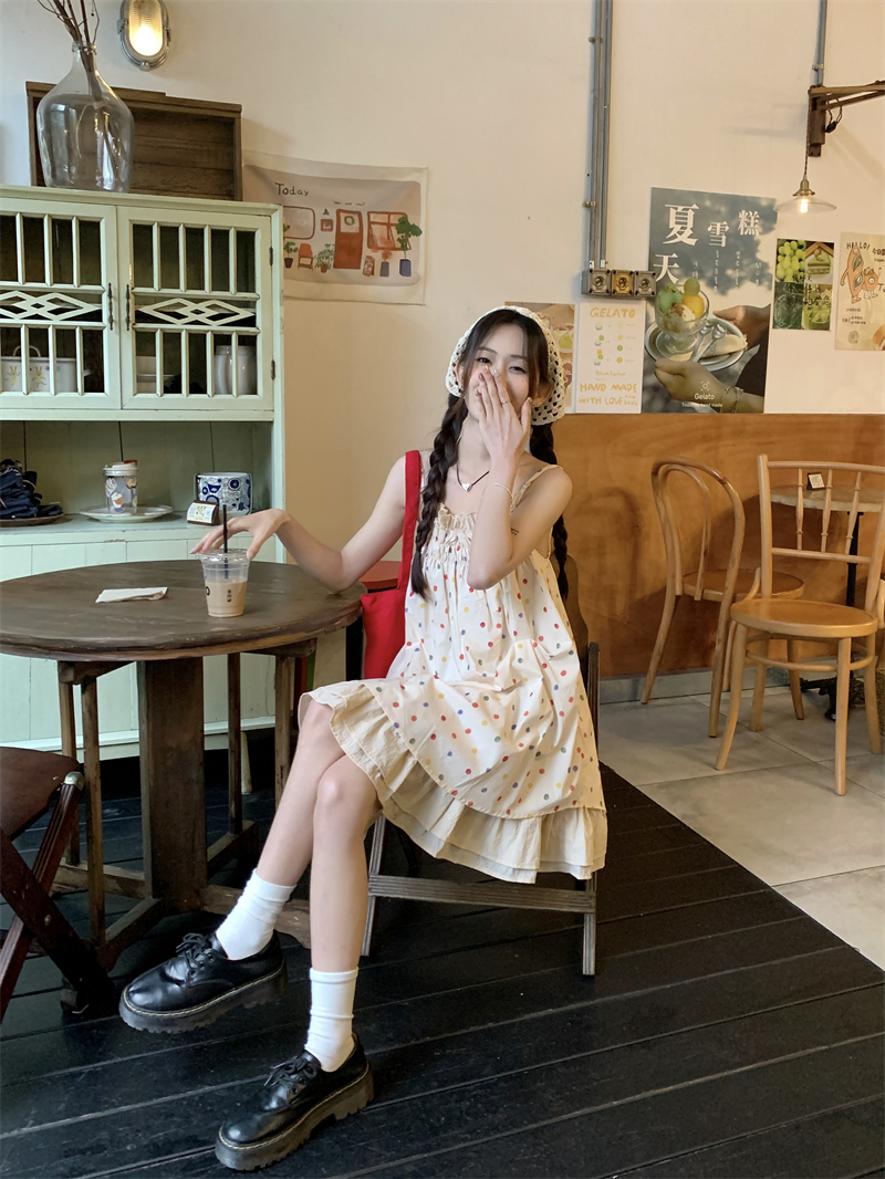 我在外面有 “告白氣球”日系小衆復古少女波點吊帶連衣裙女夏