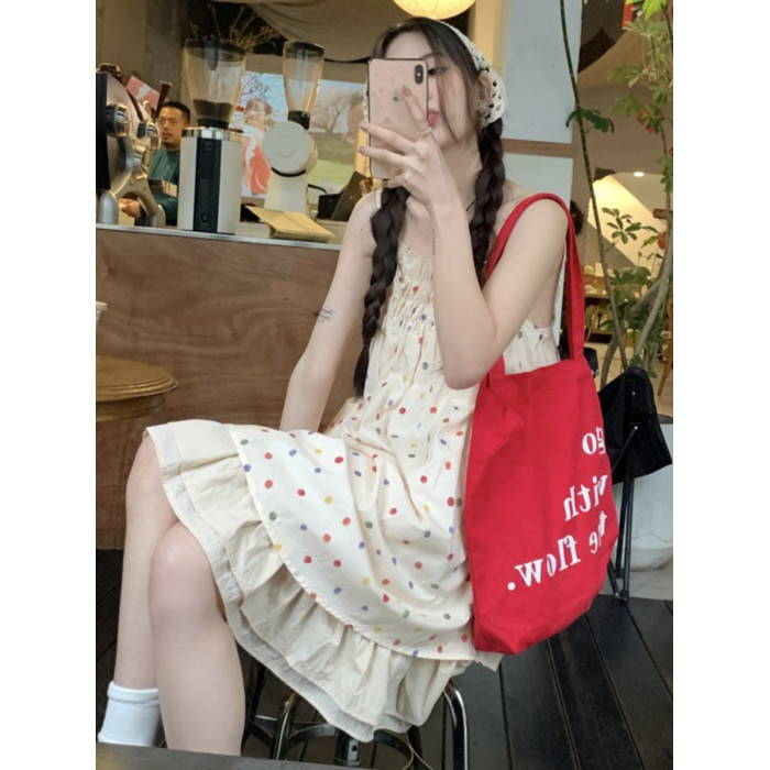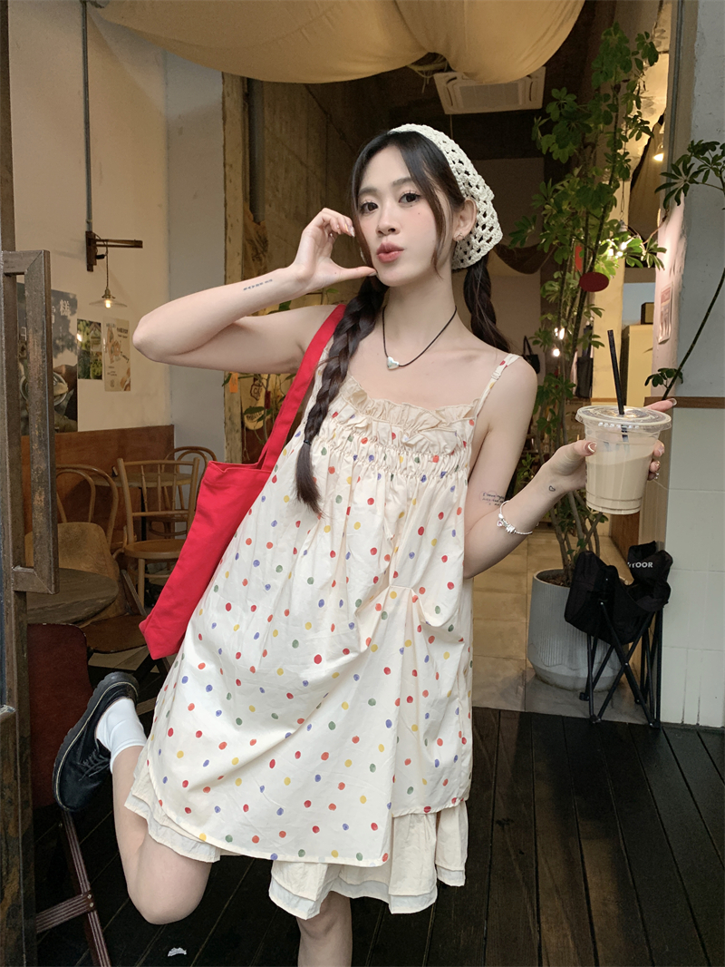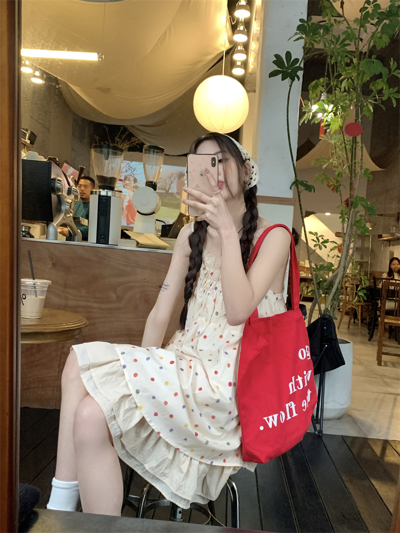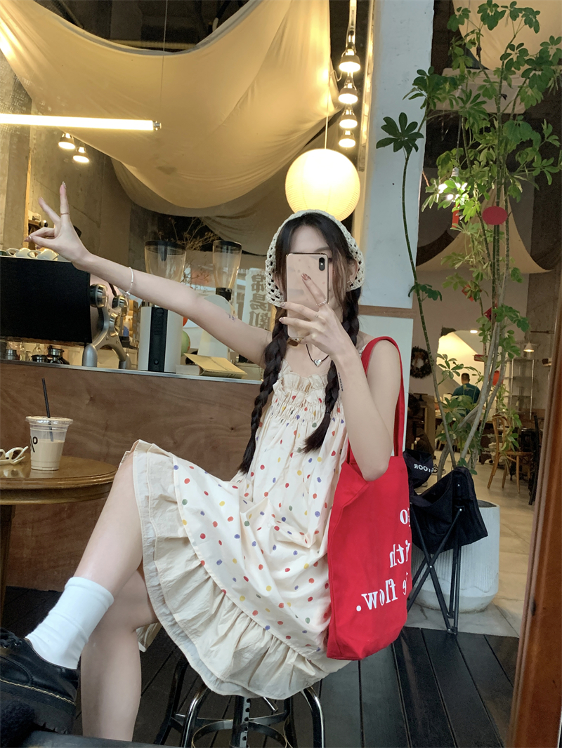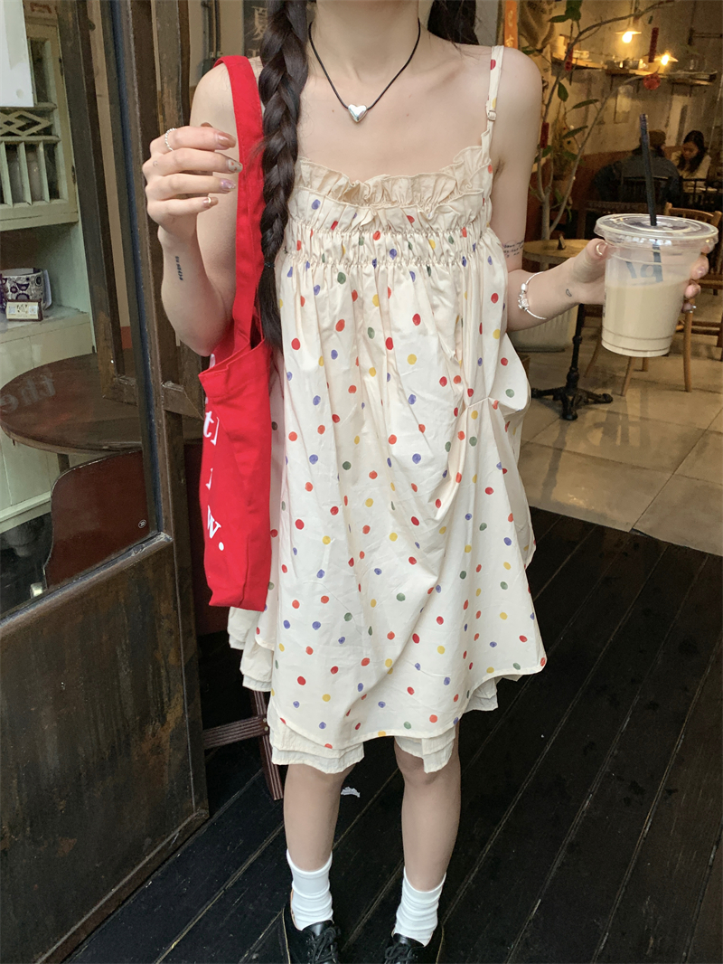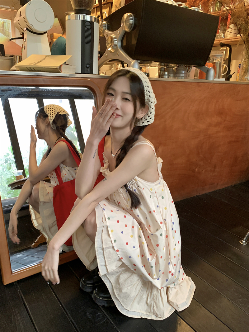 我在外面有 “告白氣球”日系小衆復古少女波點吊帶連衣裙女夏