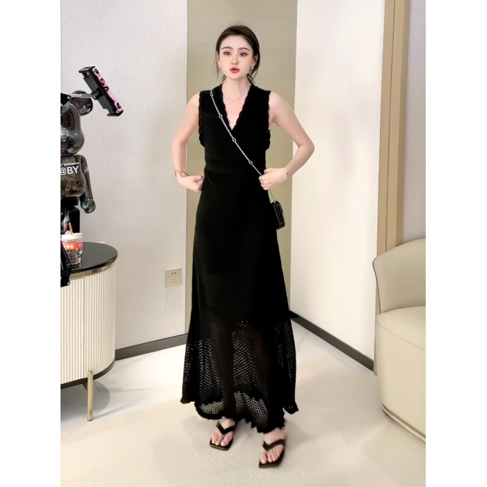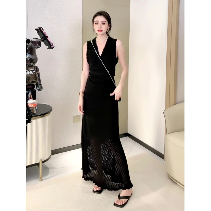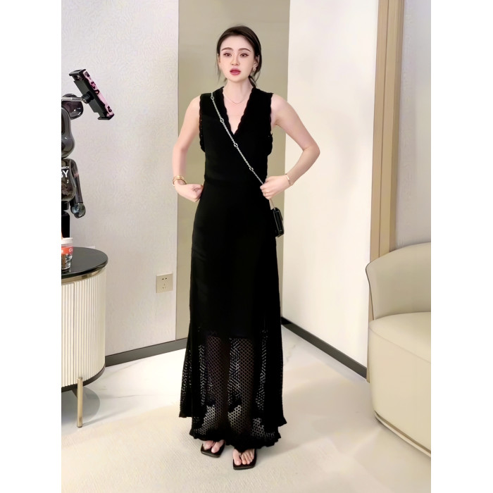 法式針織吊帶連衣裙女夏季設計感高腰V領勾花鏤空高級感長款裙子