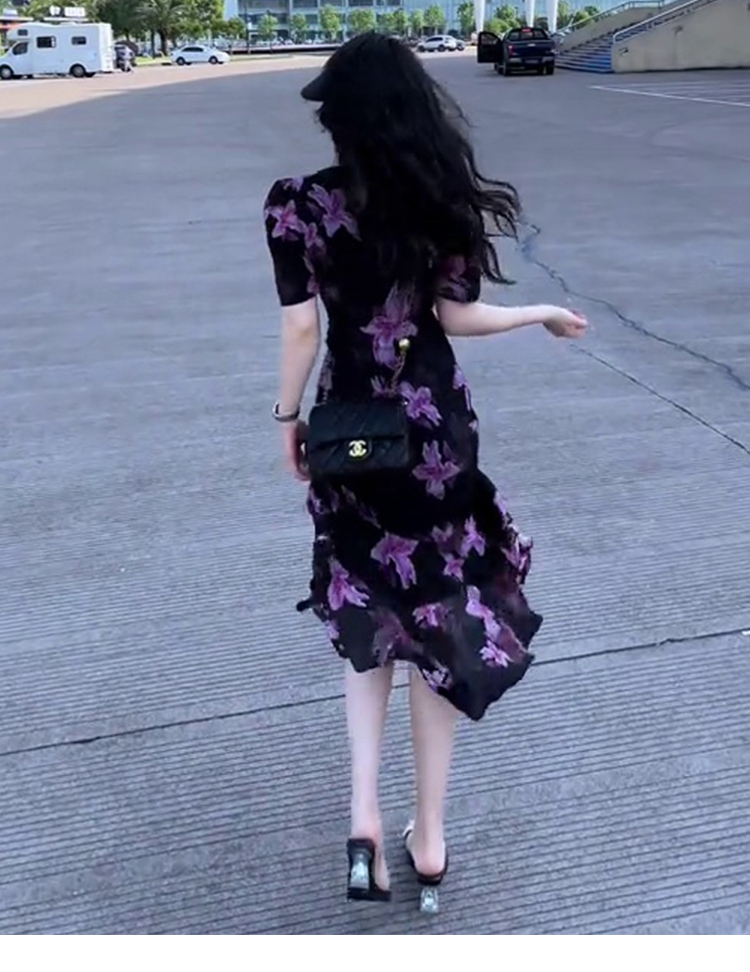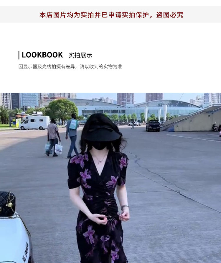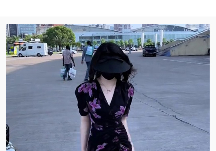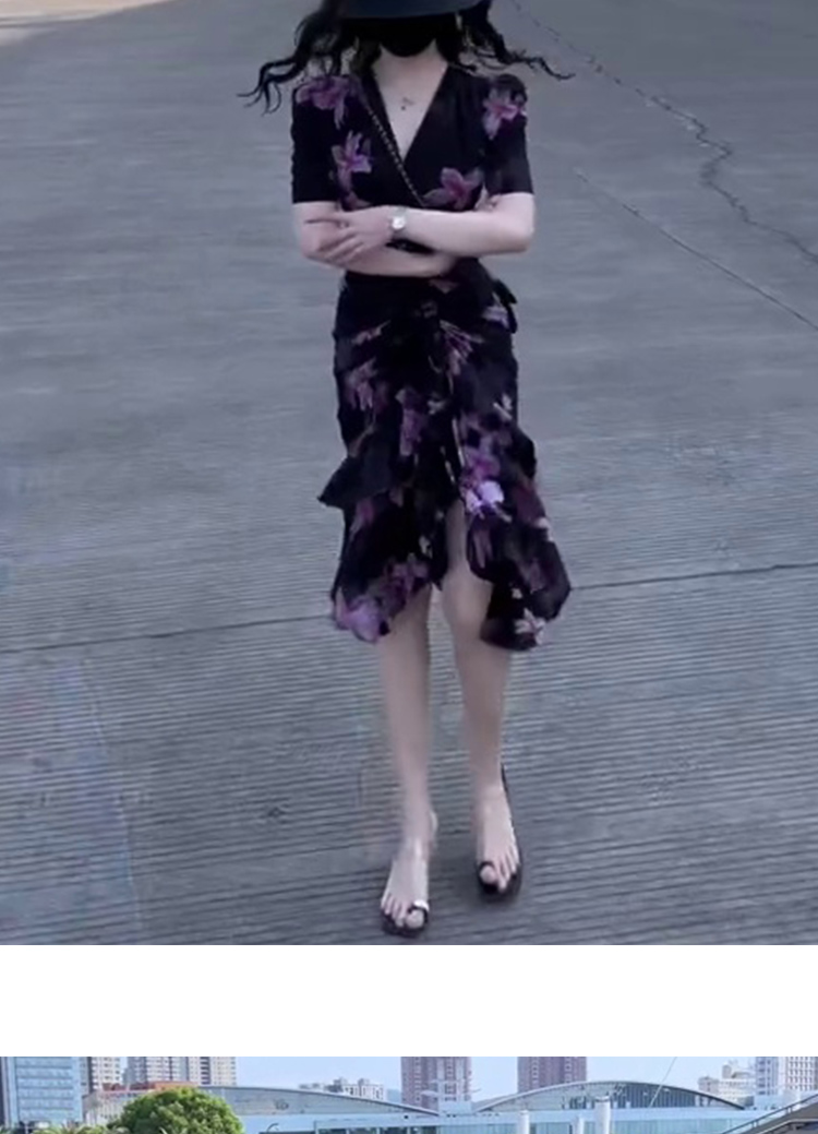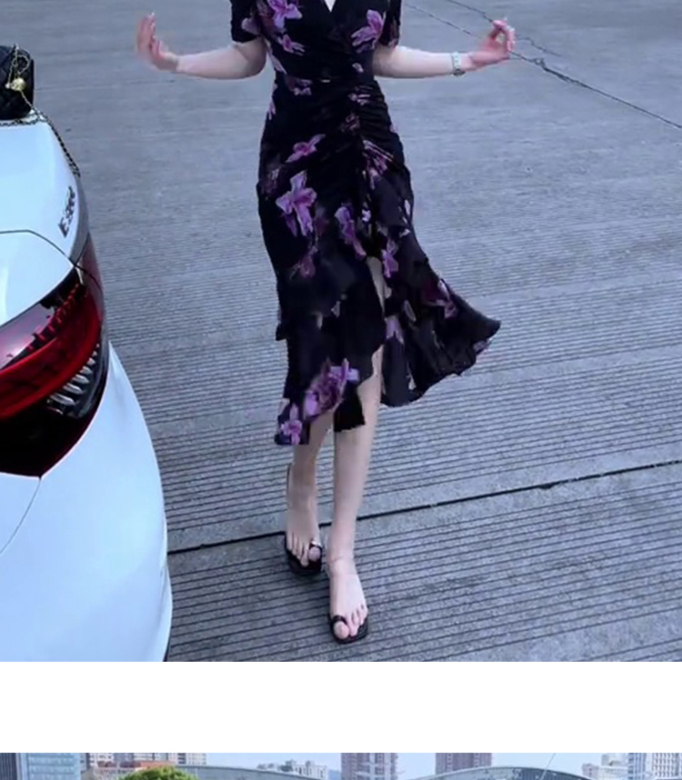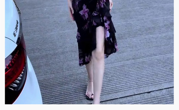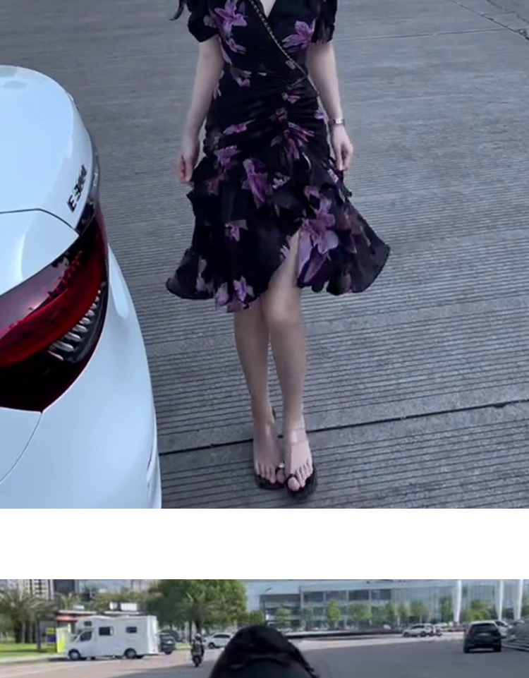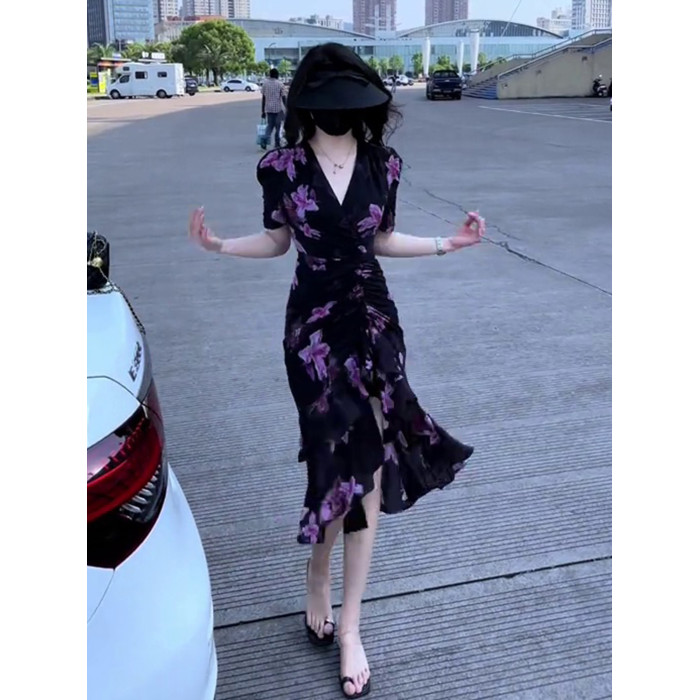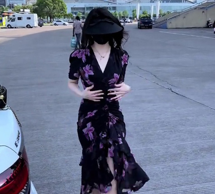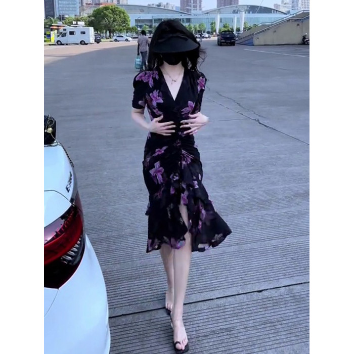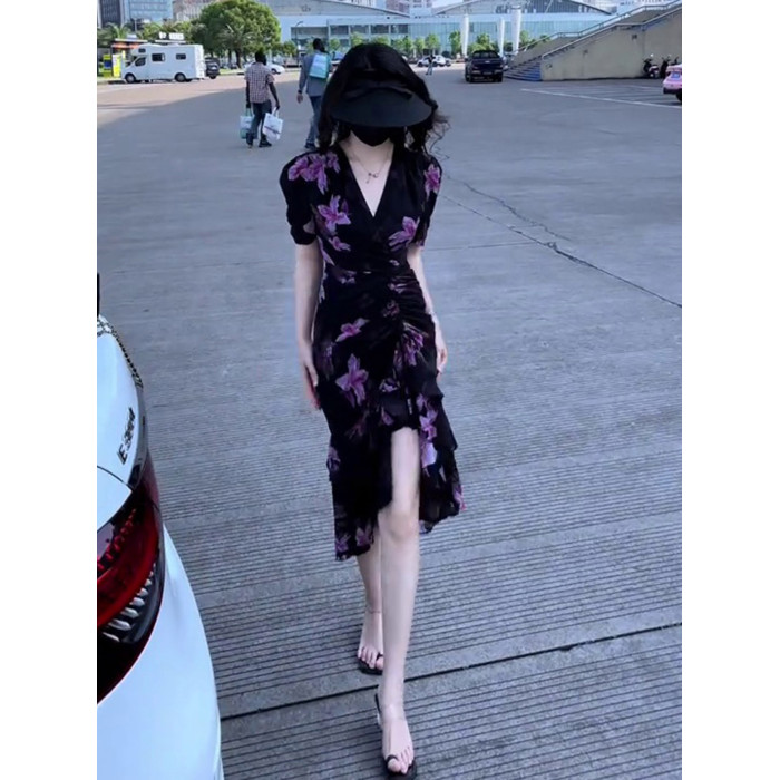 2025夏季新款法式小衆設計不規則雪紡裙修身顯瘦V領碎花連衣裙女