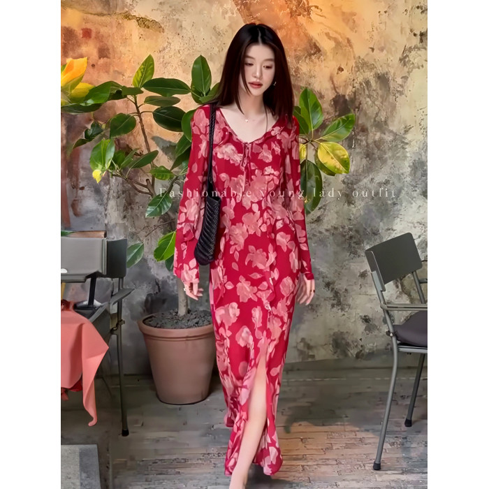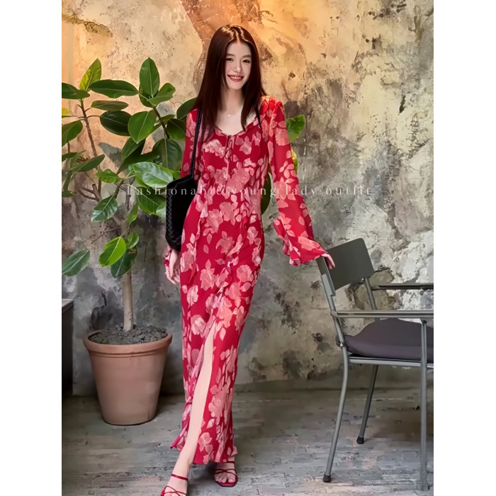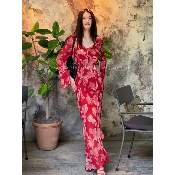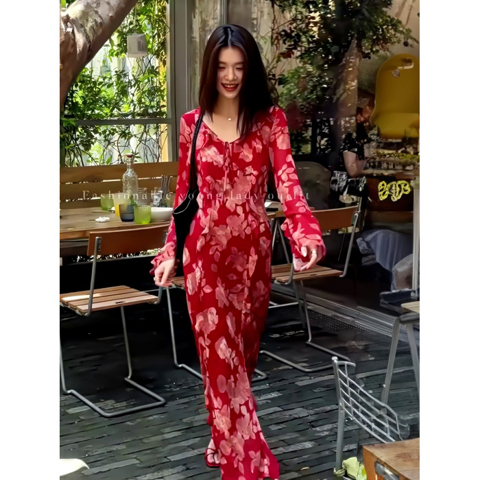 紅色碎花連衣裙女夏季2025新款高級感法式雪紡薄紗收腰氣質長裙子