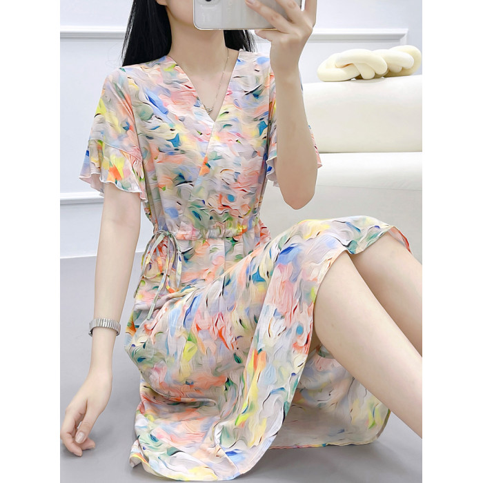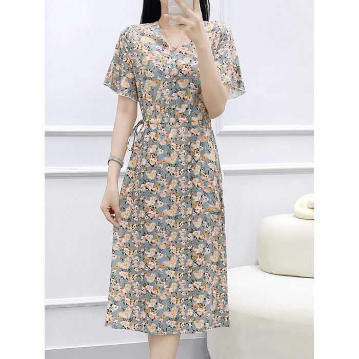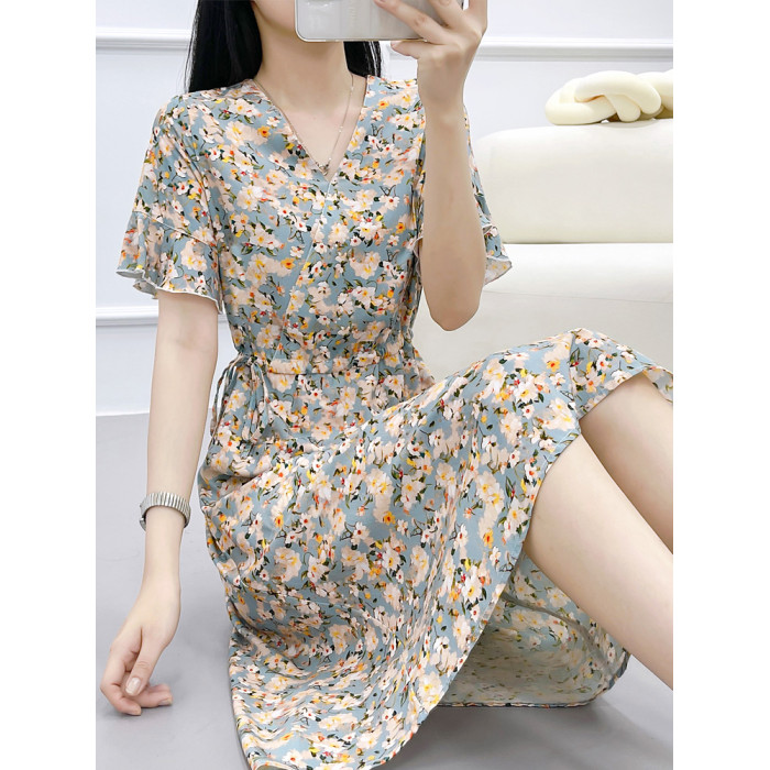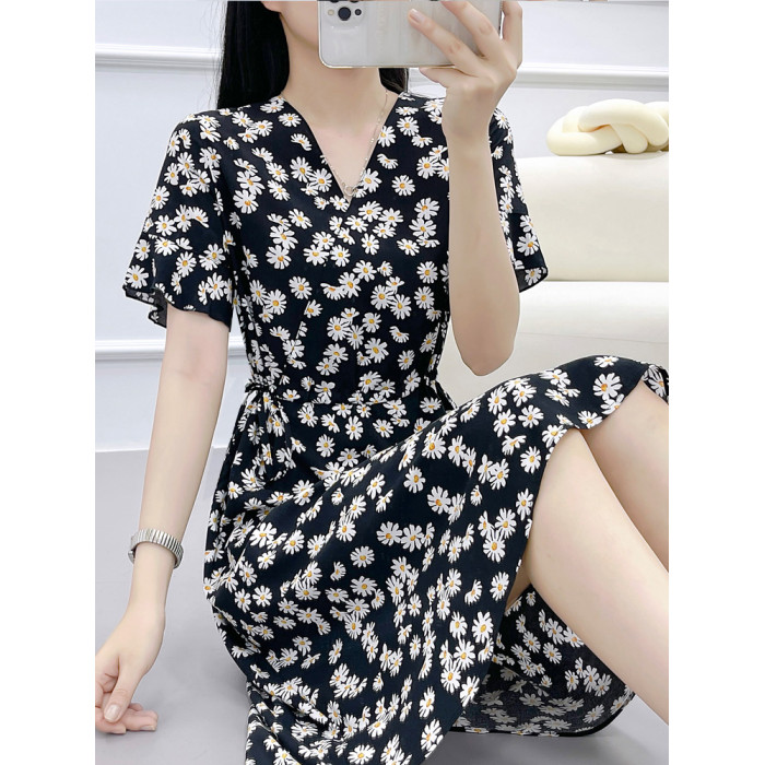高級碎花小雛菊棉綢連衣裙2025新款女夏V領綿綢氣質收腰外穿裙子