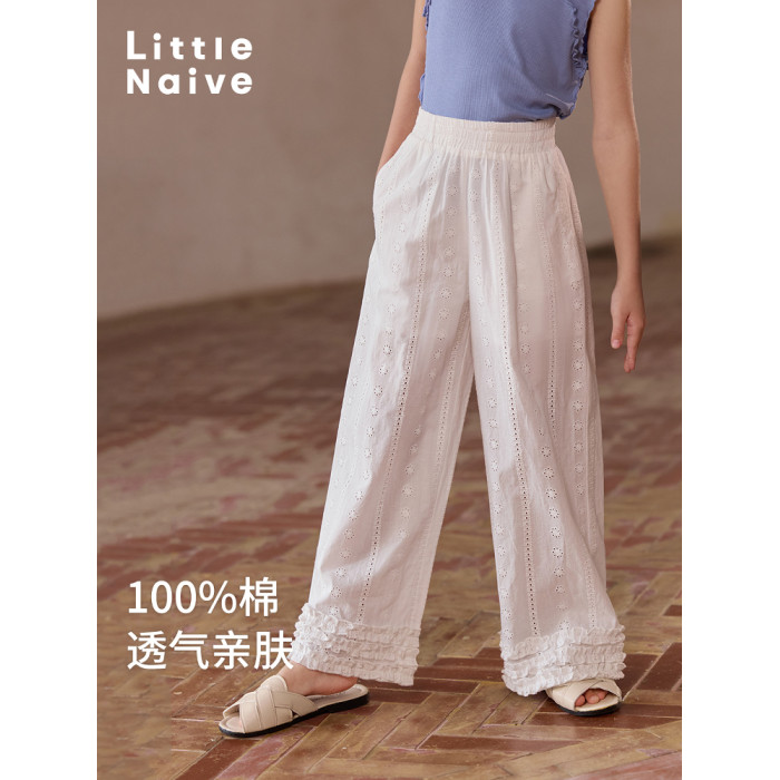 Little Naive女童法式浪漫休閒褲夏季花邊鏤空刺綉褲子兒童直筒褲