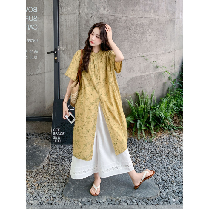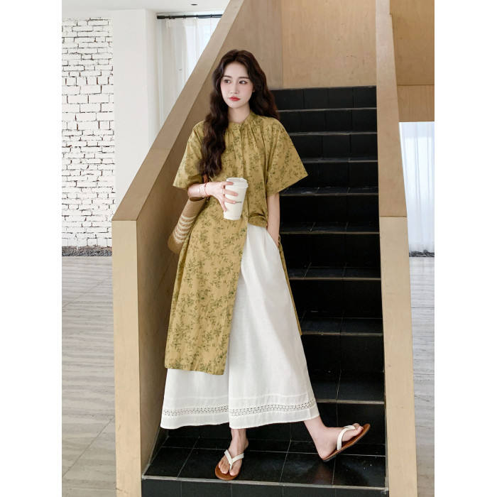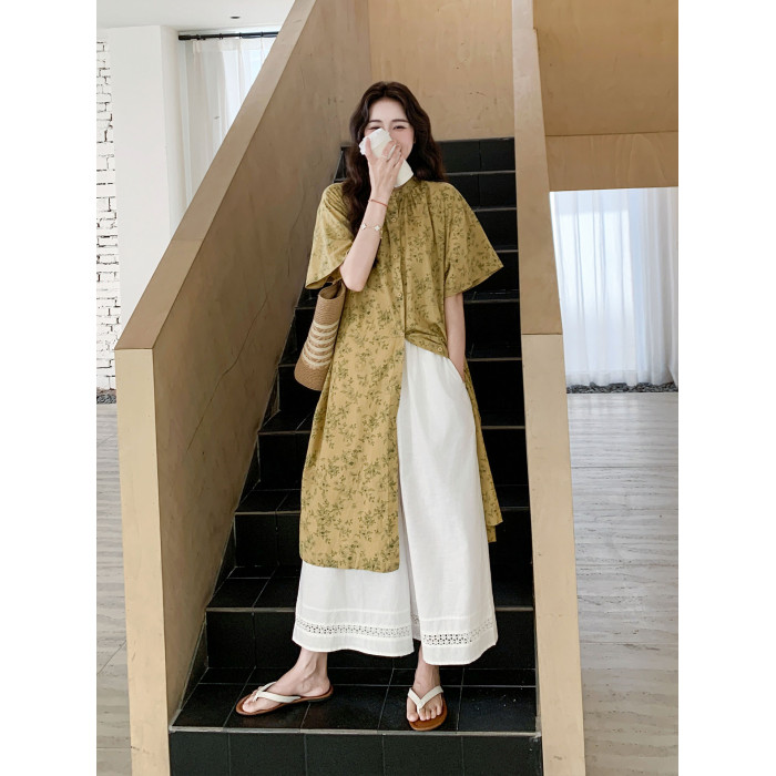 黃色碎花新中式襯衫裙濶腿褲套裝2025新款女夏曡穿國風罩衫連衣裙