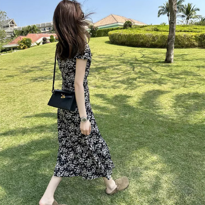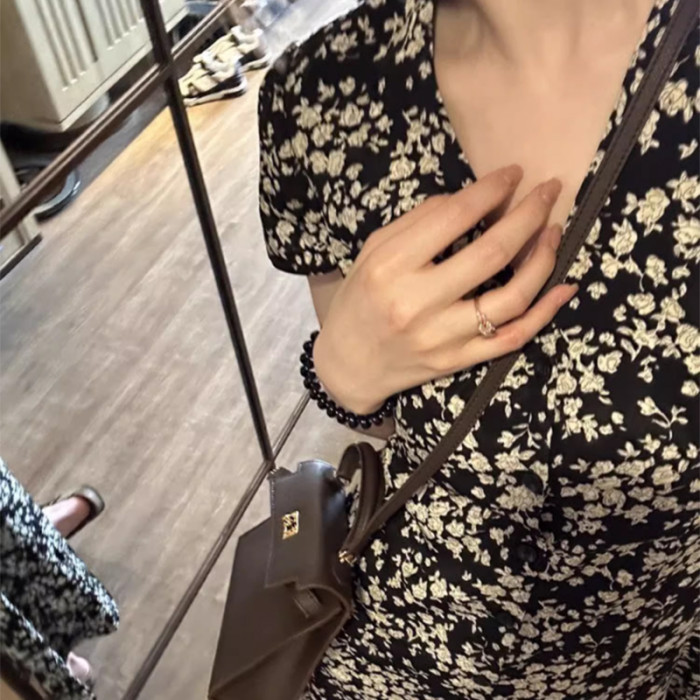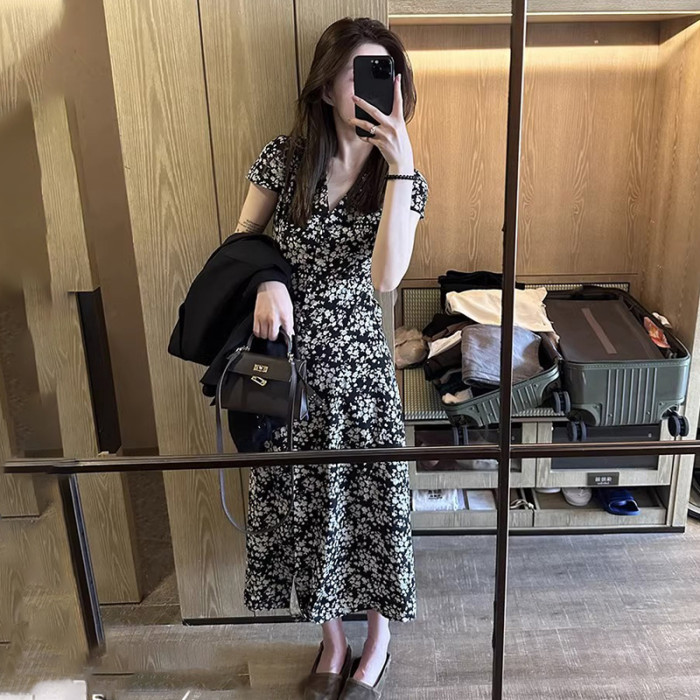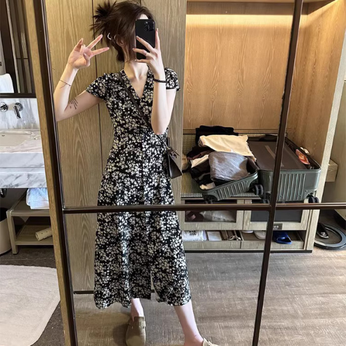 明星同款2025夏季新款修身顯瘦韓版復古氣質v領碎花雪紡連衣裙女