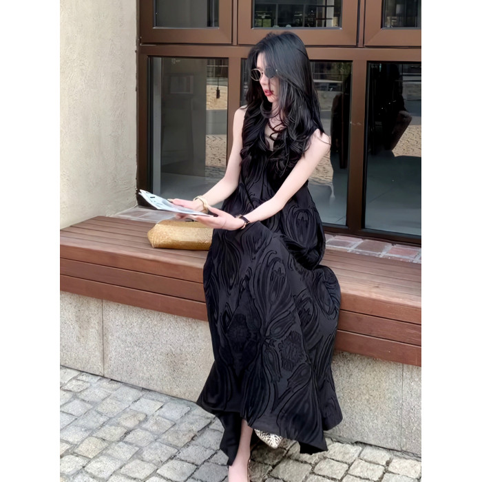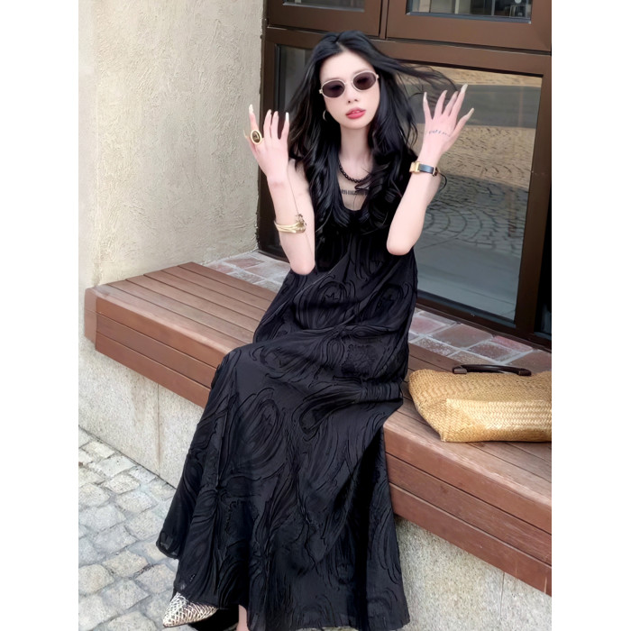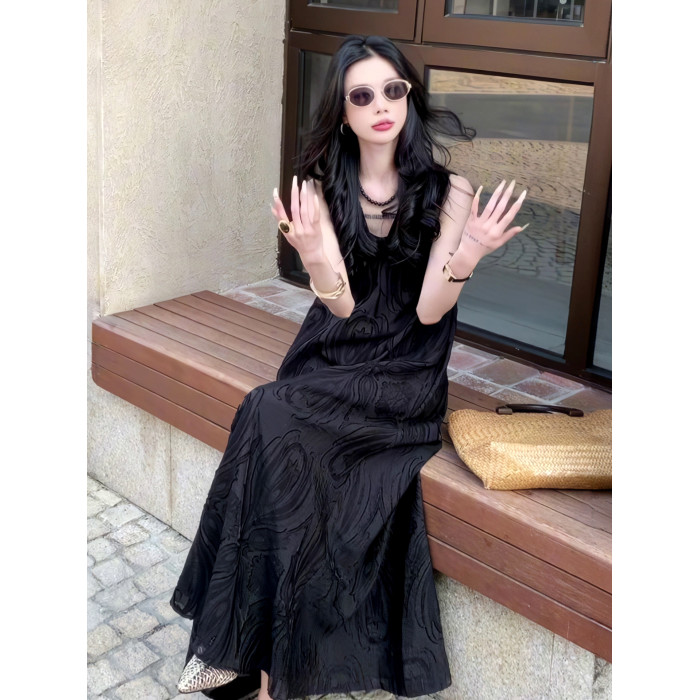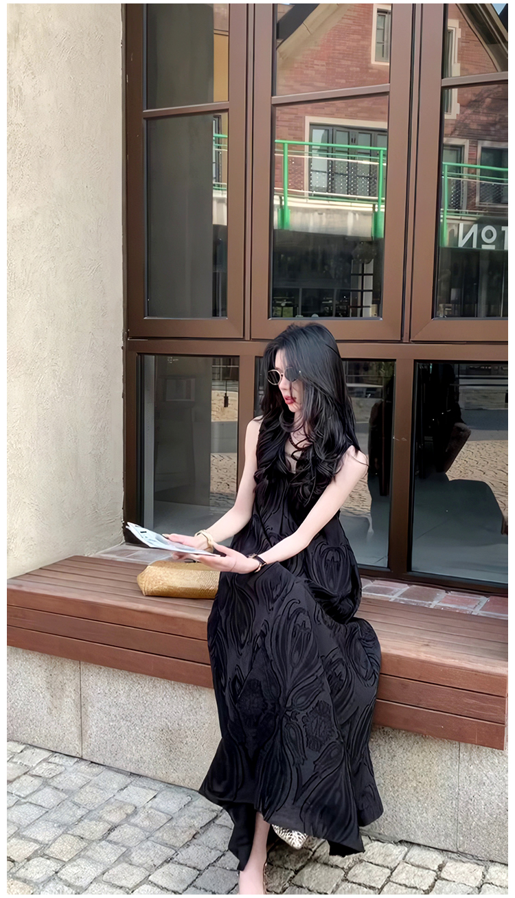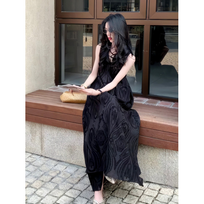 極簡風氣質提花高級V領連衣裙2025夏季新款小衆輕奢禮服長裙女裝