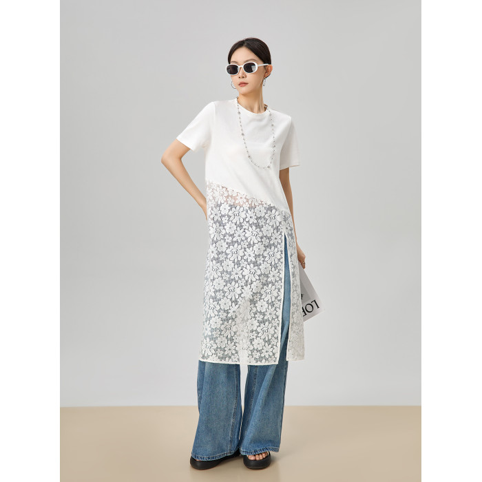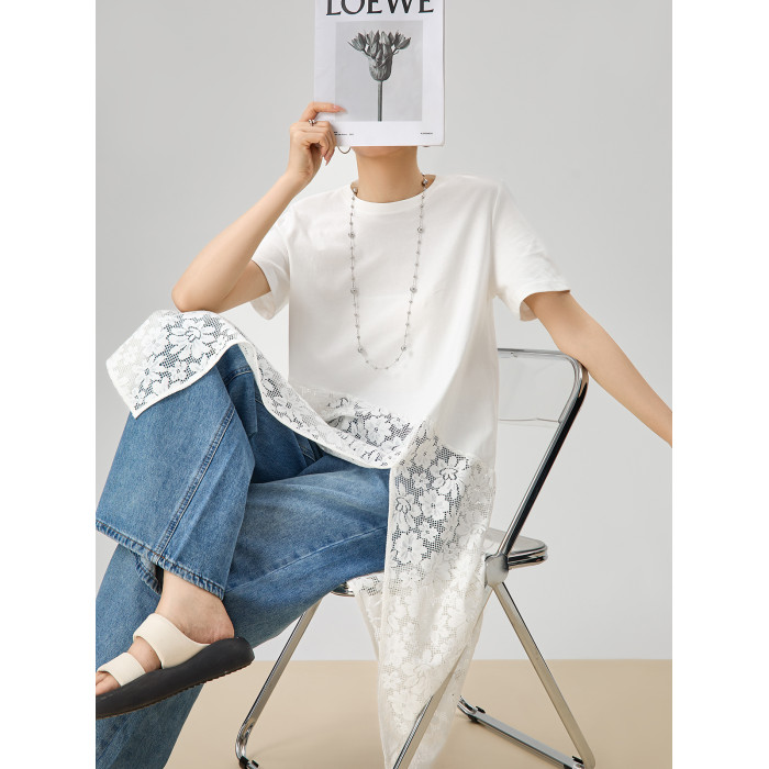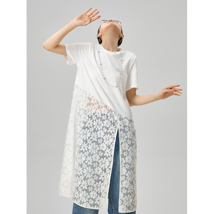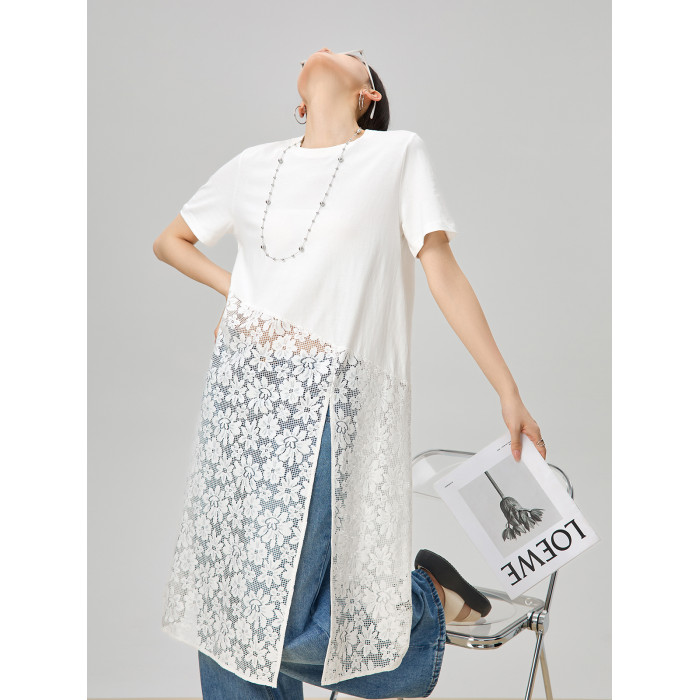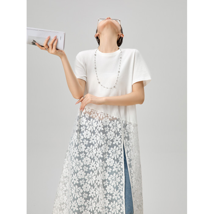 顧裡裡Guuli/白色鏤空蕾絲拼接t恤連衣裙今年流行的漂亮裙子女夏