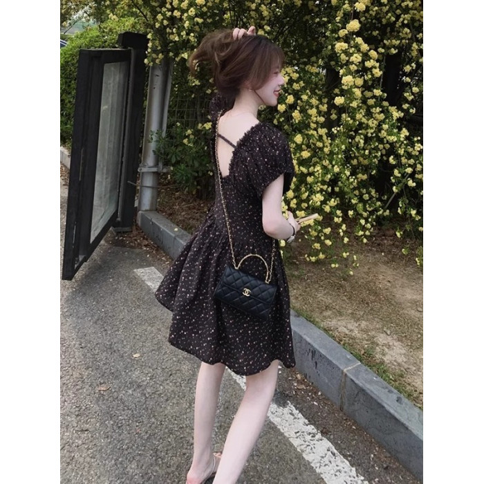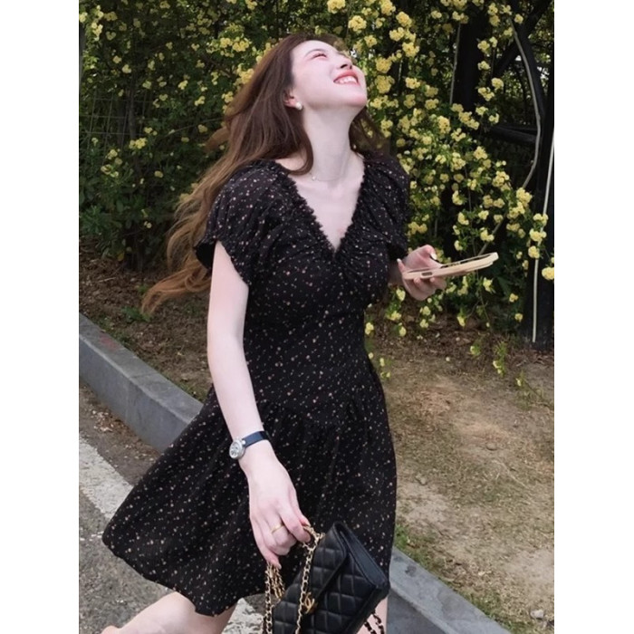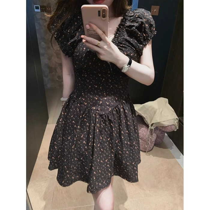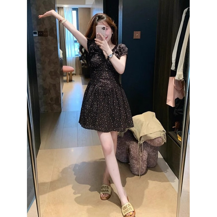 歐洲站2025新款法式高級感掐腰裙子女夏小個子修身顯瘦碎花連衣裙