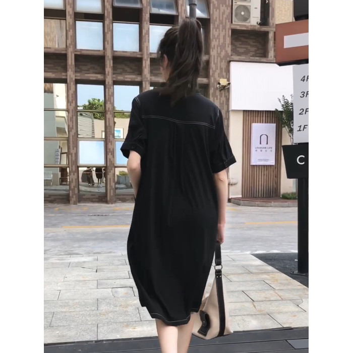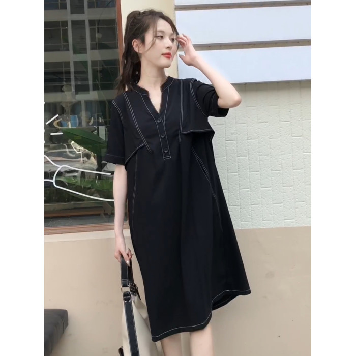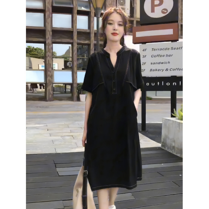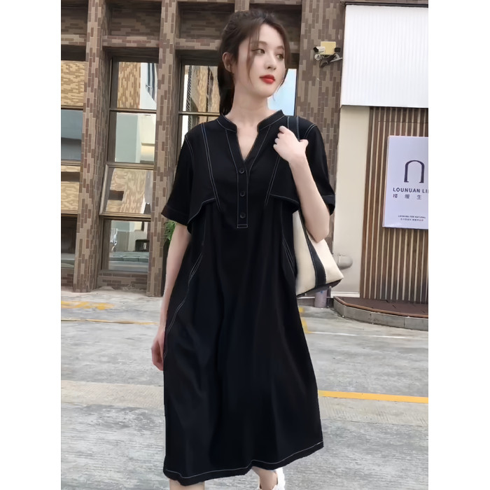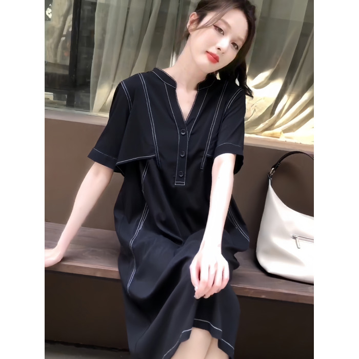 2025夏女士泰式新款黑色高級感氣質大碼V領A字裙寬松高級連衣裙