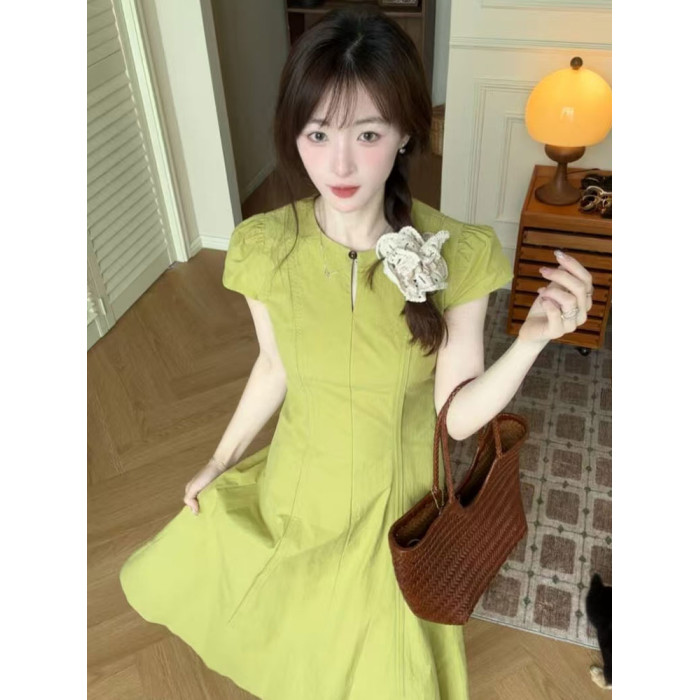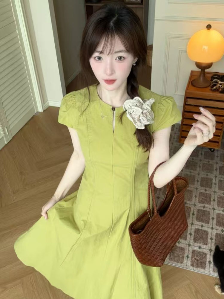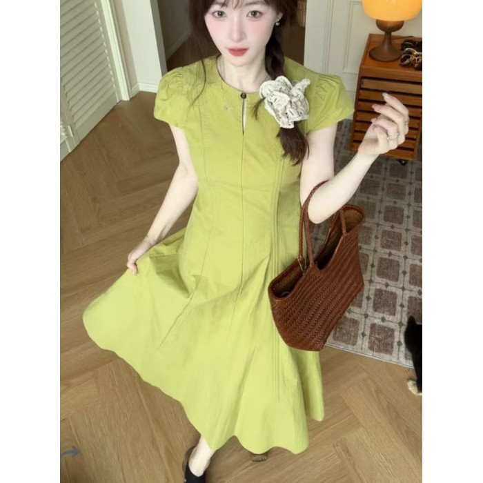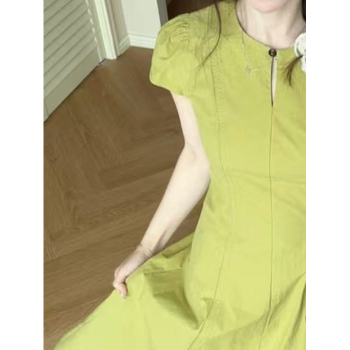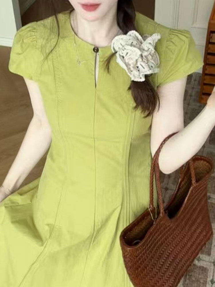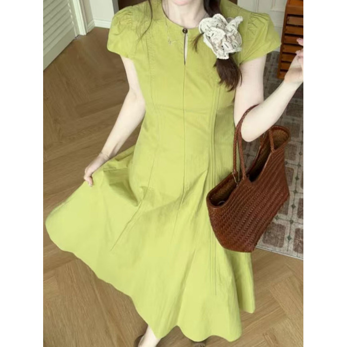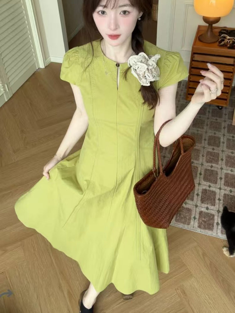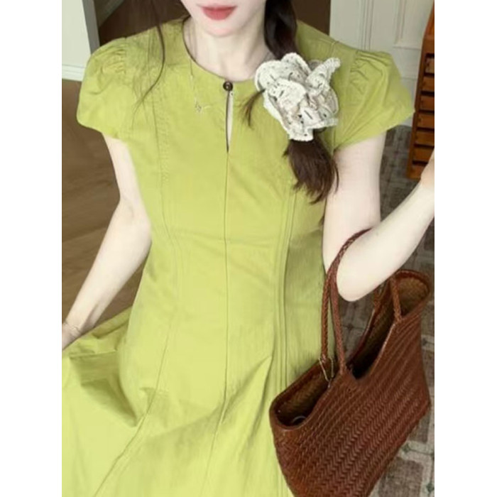 法式一粒釦牛油果綠圓領收腰連衣裙女夏季新款簡約氣質顯瘦長裙美