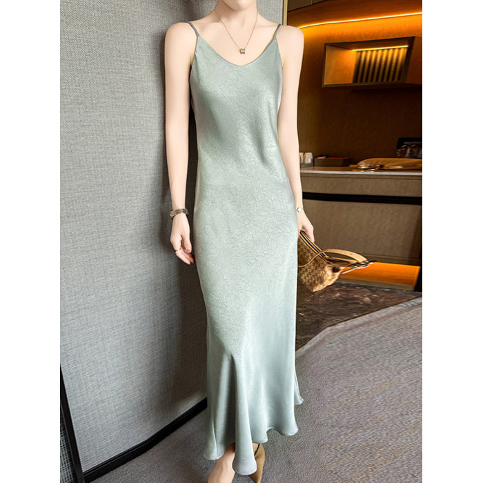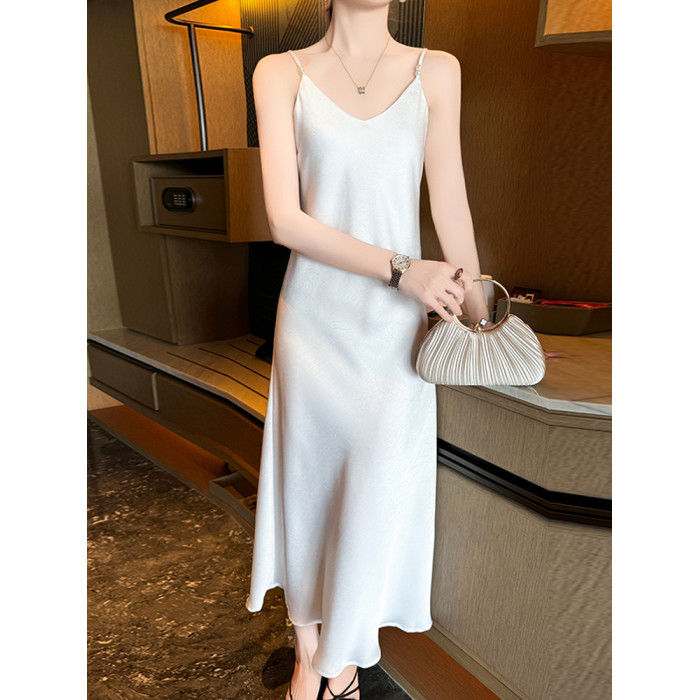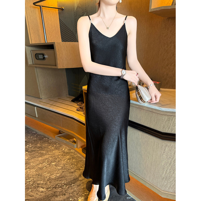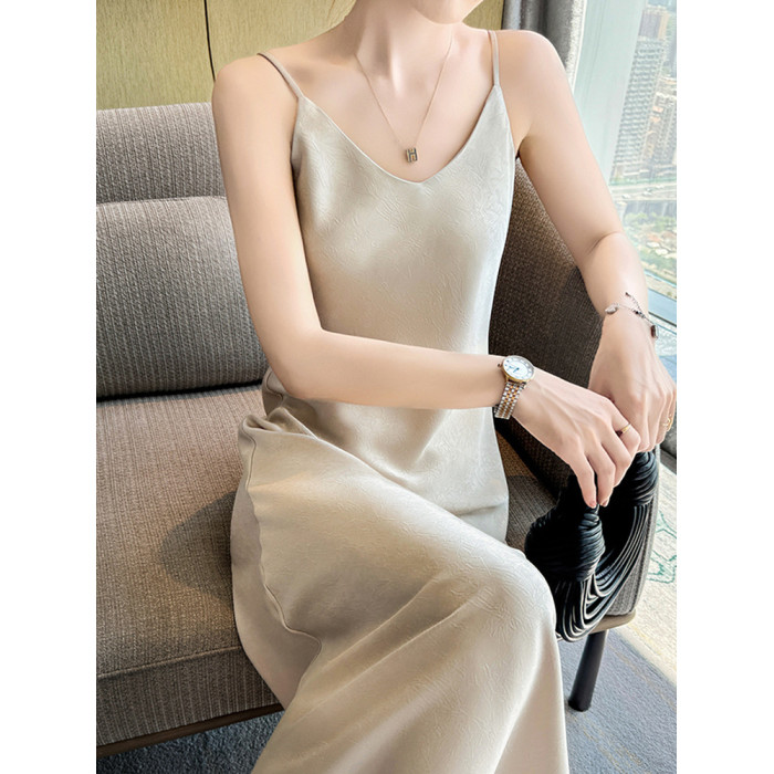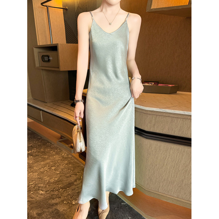 吊帶連衣裙女V領三醋酸緞面高級感真絲長裙氣質顯瘦桑蠶絲裙子新