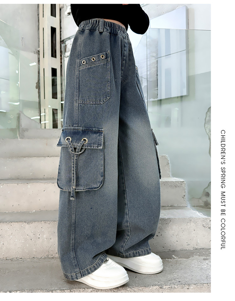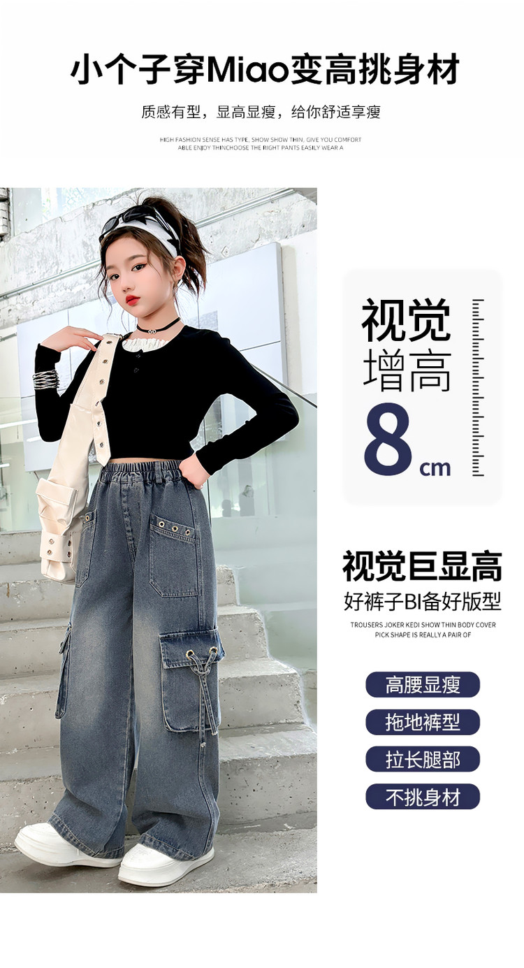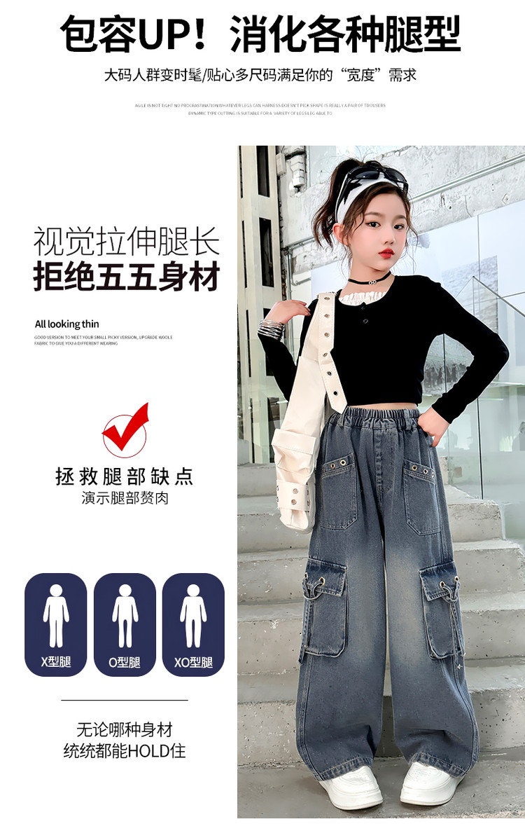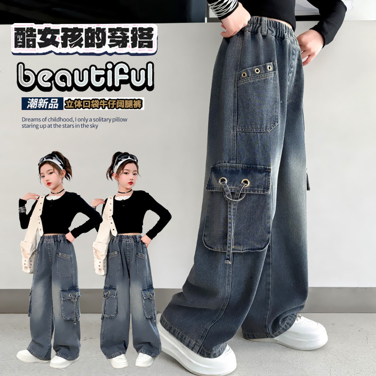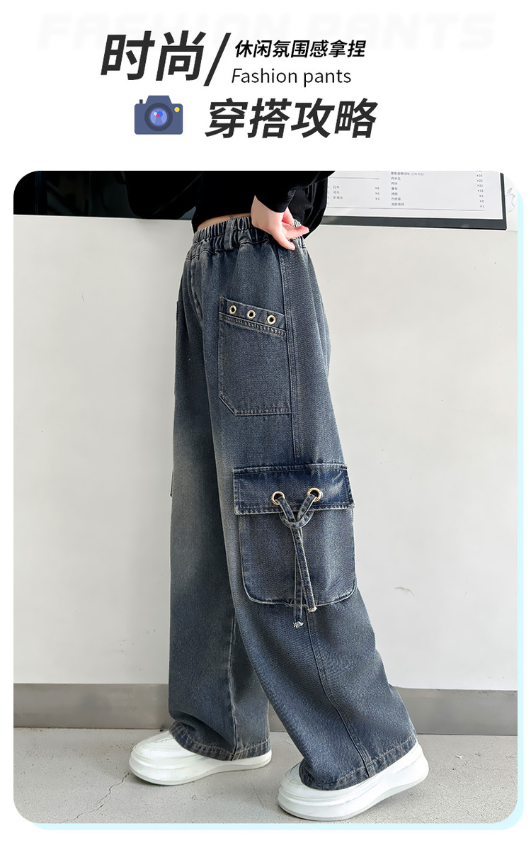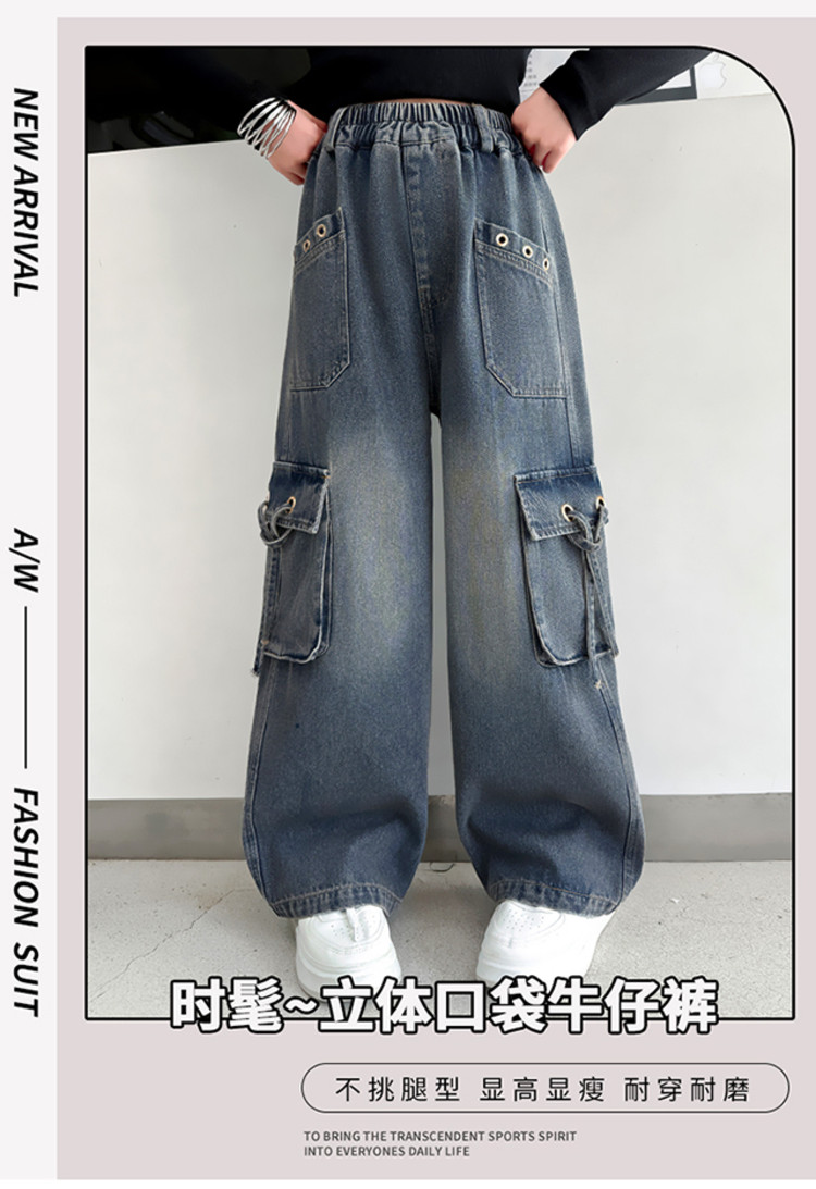 女童工裝褲春秋女大童春款牛仔褲潮酷寬松濶腿褲休閒春季兒童褲子