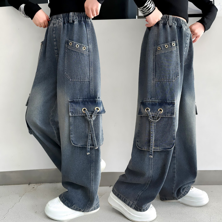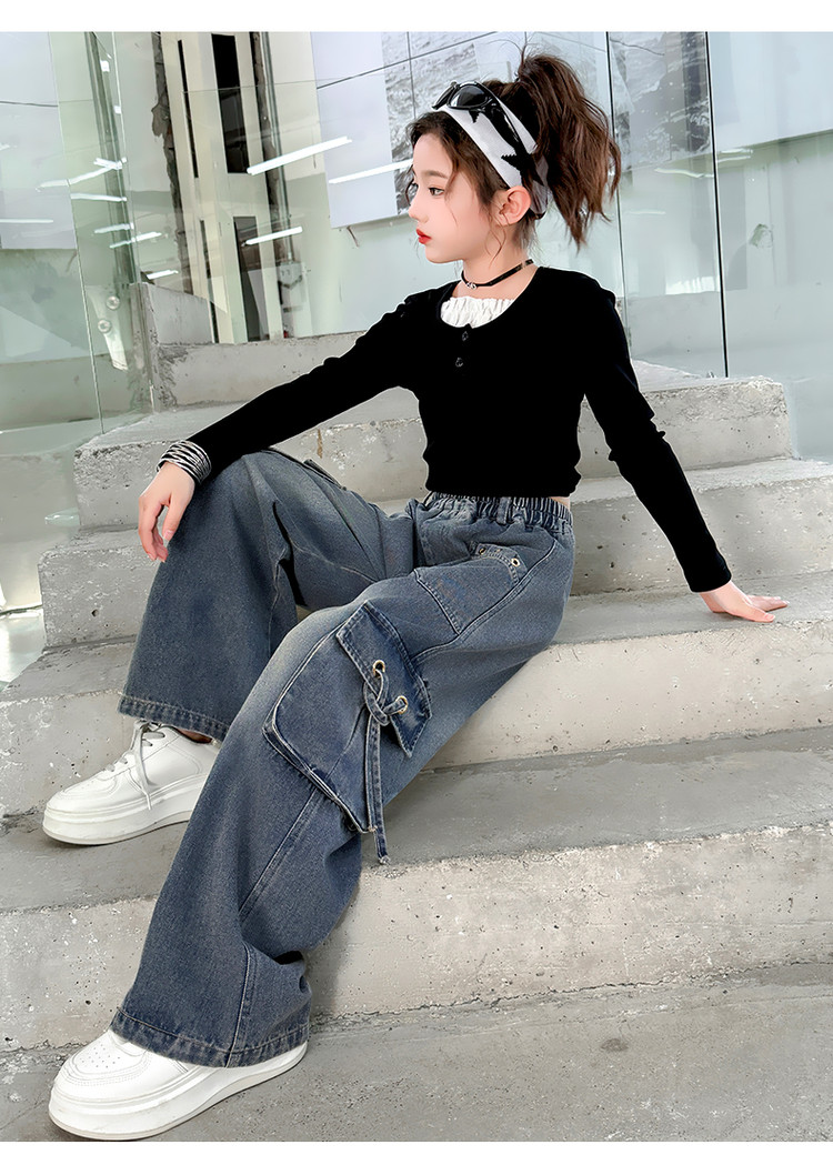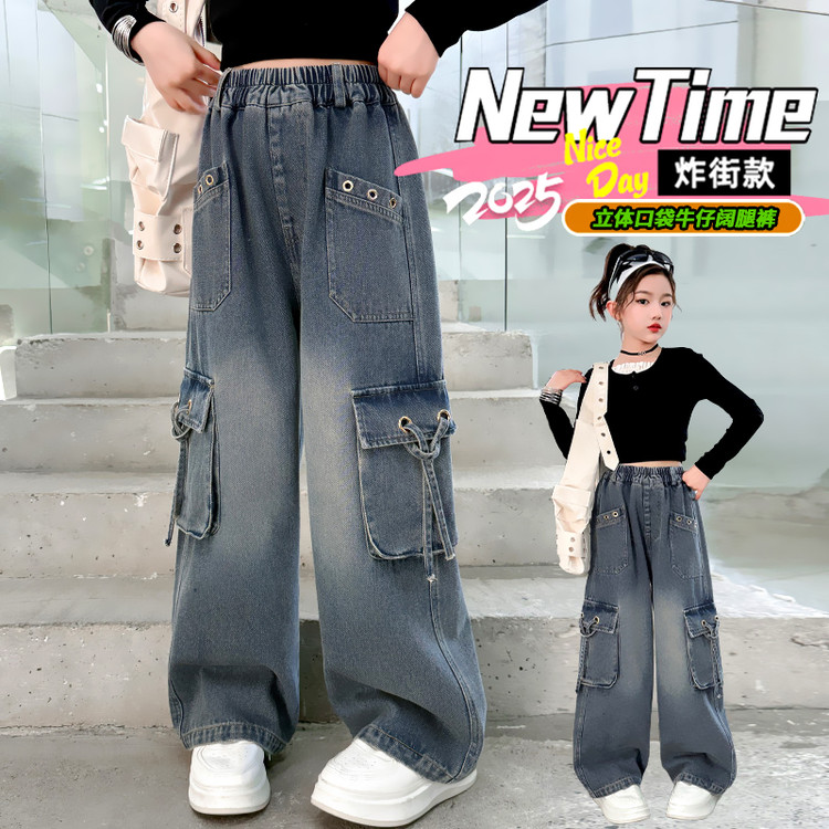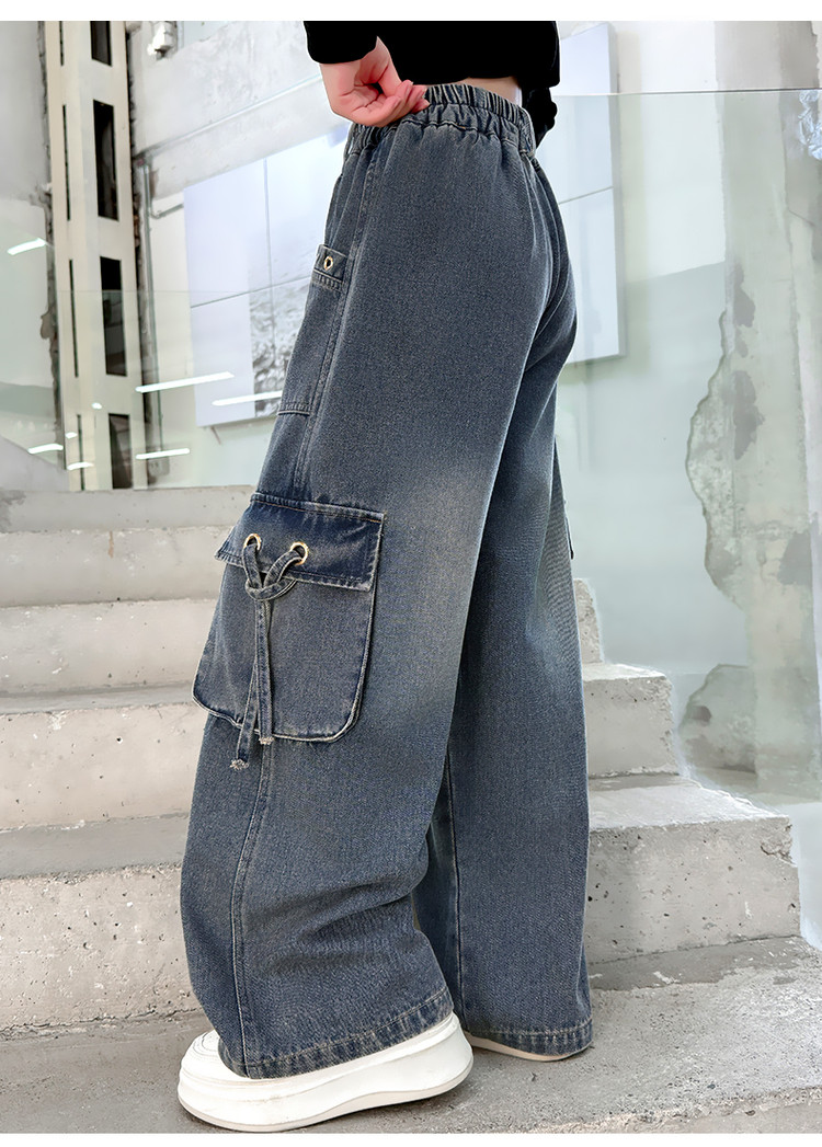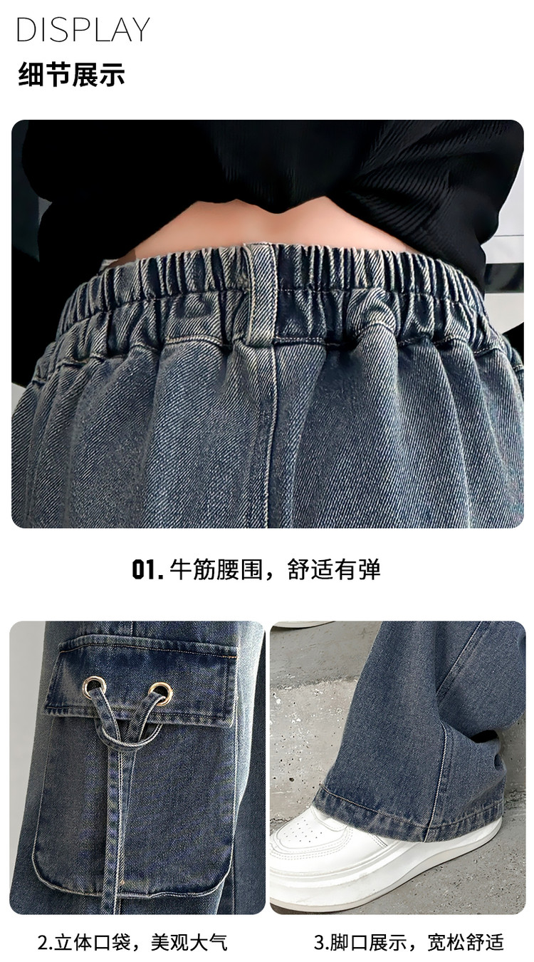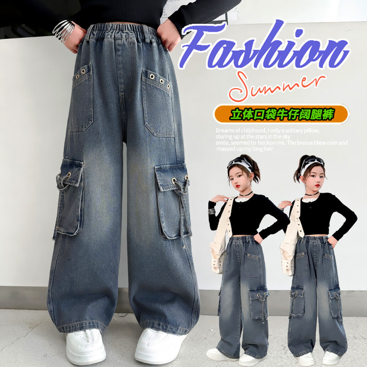 女童工裝褲春秋女大童春款牛仔褲潮酷寬松濶腿褲休閒春季兒童褲子