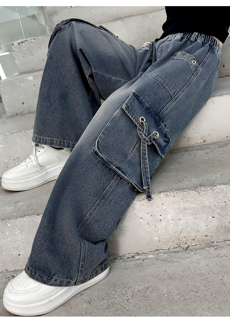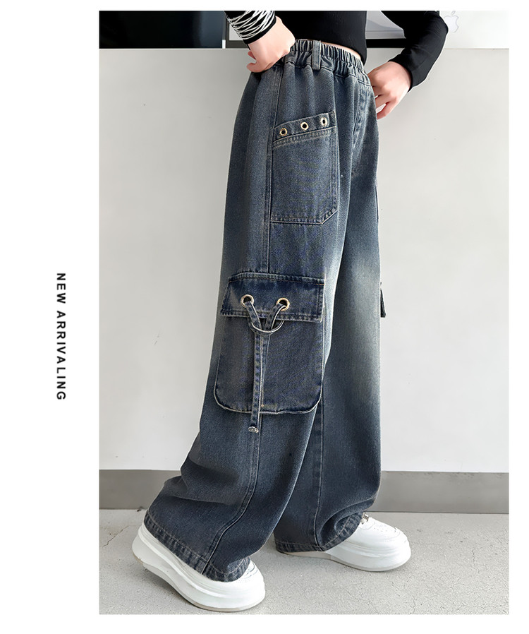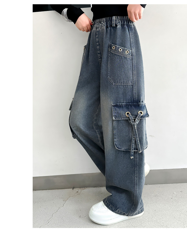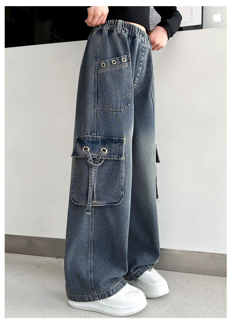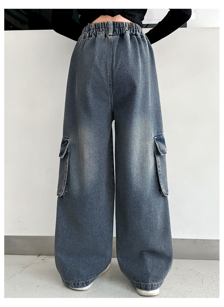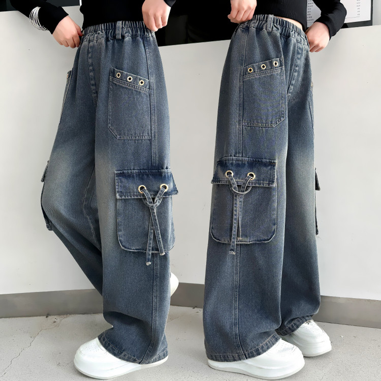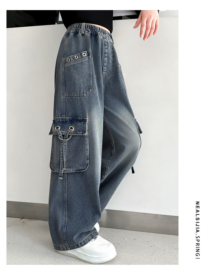 女童工裝褲春秋女大童春款牛仔褲潮酷寬松濶腿褲休閒春季兒童褲子