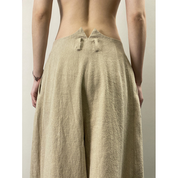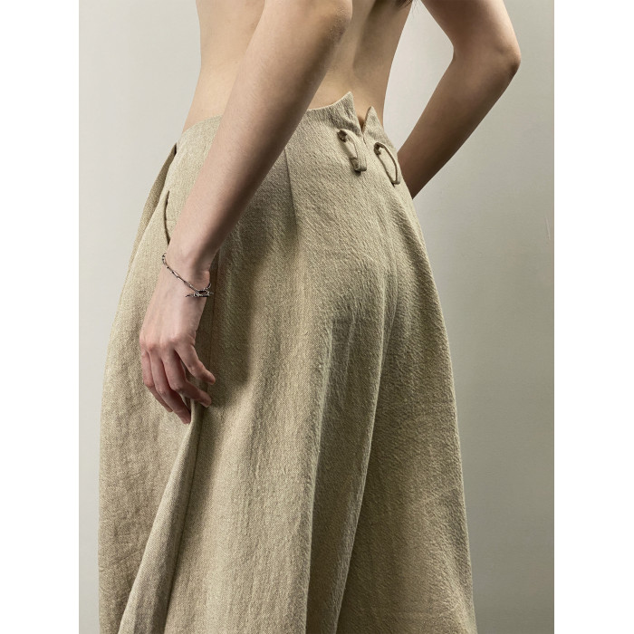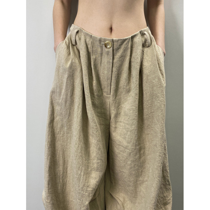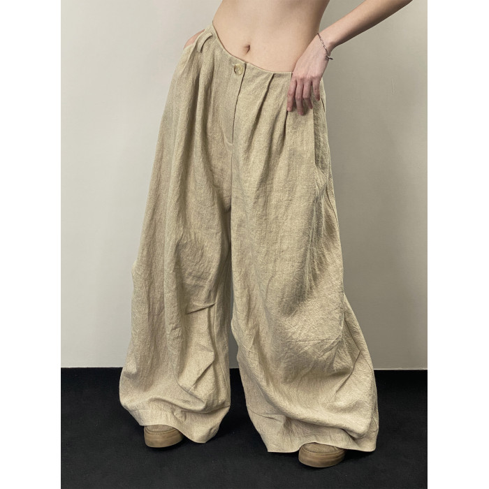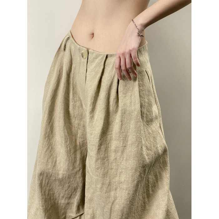 「 淩鴉ILNya 」月海_米黃 側褶彎月燈籠褲 亞麻廓形寬松濶腿褲