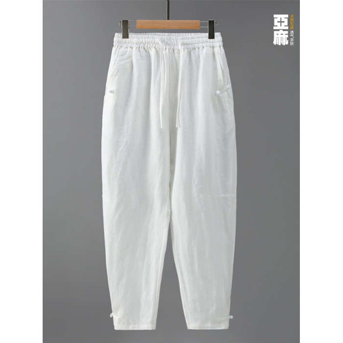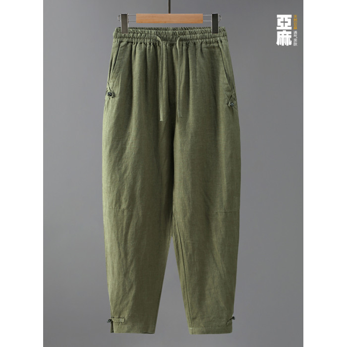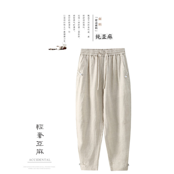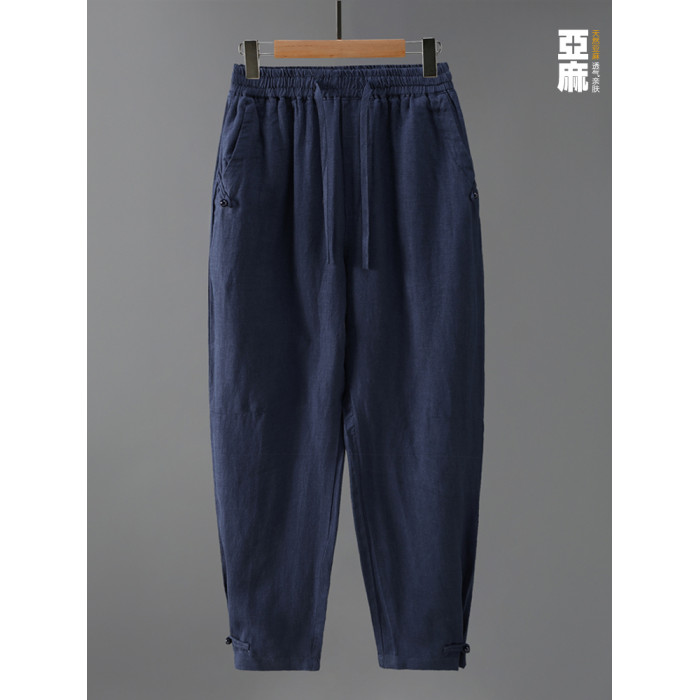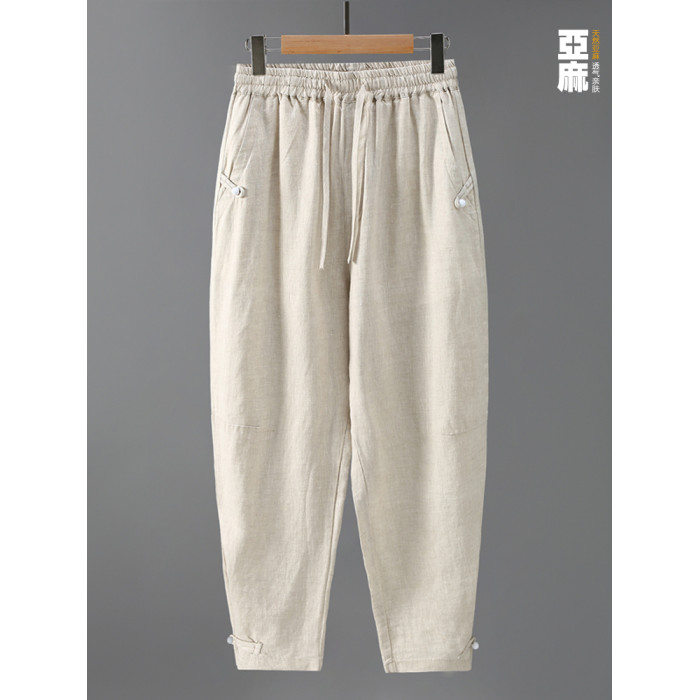高級純亞麻休閒褲男寬松濶腿褲風松緊腰小腳全麻復古布料長褲